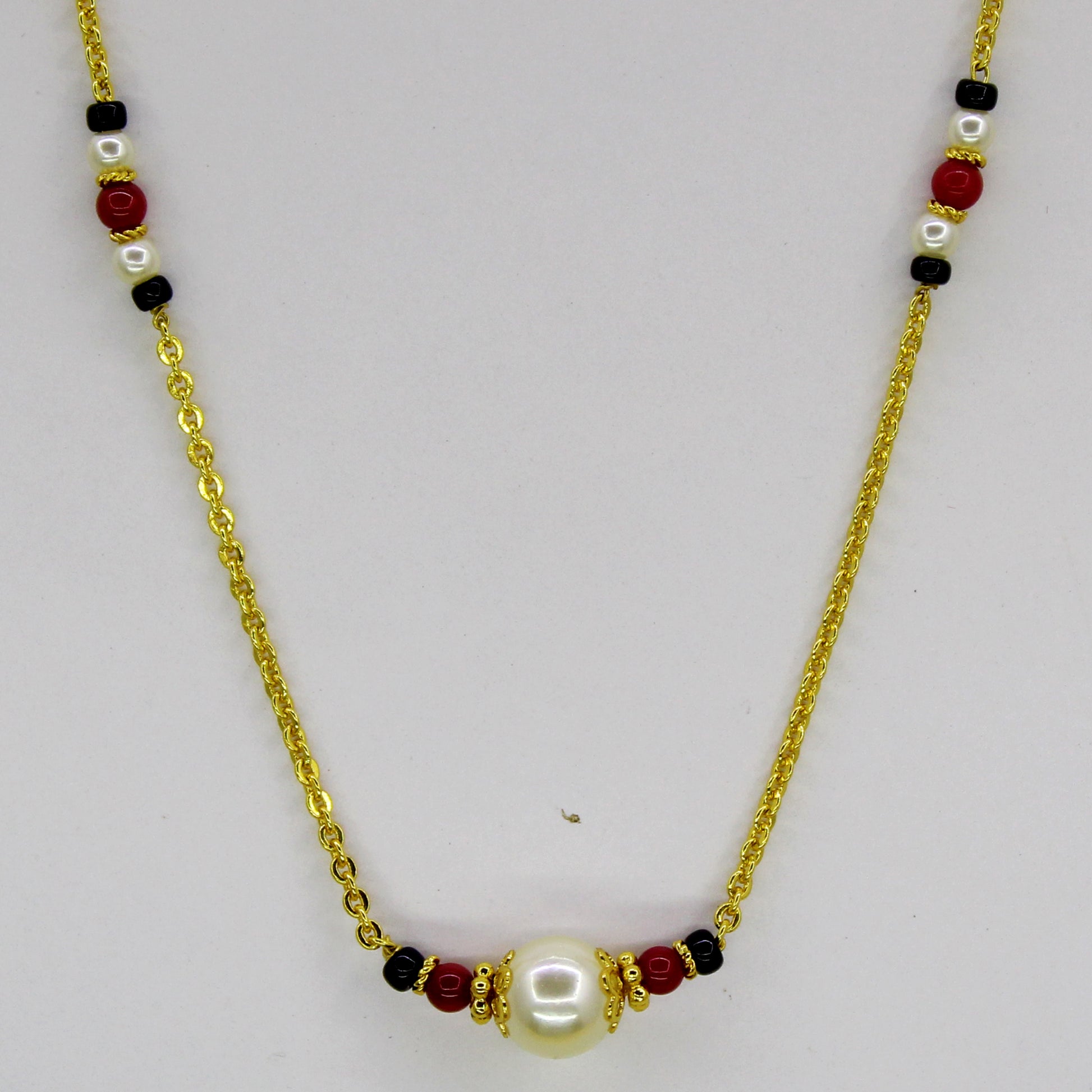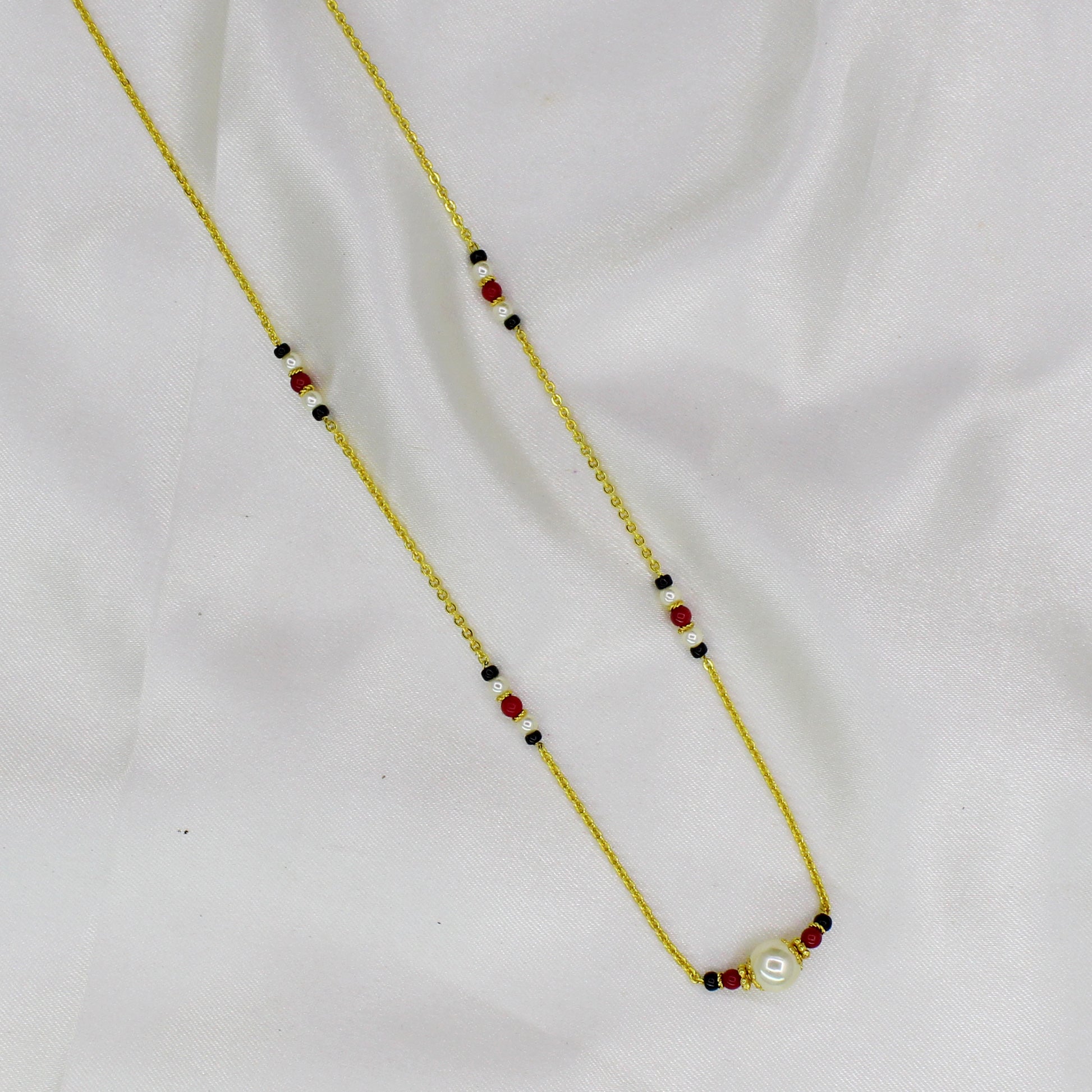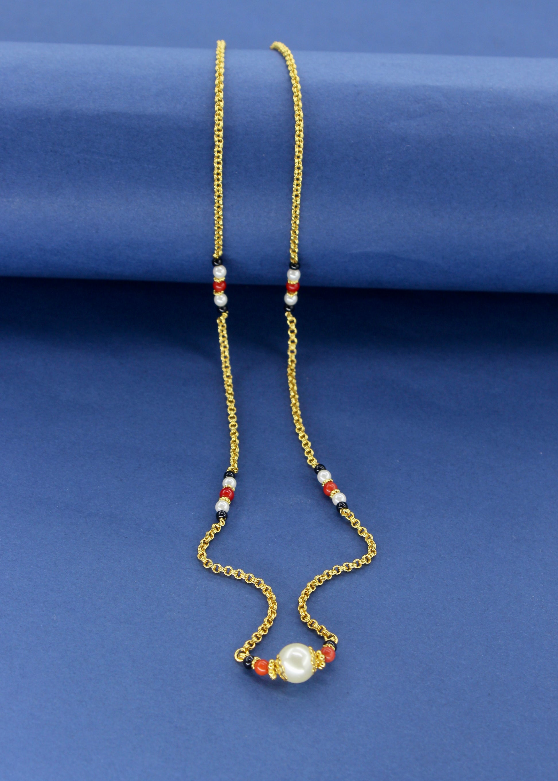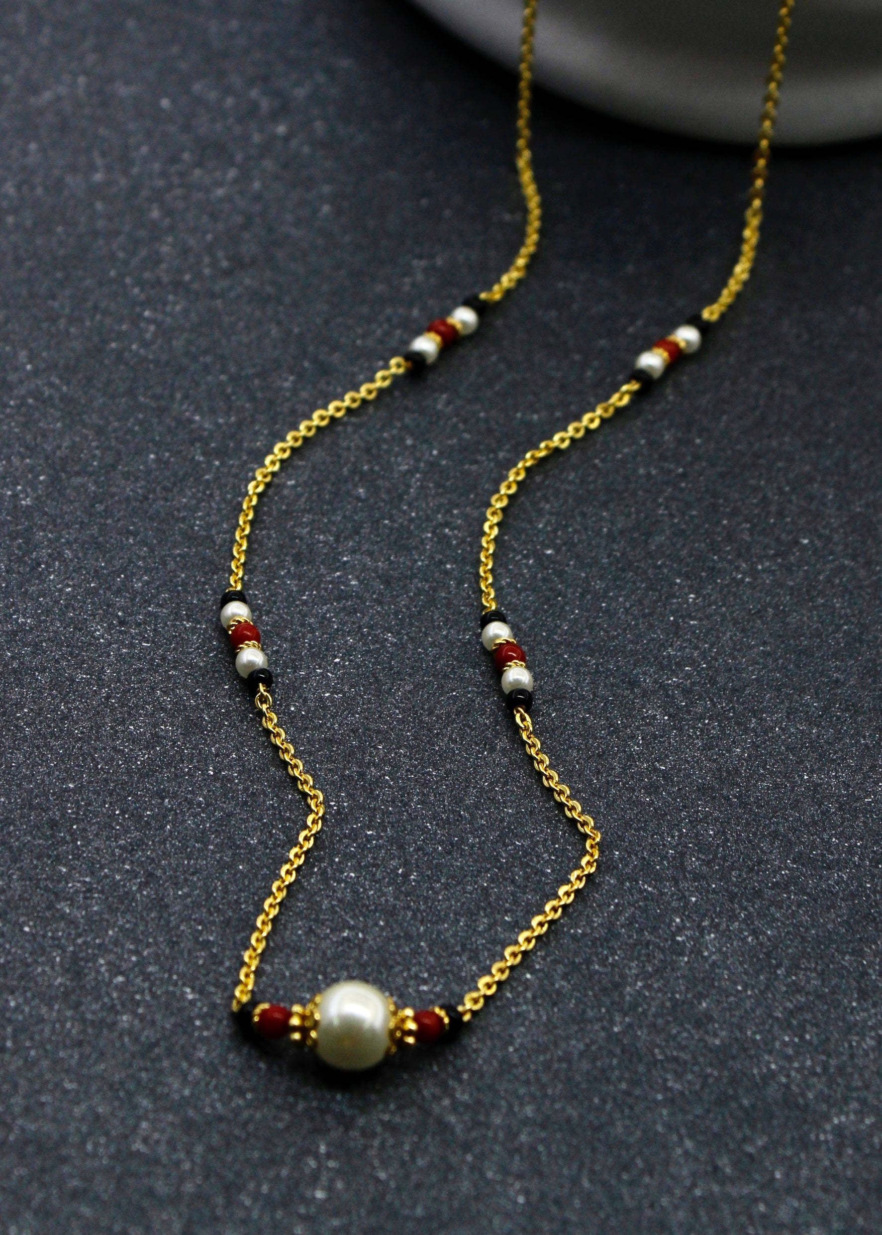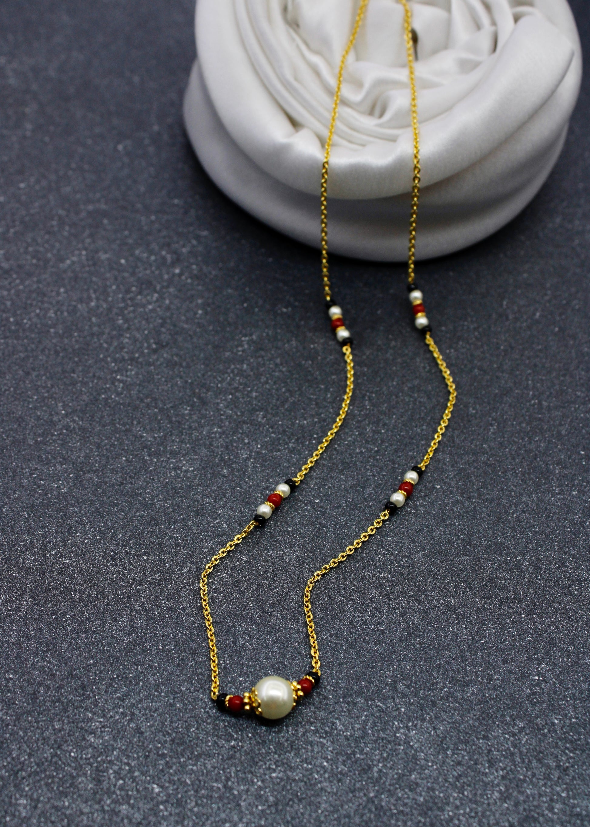 Married women will surely love to team this golden finish pearl beaded mangalsutra which is truly very appealing and beautiful. It is styled with maroon - black colour beads and fashioned from golden finish metal. This mangalsutra is high in quality and rust-resistant as well.