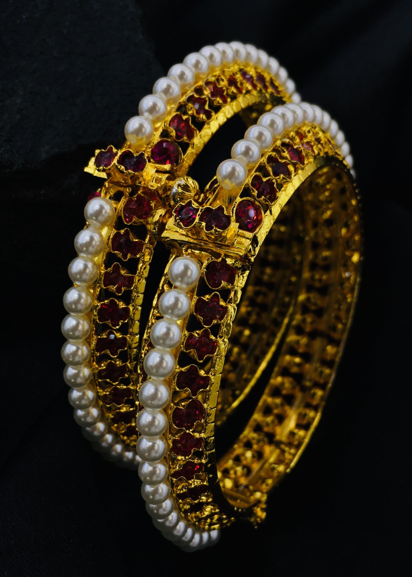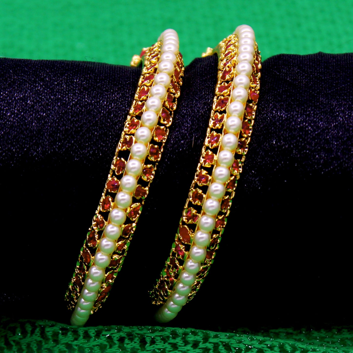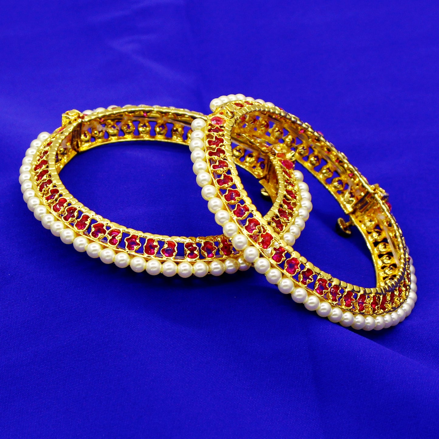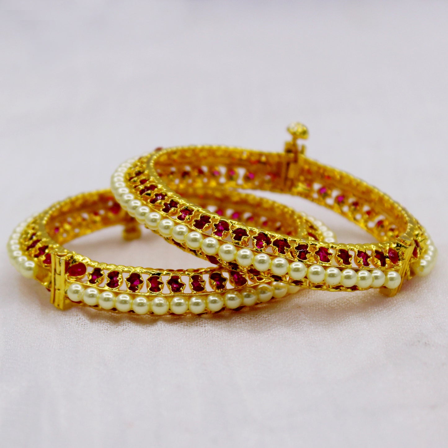 Match up this pair of pink colour classy bangles with your traditional saree. They are encrusted with pink ruby stones and woven with pearl beads. These bangles are made from golden finish metal and ensure skin-friendliness. You can wear these Puneri moti tode easily as they are open-able.