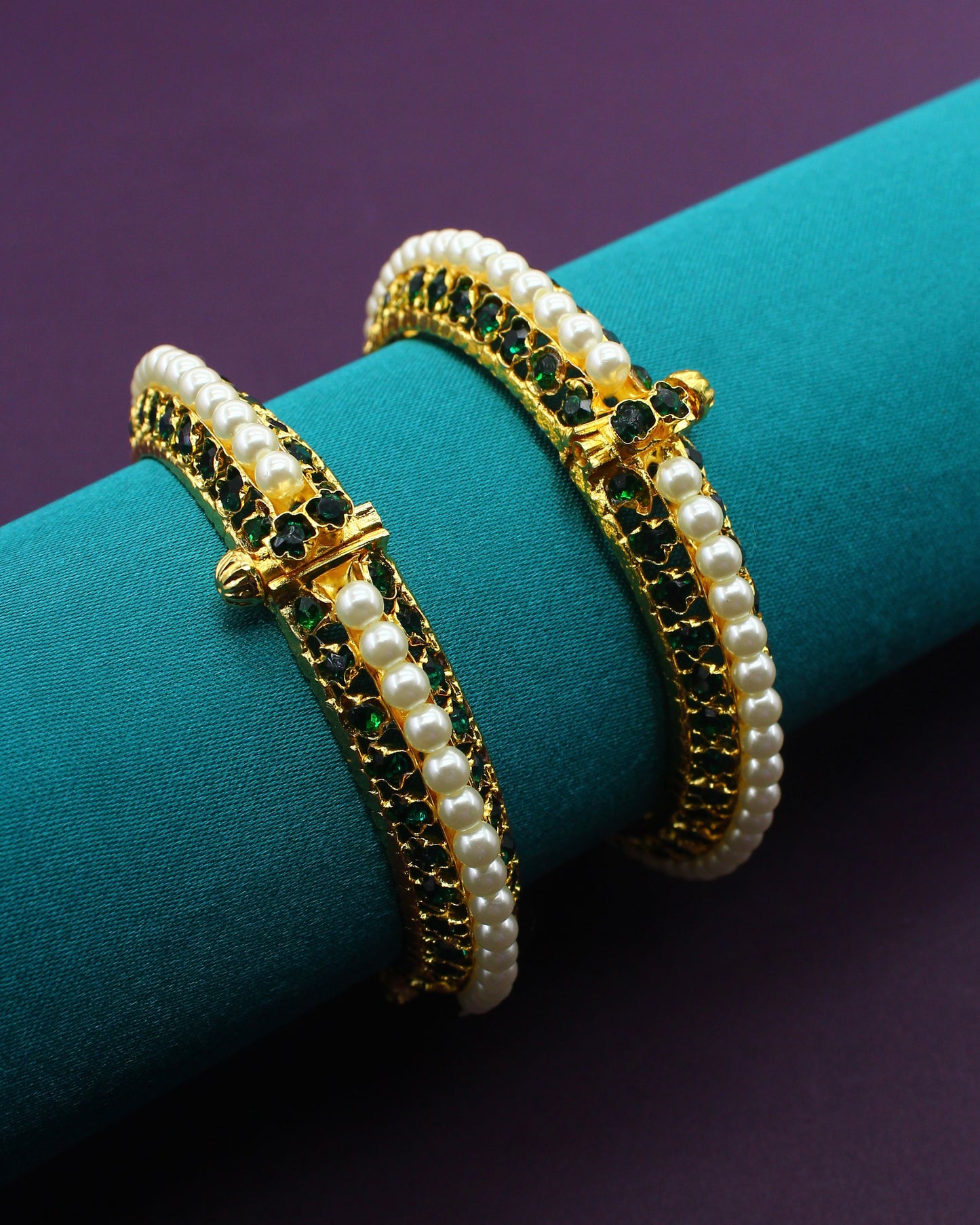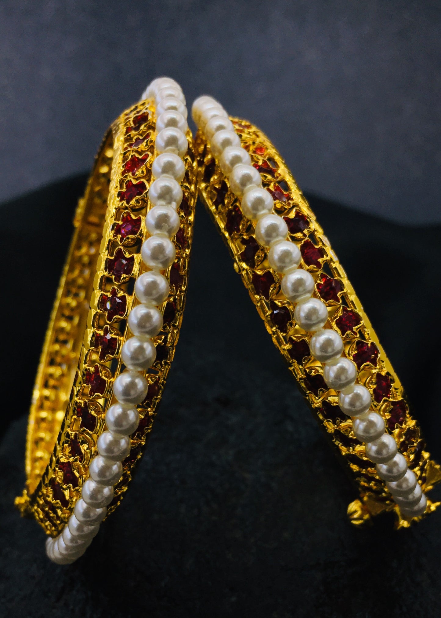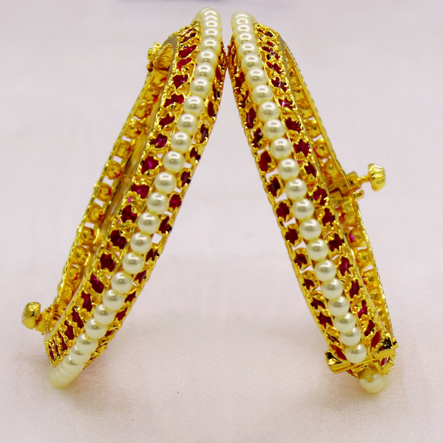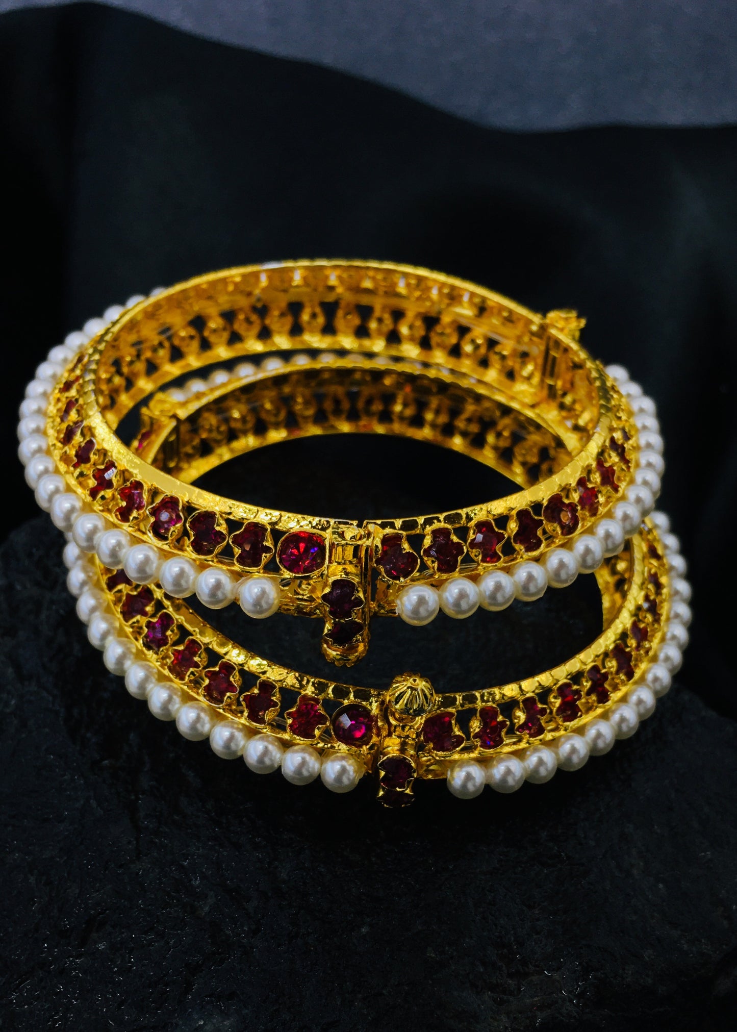 Match up this pair of pink colour classy bangles with your traditional saree. They are encrusted with pink ruby stones and woven with pearl beads. These bangles are made from golden finish metal and ensure skin-friendliness. You can wear these Puneri moti tode easily as they are open-able.