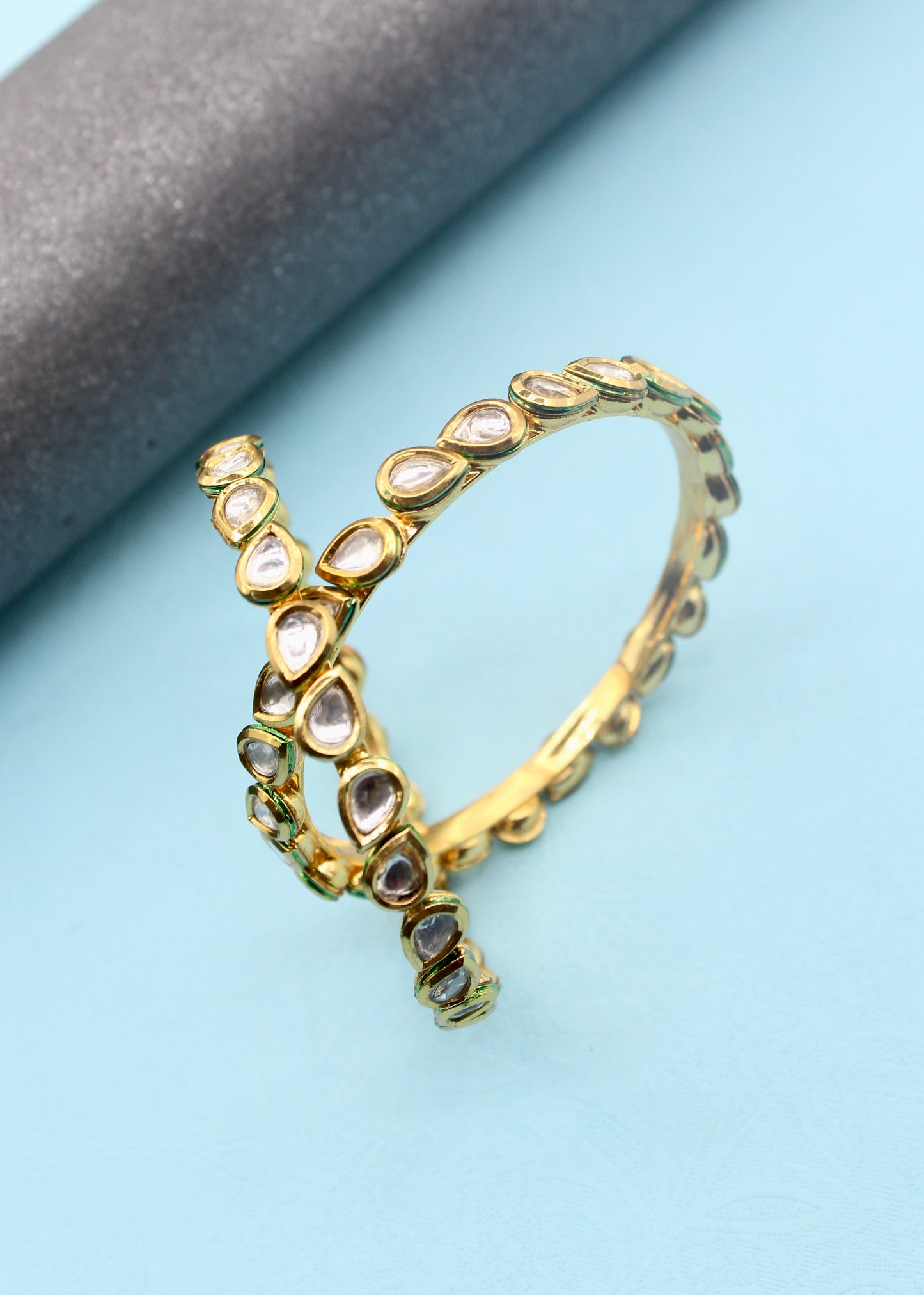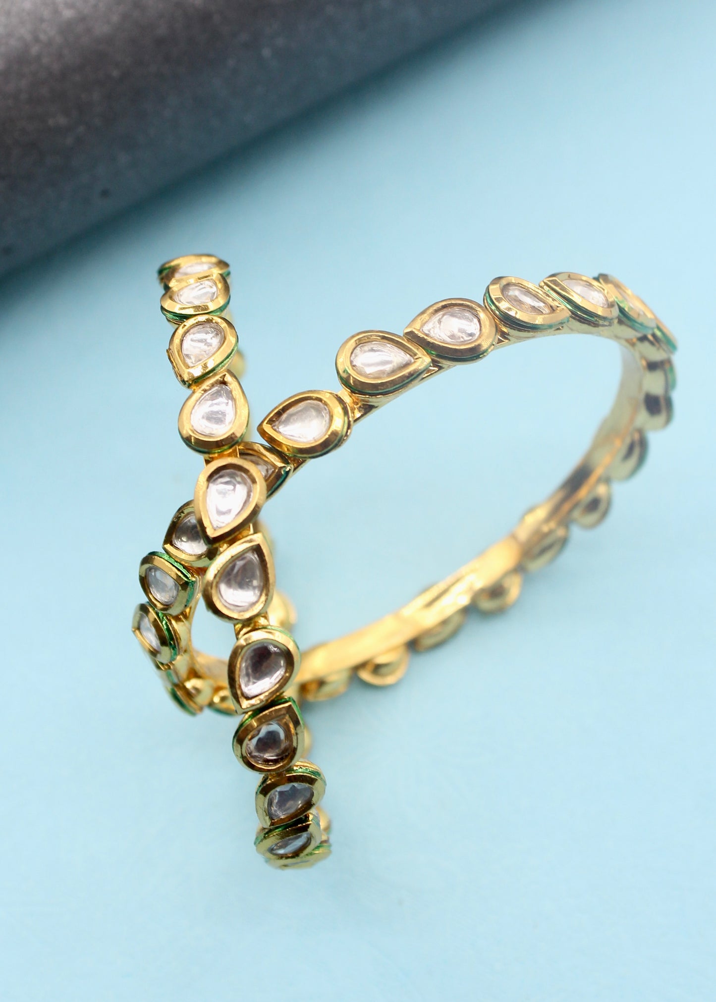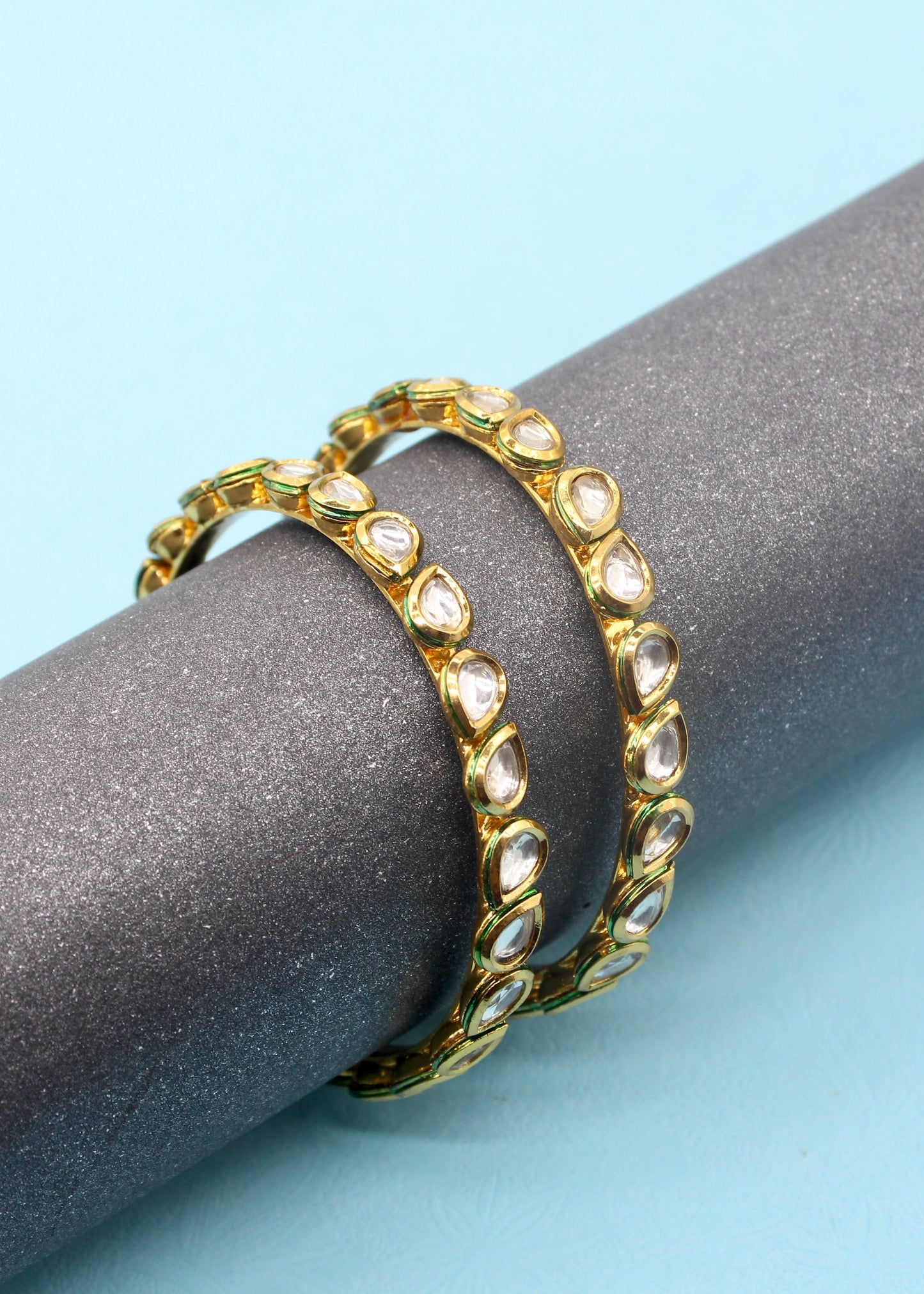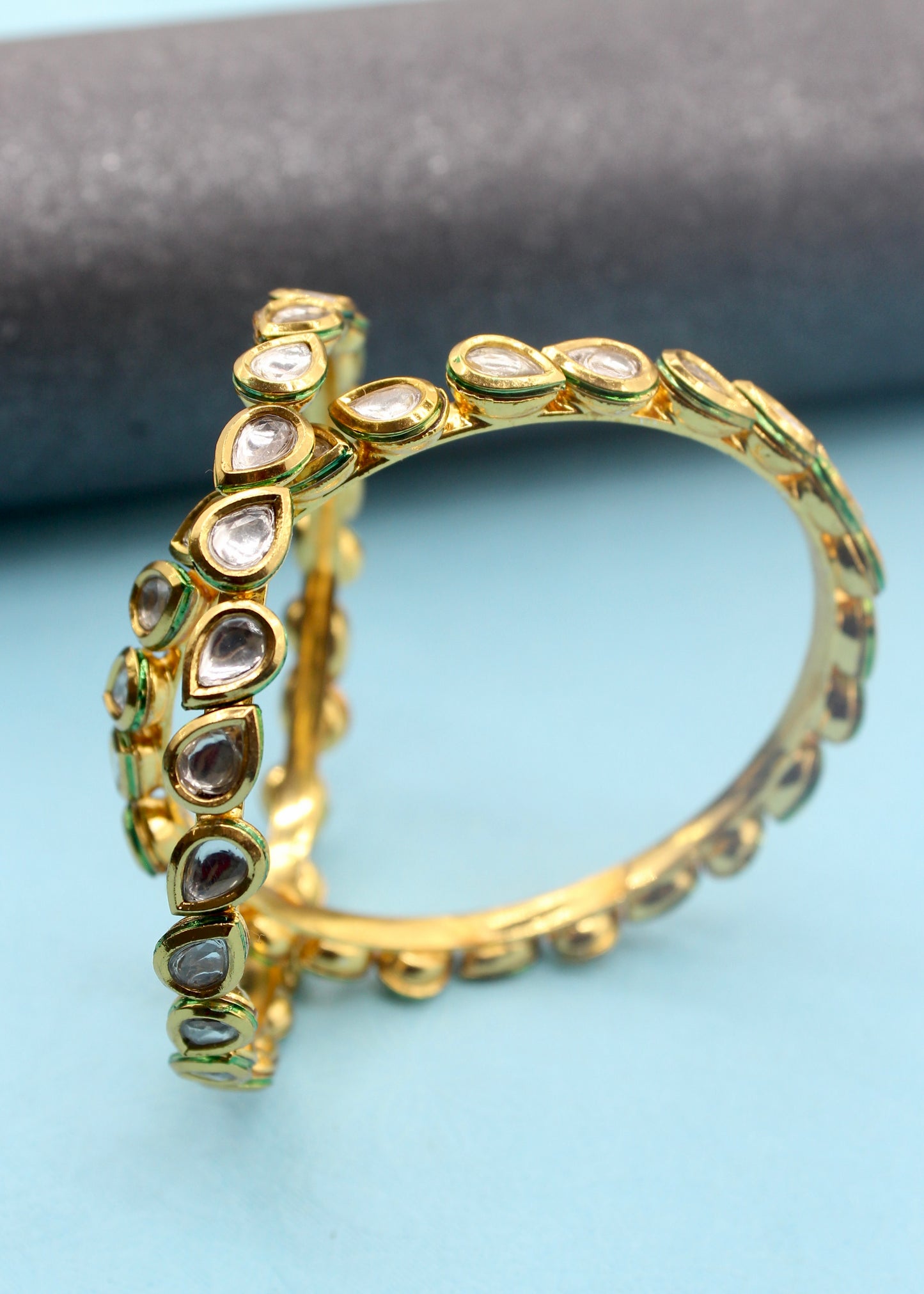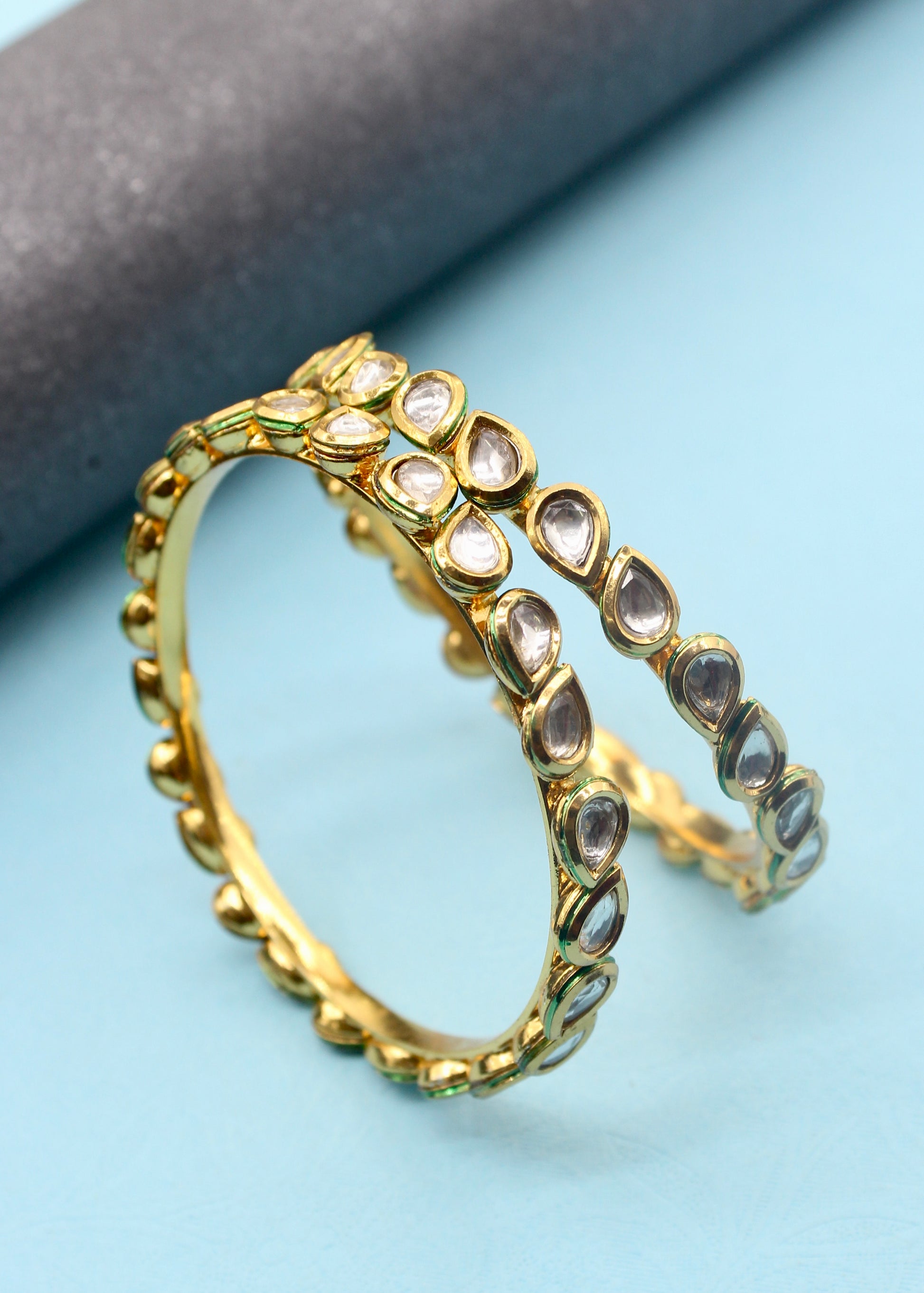 Add extra elegance to your appearance by adorning this appealing bangles with your matching costumes. These are encrusted with sparkling white stones and has excellent design. These appealing bangles are fashioned from golden finish metal and ensures high durability.