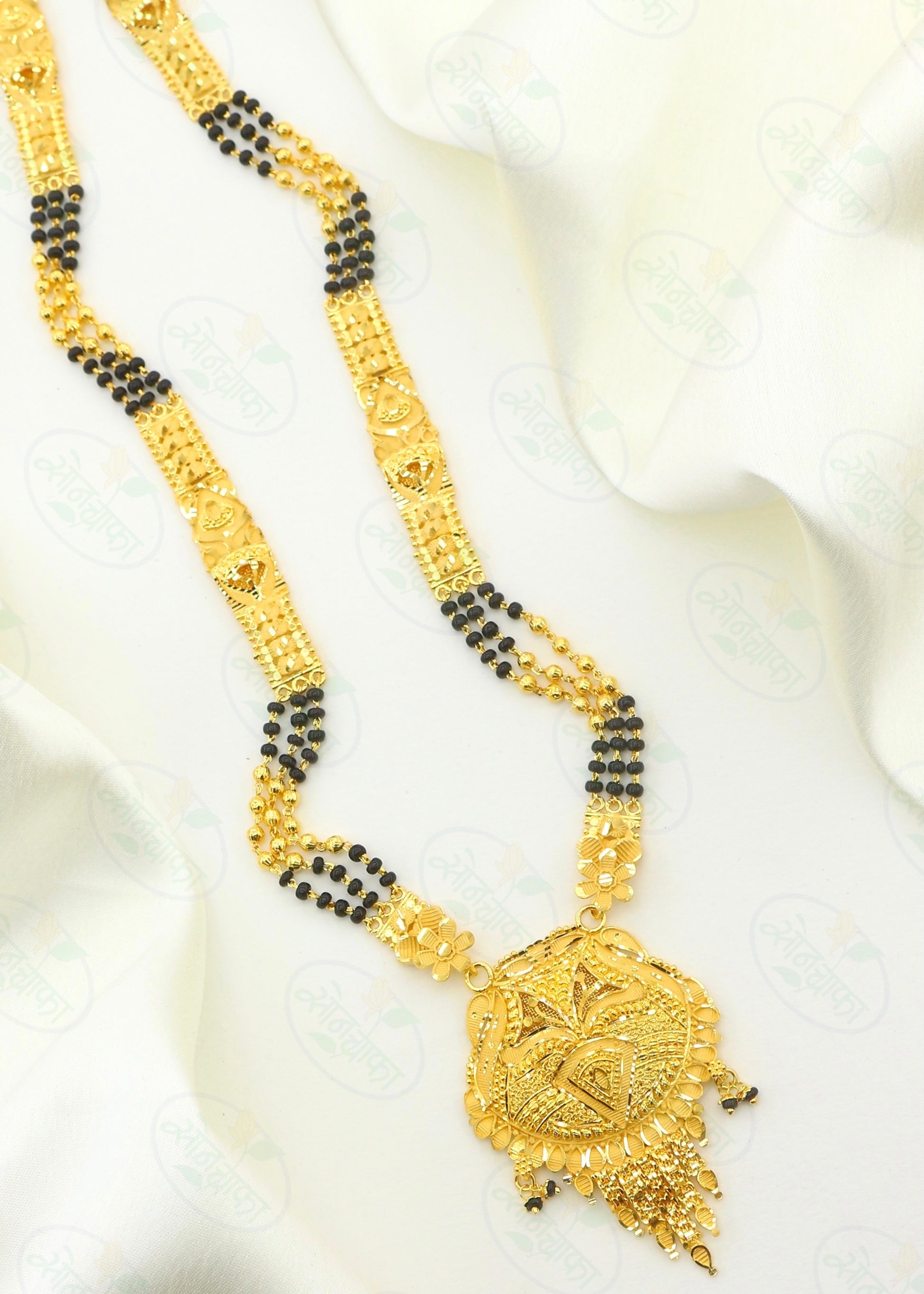 Flower inspired 1 gram gold plated mangalsutra from Sonchafa Jewellery is best pick for modern women like you. The flower pendant feature flawless golden work and woven with black colour beads. This short mangalsutra is easy to use and comfortable to hold all day long.