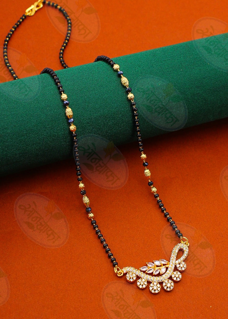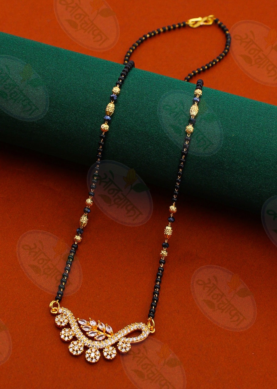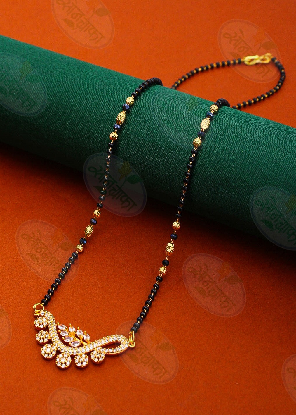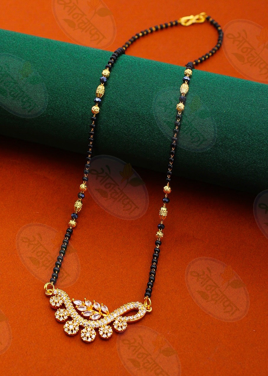 Checkout this beautiful rays designer gold mangalsutra from Sonchafa Jewellery which is truly very elegant and attractive. The pendant studded with dia diamond stones and feature flawless work. In addition the pendant has droplet design is attached to single layer black beads chain and it is made from golden finish metal.