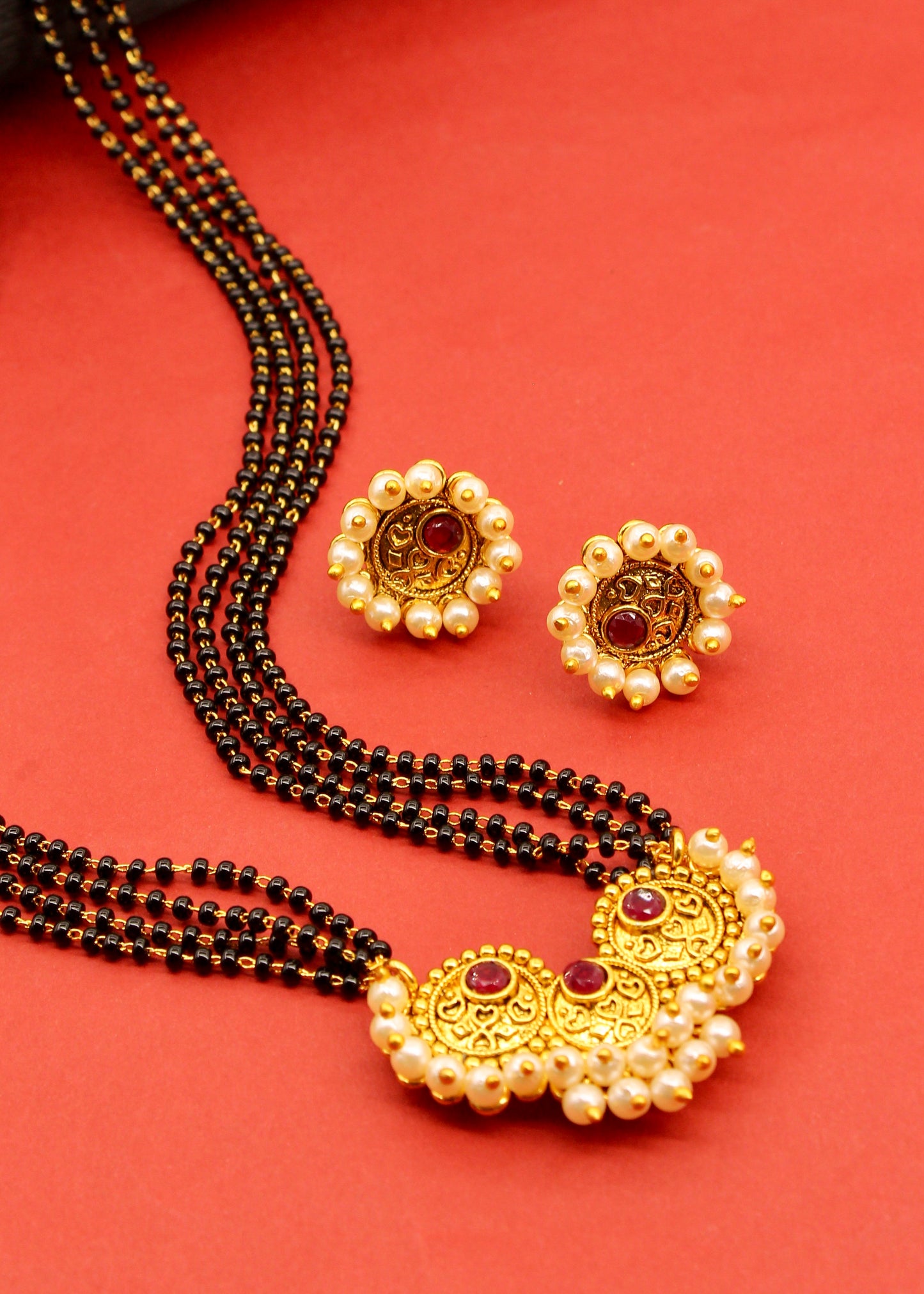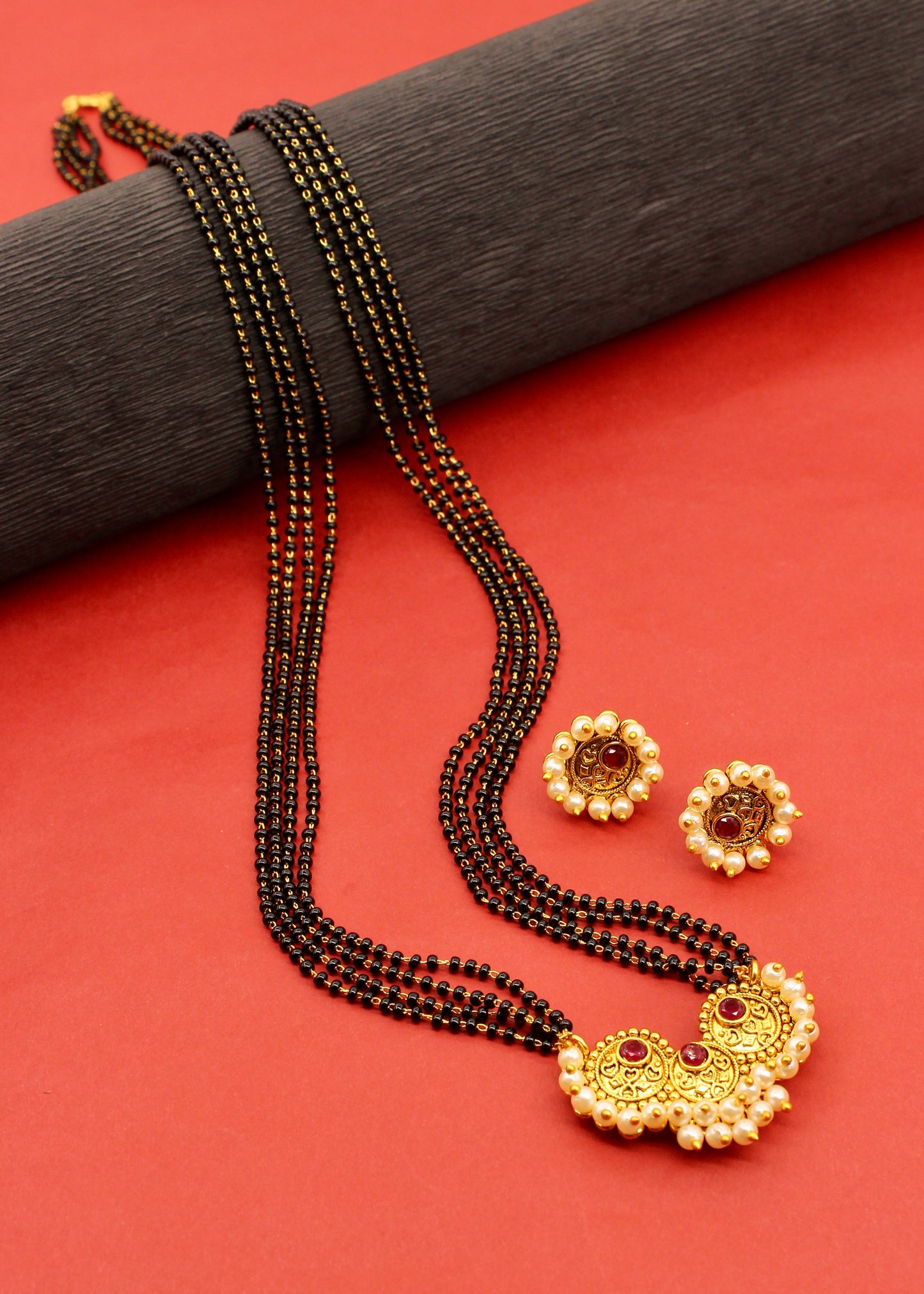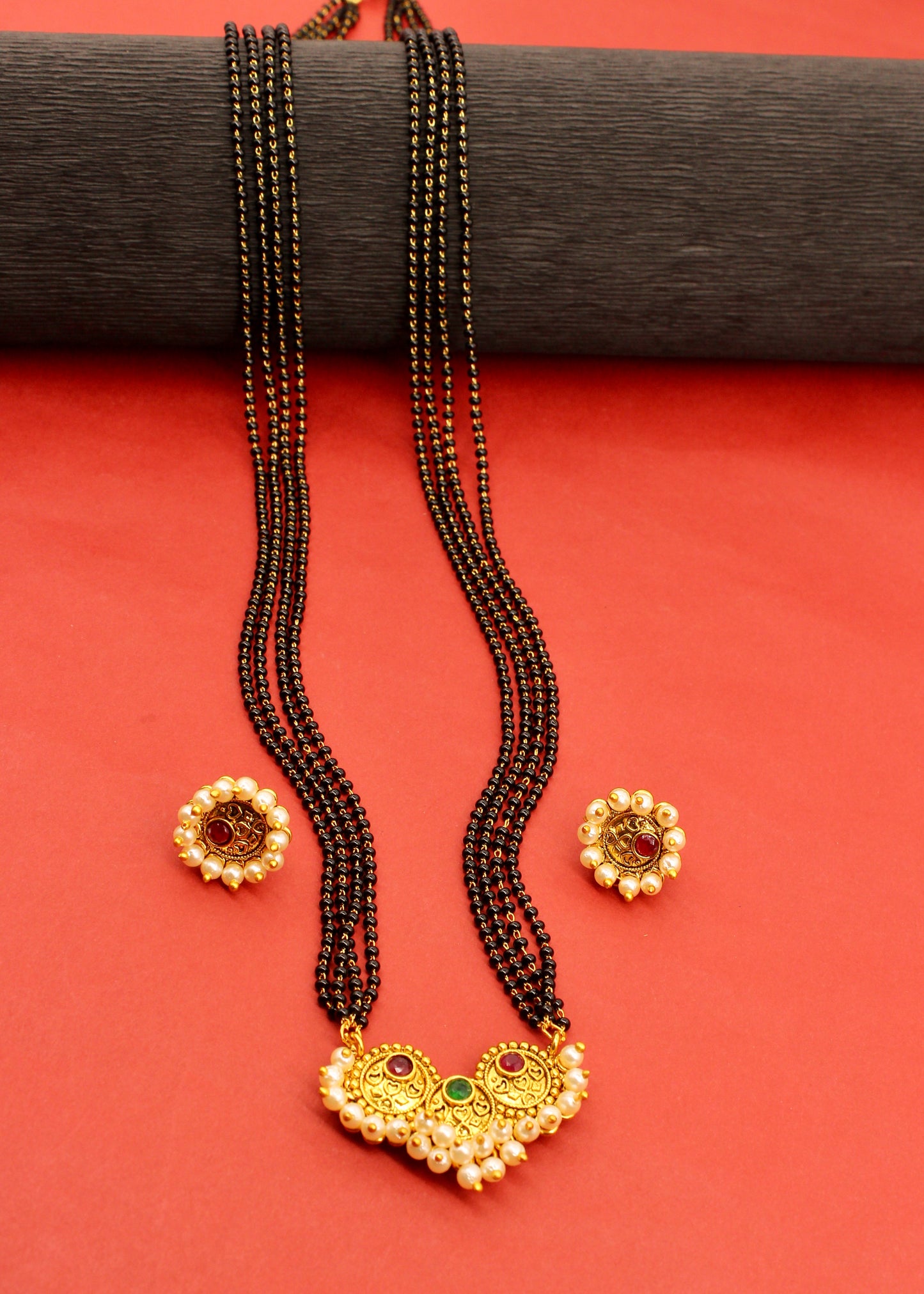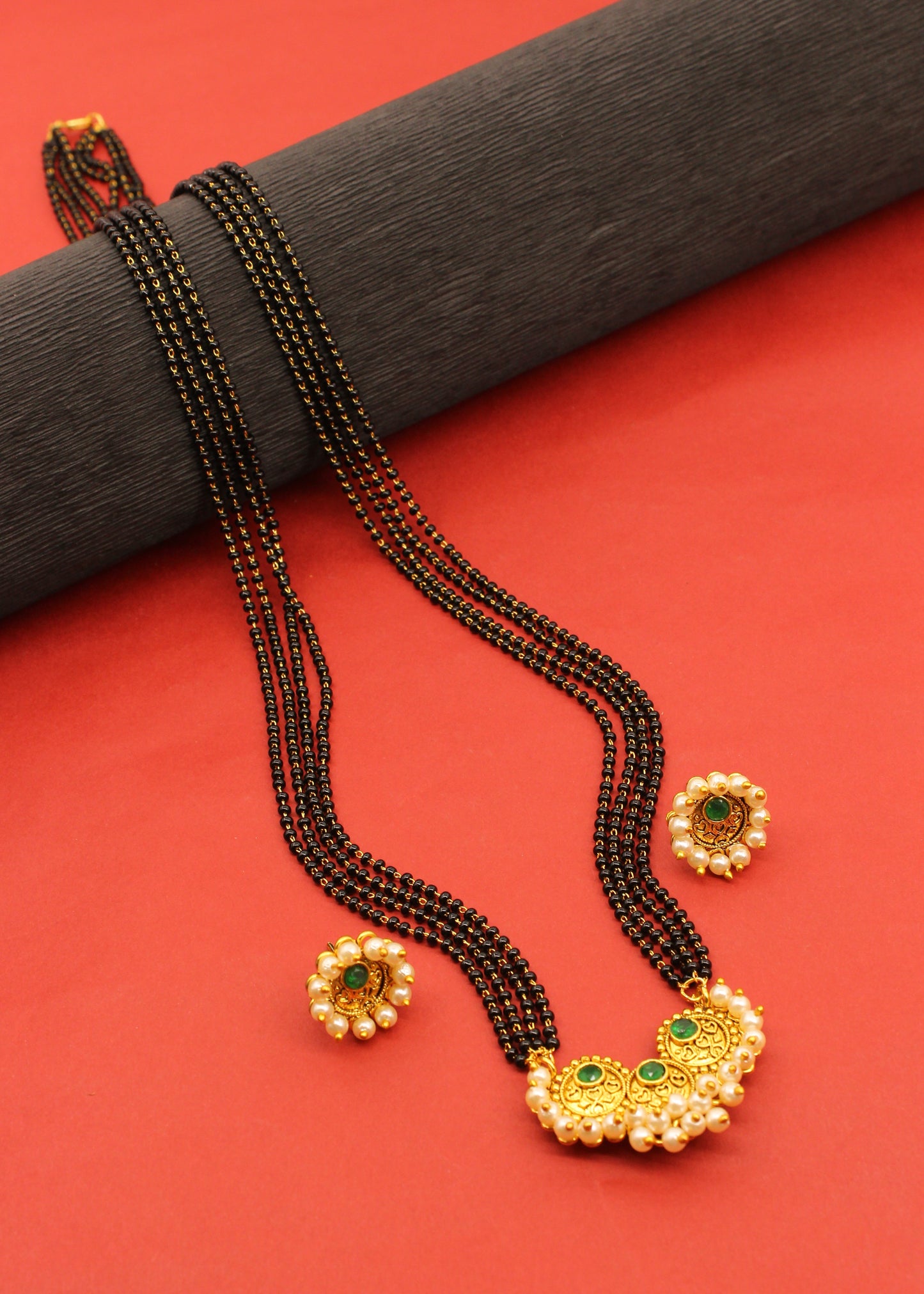 Buy something stylish for yourself in the form this beautiful mangalsutra set from Sonchafa Jewellery. It is styled with studded pink, green stone and made from golden finish metal along with pearl, golden beads. This classy mangalsutra set has attachment of multi layer of black beaded chain.