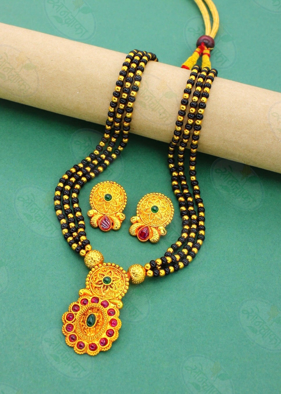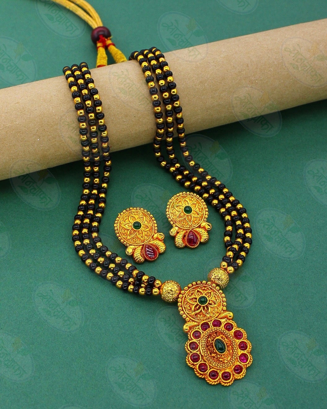 Complete your Maharashtrian look by clubbing this Floral adorable mangaslutra with your paithani saree from Sonchafa Jewellery. The three layer black beaded chain is styled with pink stones. This Mangalsutra is easy to wear and comfortable to hold all day long.