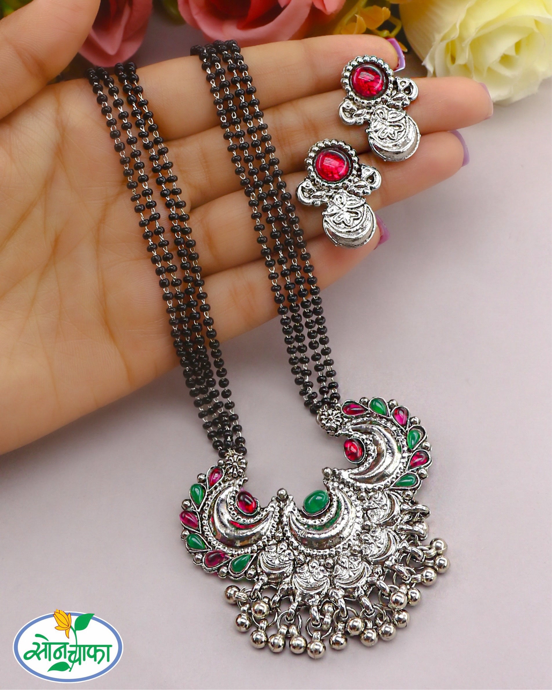 Attractive oxidised Floral designer short mangalsutra for women from Sonchafa Jewellery. It is wonderfully woven with black beads in double layer black beaded chain attached with studded pink, green stone designer pendant. This beautiful designer mangalsutra will surely give you attractive look and it is superior in quality.