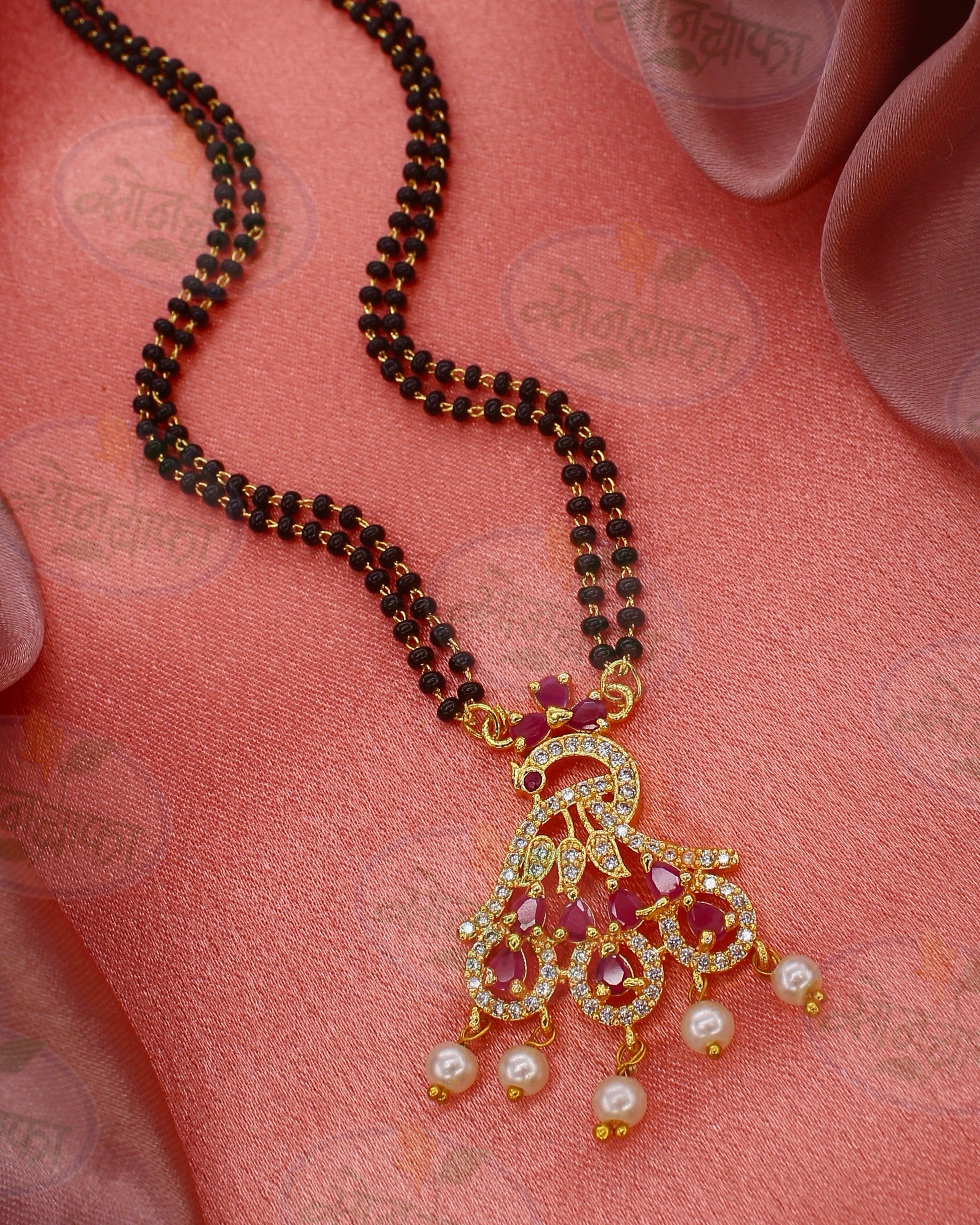 Amazingly attractive and beautiful this adorable mangalsutra set from Sonchafa Jewellery will blow your heart at very first look. It is encrusted with pink, green stone and made from golden finish metal along with pearl beads. This set will fetch you lots of compliments from onlookers for your amazing choice.