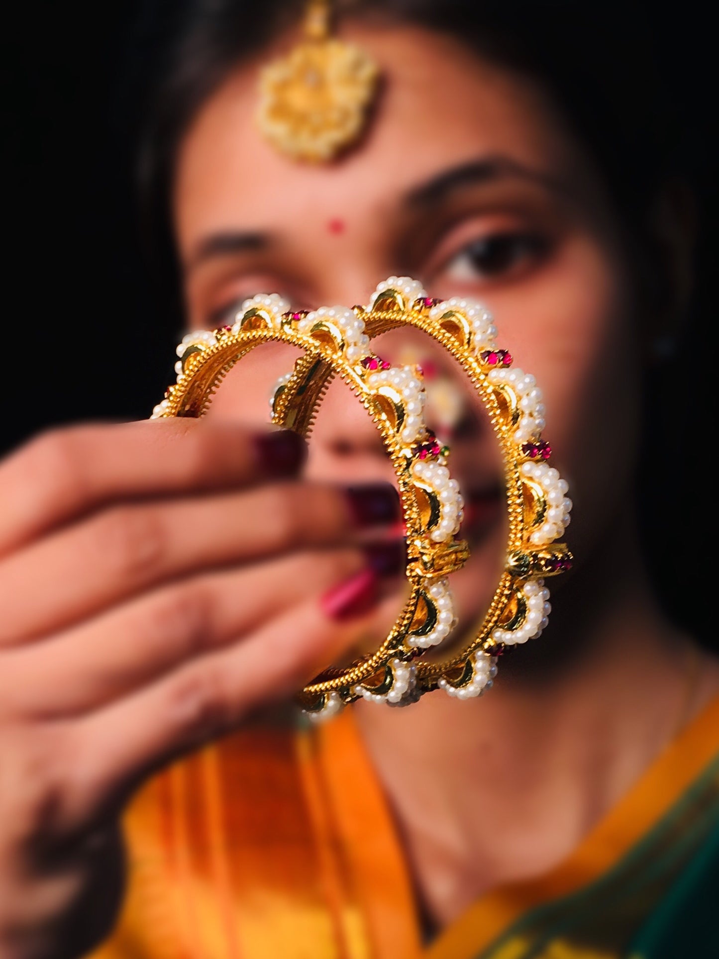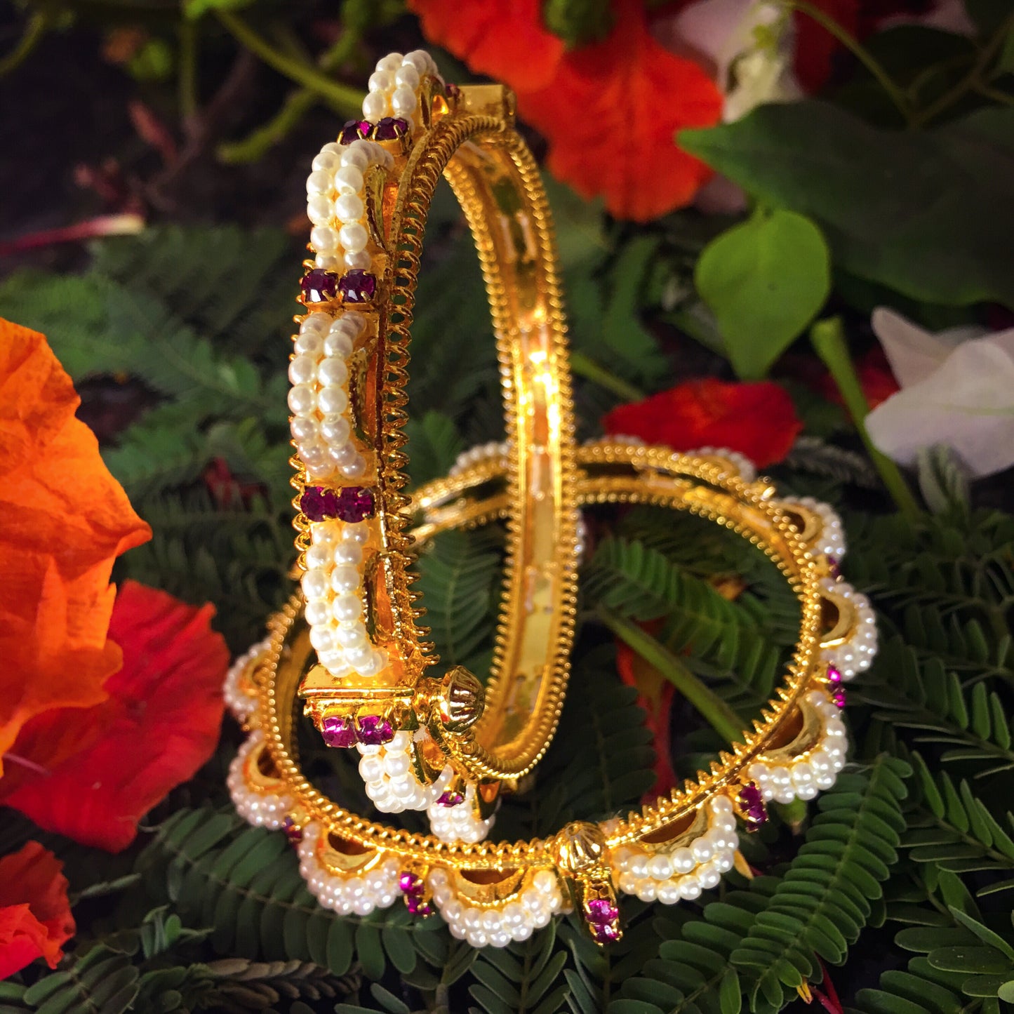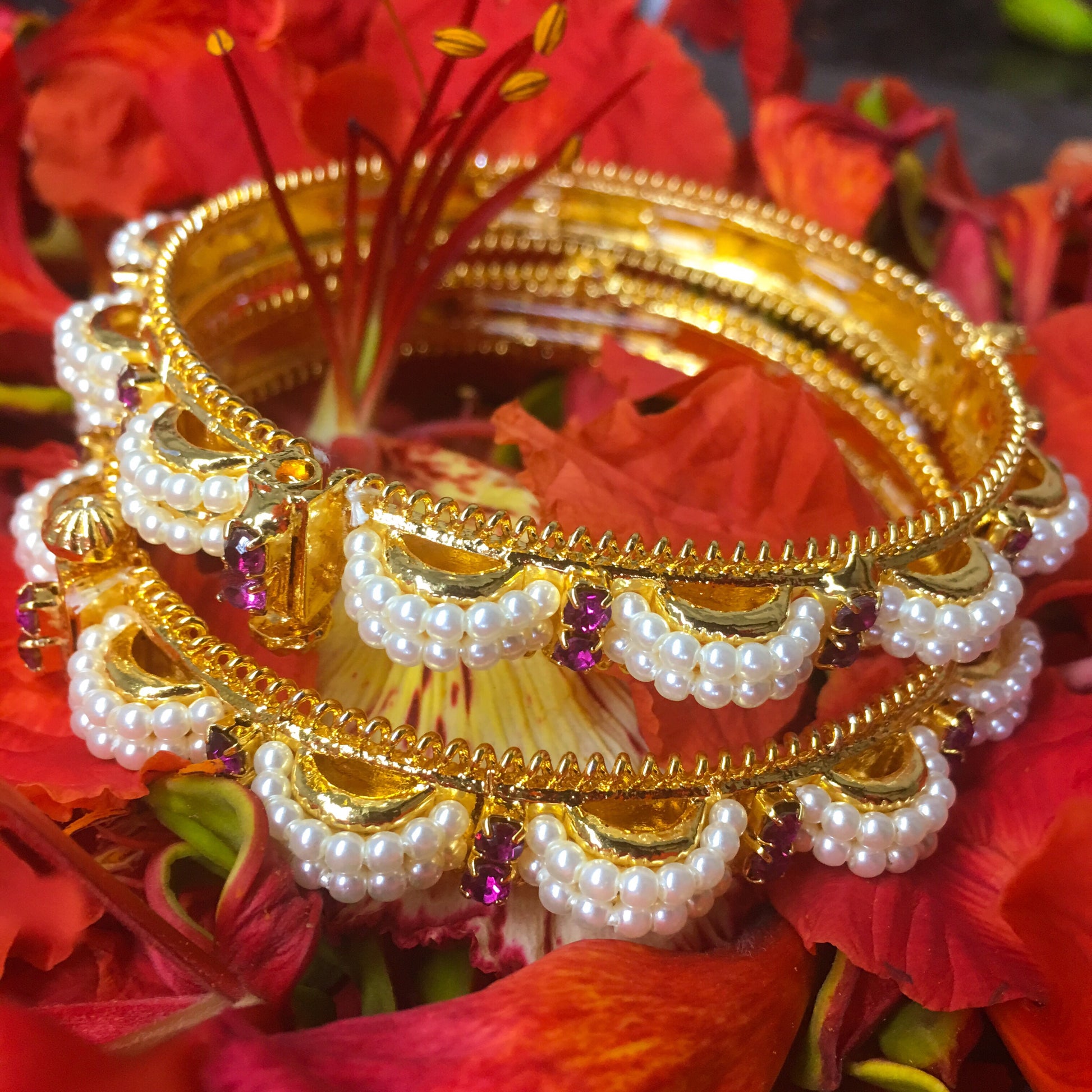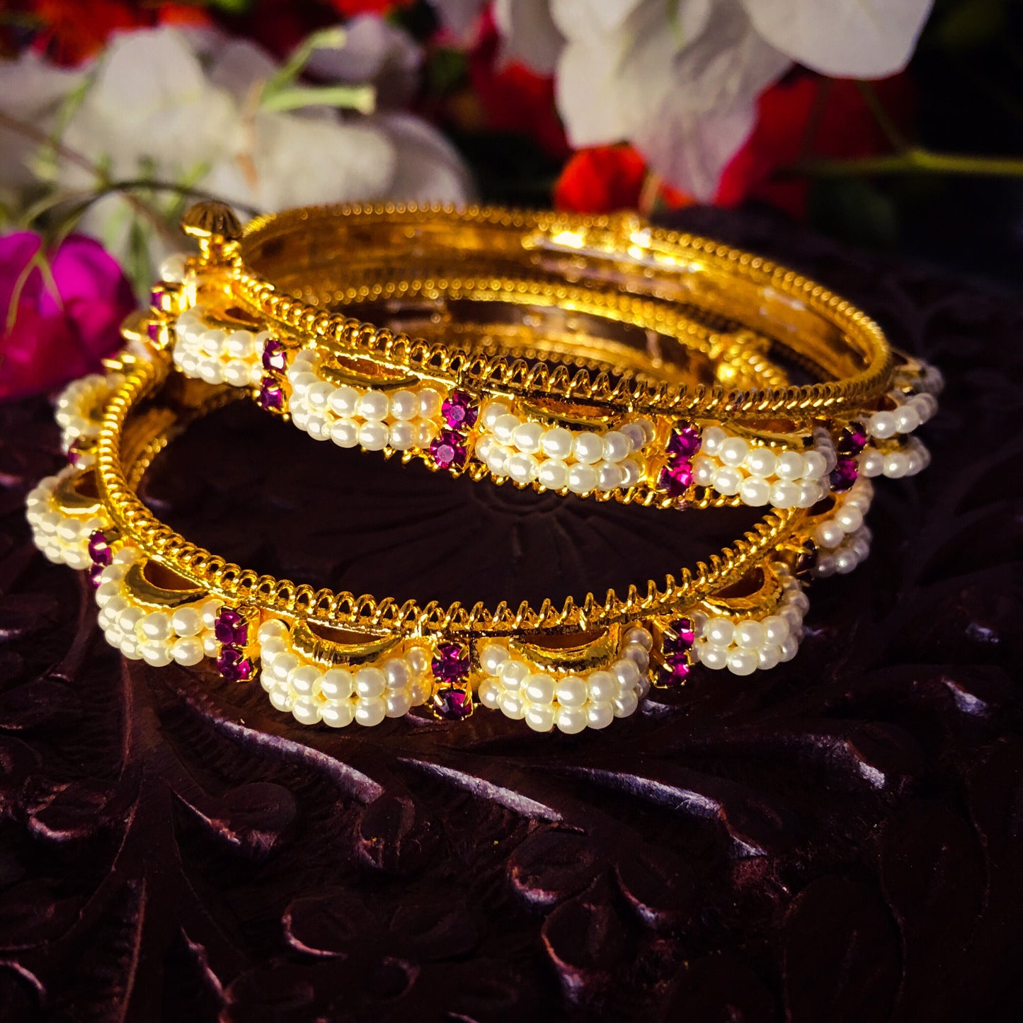Pink colour sparkling pair of moti bangles embedded with sparkling stones is best to team with matching saree. They are encrusted with shimmering stones and made from golden finish copper metal. These bangles are superior in quality and will be your fashion companion for many years.