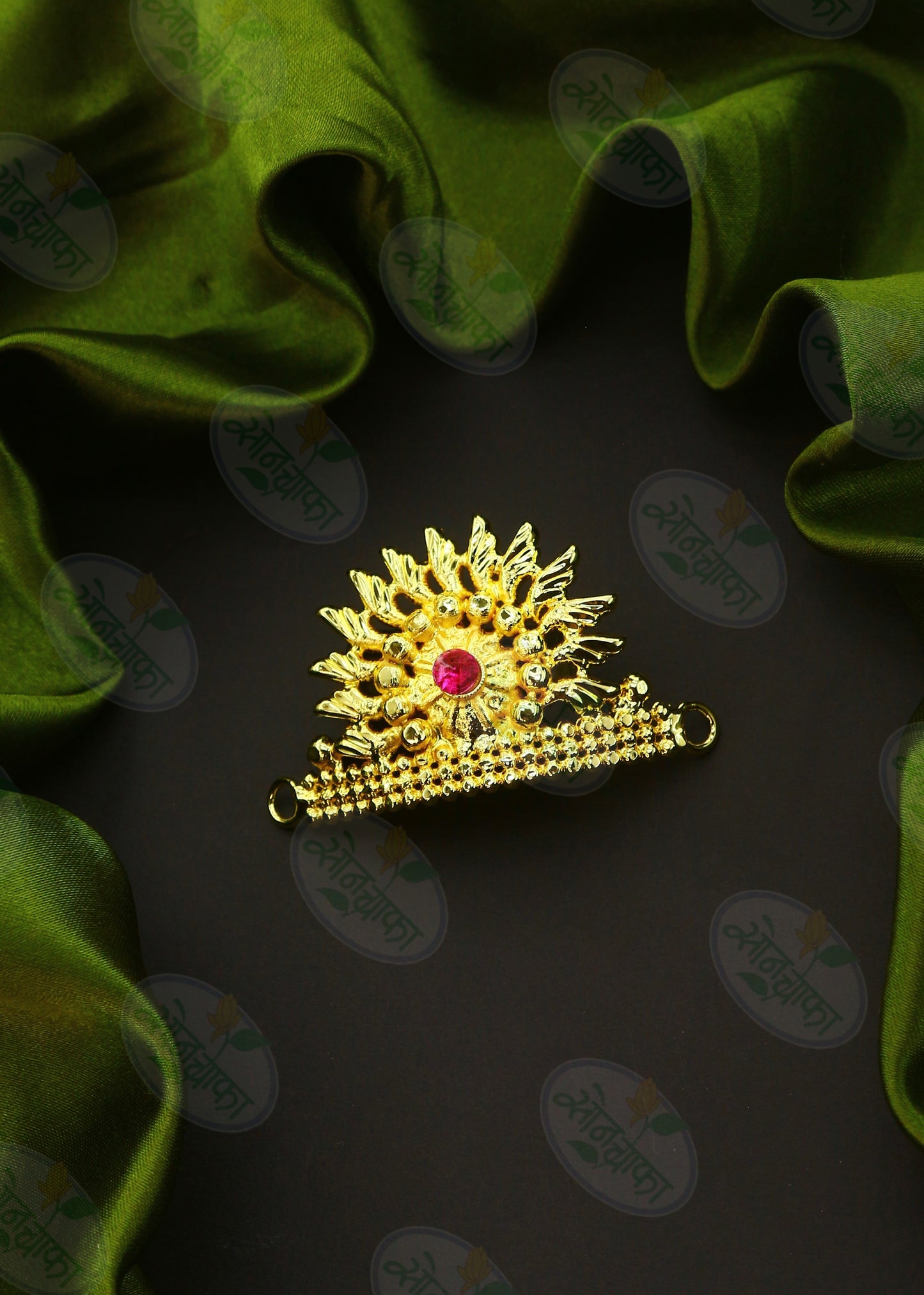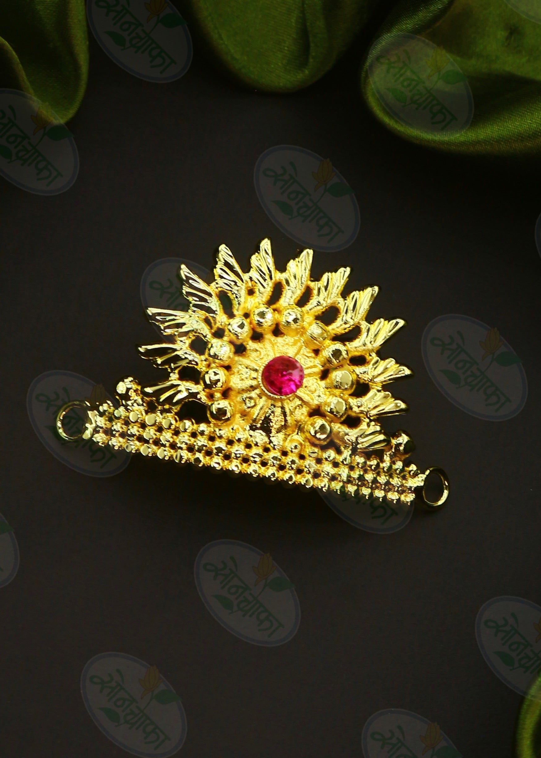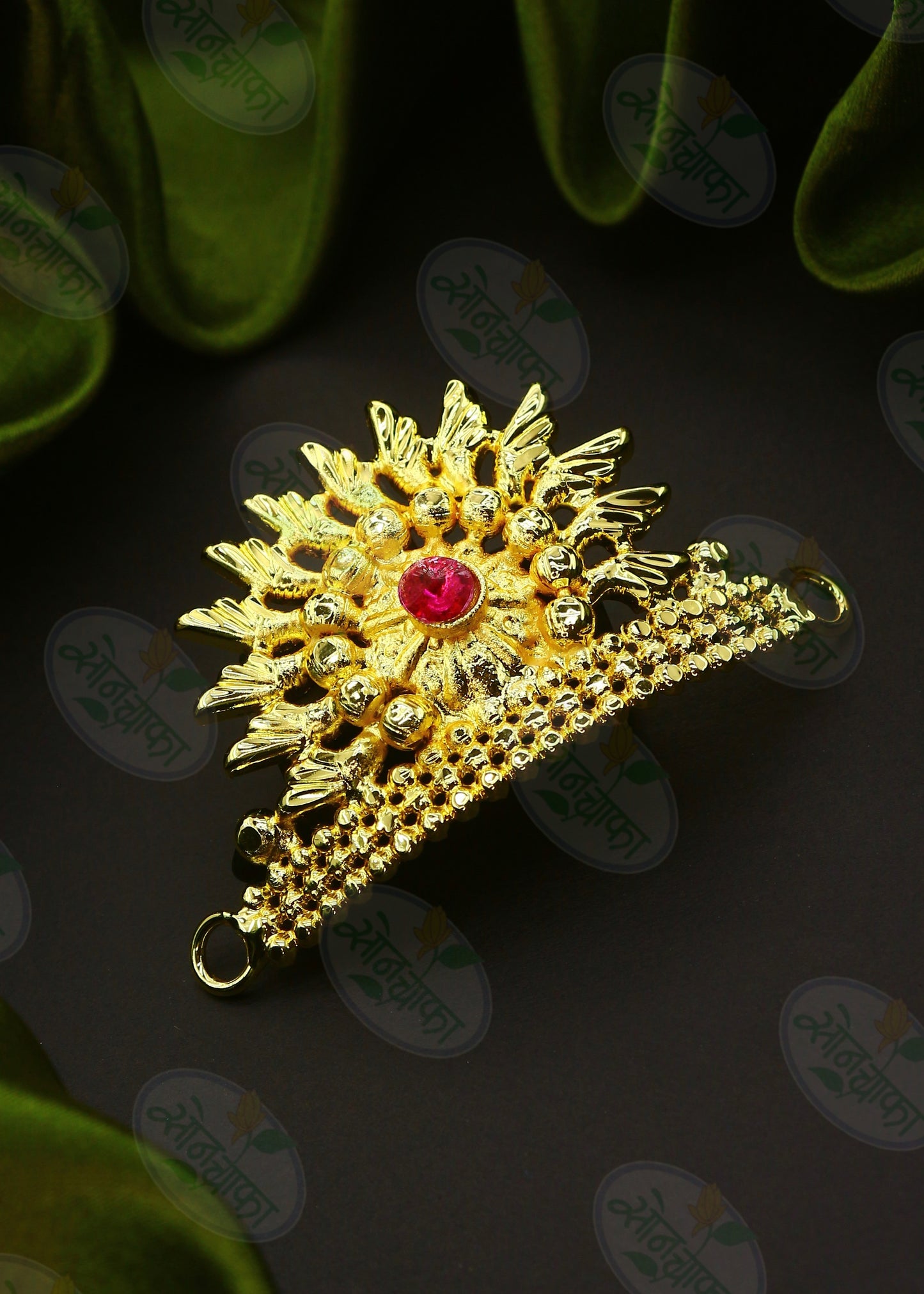 Excellently crafted this floral 'Ganpati Mukut' for your Gajanana from Sonchafa Jewellers. This piece of jewellery is very much adorable and made from golden finish metal. It is studded with glossy pink stone for attractive look. It has an adjustable back dori.