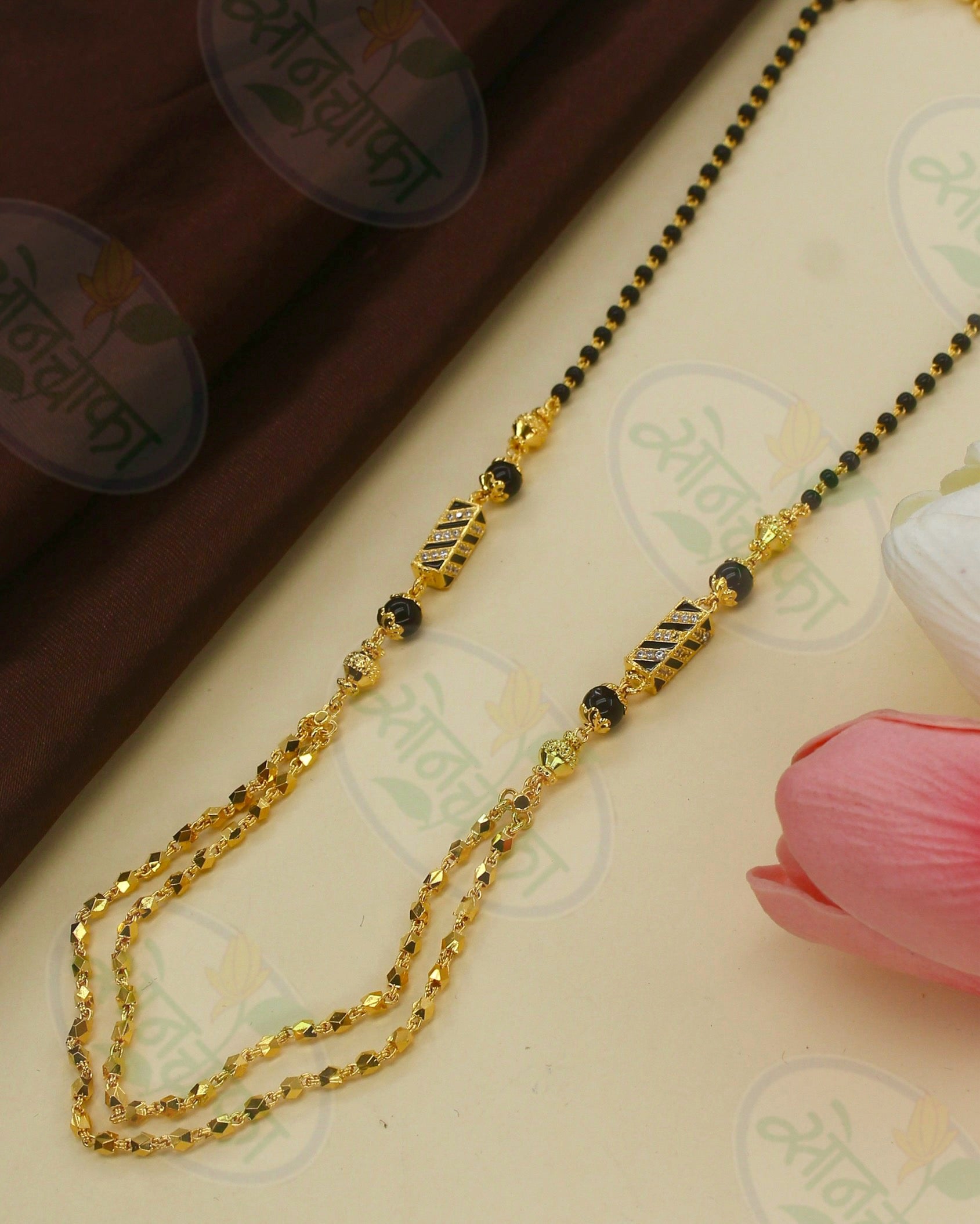 Exclusive designer mangalsutra set styled with droplets is best pick for married women. It is styled with mina work and feature intricate carving design on metal surface. The pendant is attached to double layer black beaded chain and comes with matching earrings.