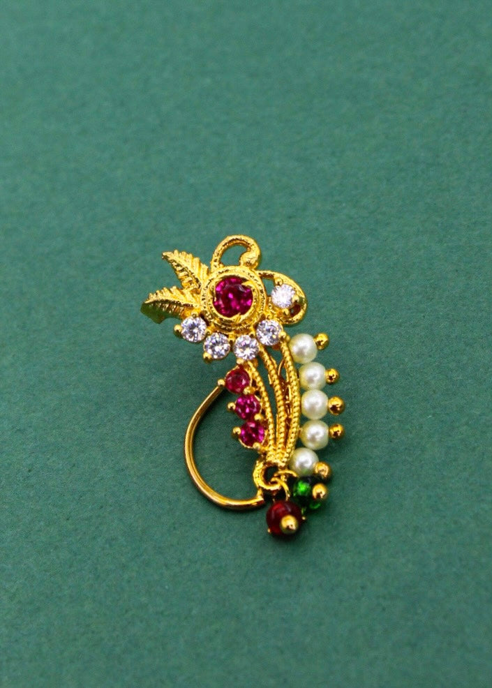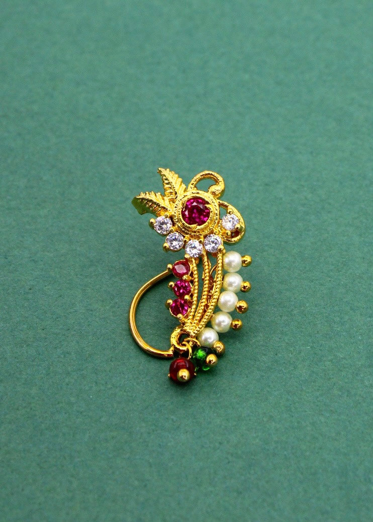 Stunning golden finish embedded with white and pink colour stone designer nath for girl or women by Sonchafa Jewellery. This nath is made up of golden finish metal along with pearl beads.