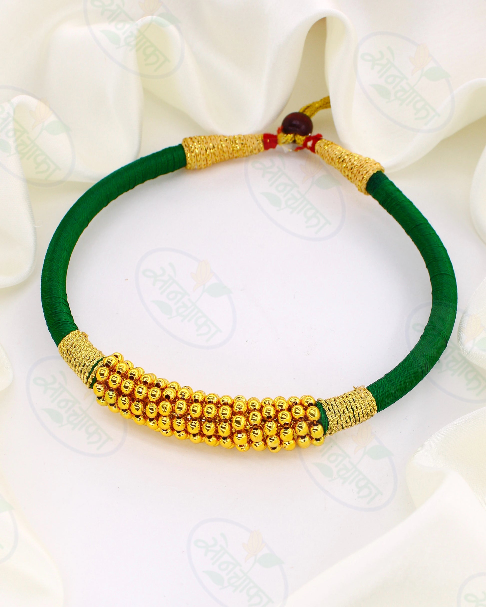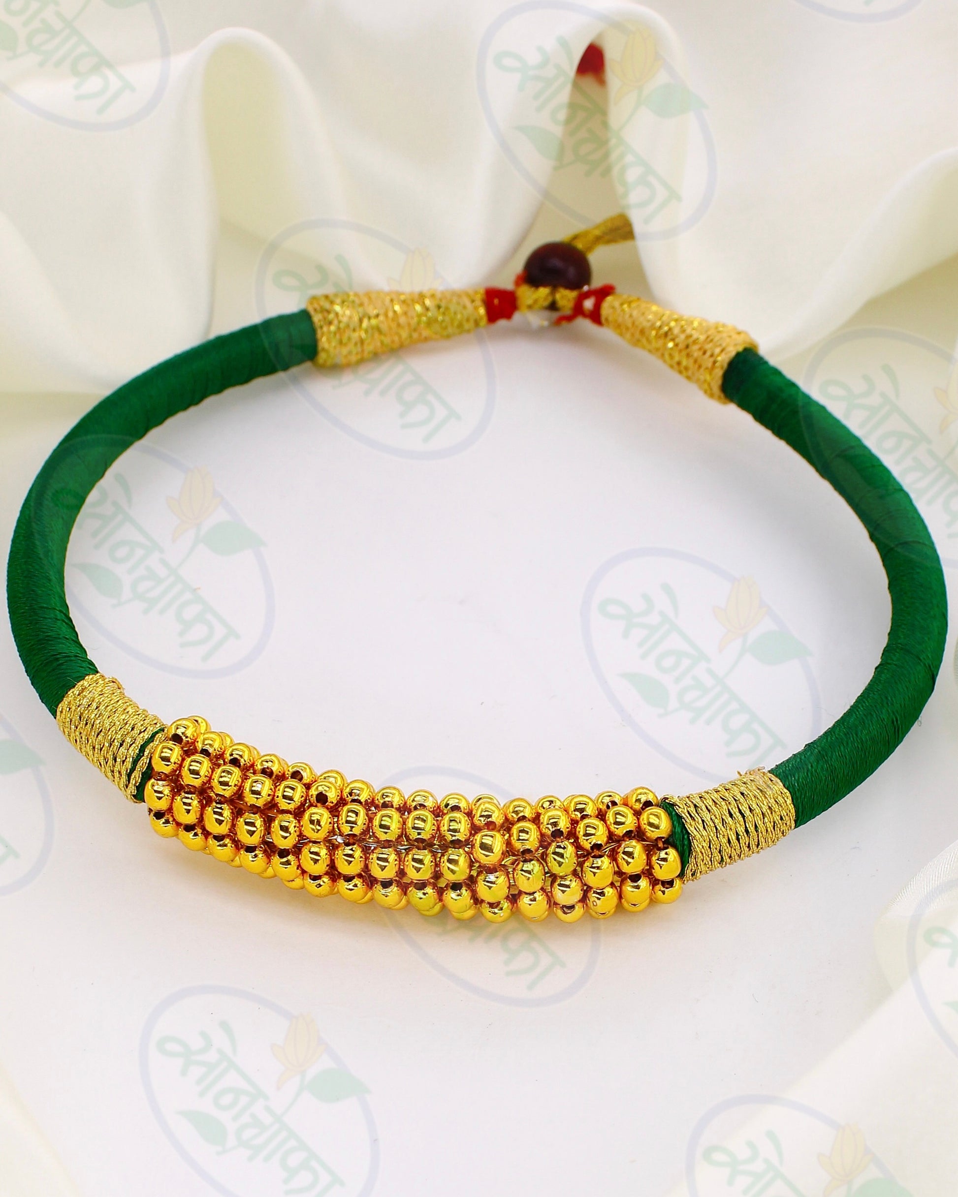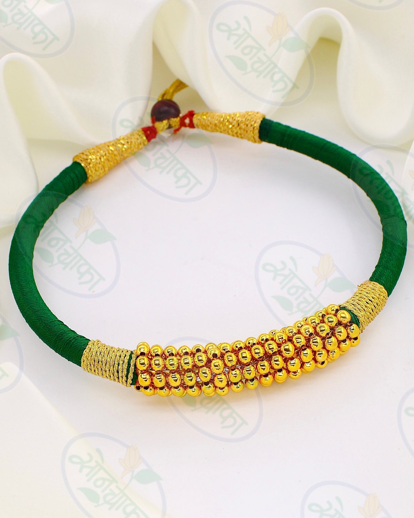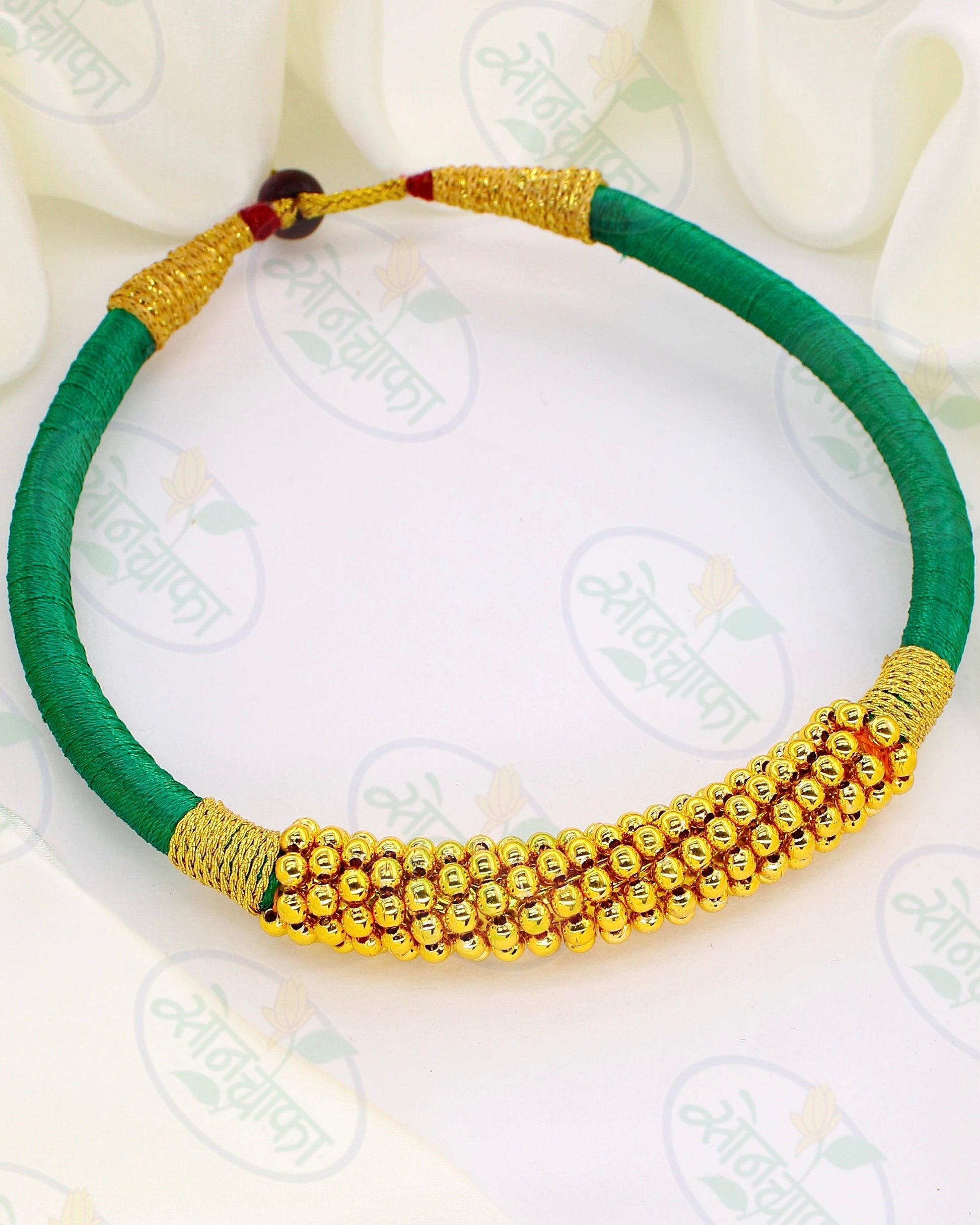 Adorn your neckline with this traditional look beautiful golden finish thushi which is perfect blend of class and elegance. Chandrakor pendant of this thushi is woven into pink, green stone along with golden beads. This designer golden finish necklace will fetch you lots of compliments from onlookers for your amazing choice