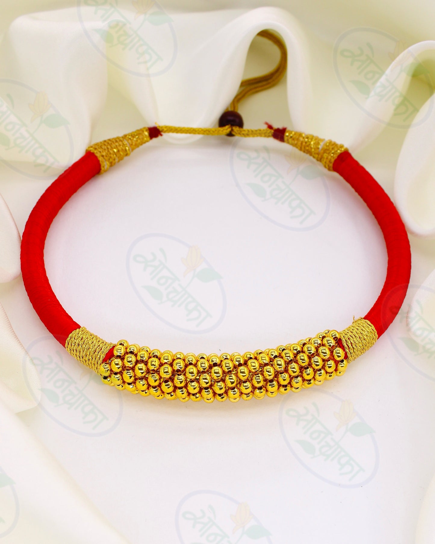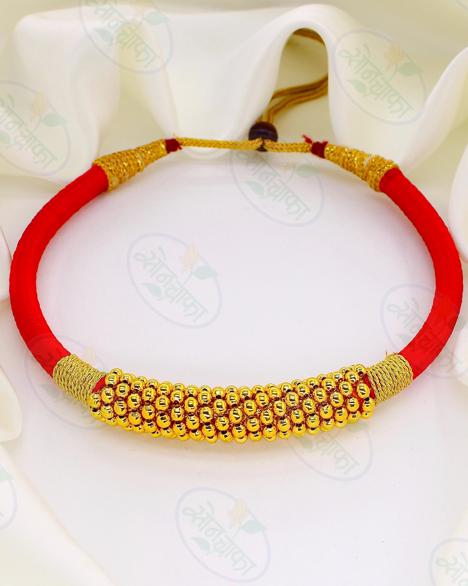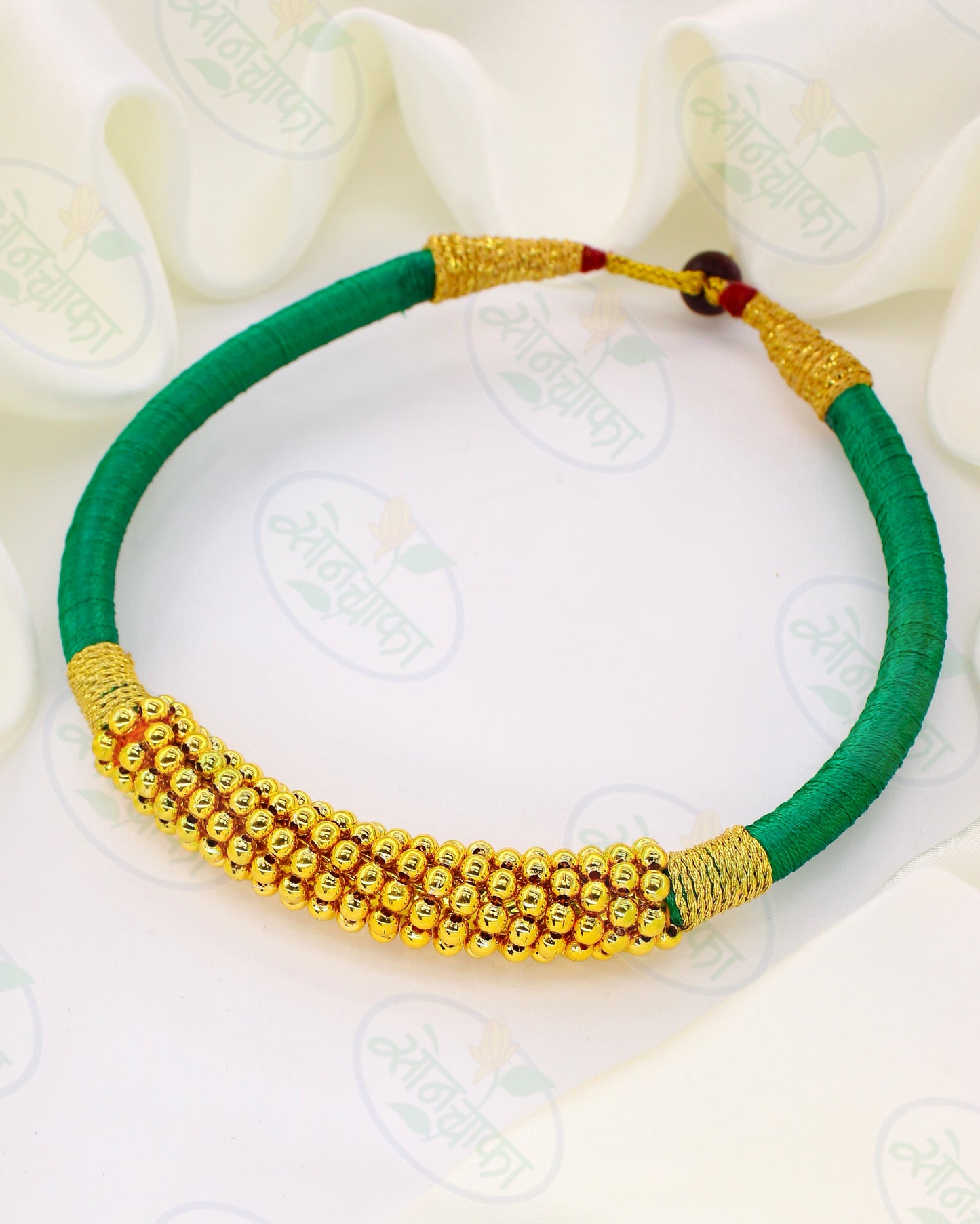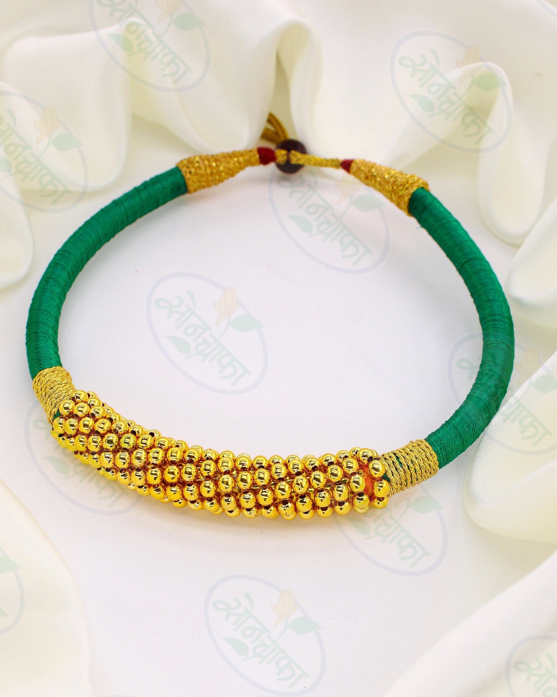 Adorn your neckline with this traditional look beautiful golden finish thushi which is perfect blend of class and elegance. Chandrakor pendant of this thushi is woven into pink, green stone along with golden beads. This designer golden finish necklace will fetch you lots of compliments from onlookers for your amazing choice