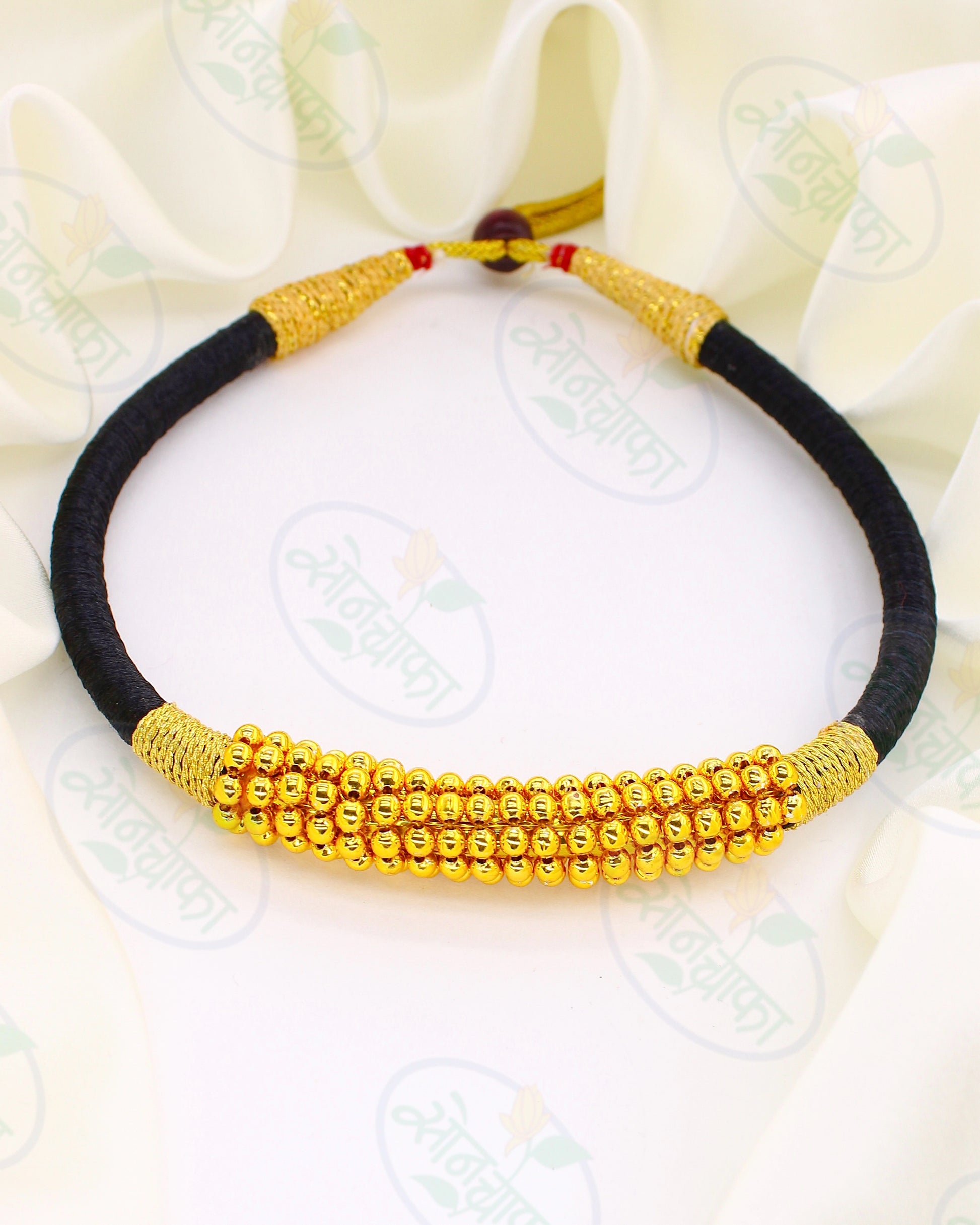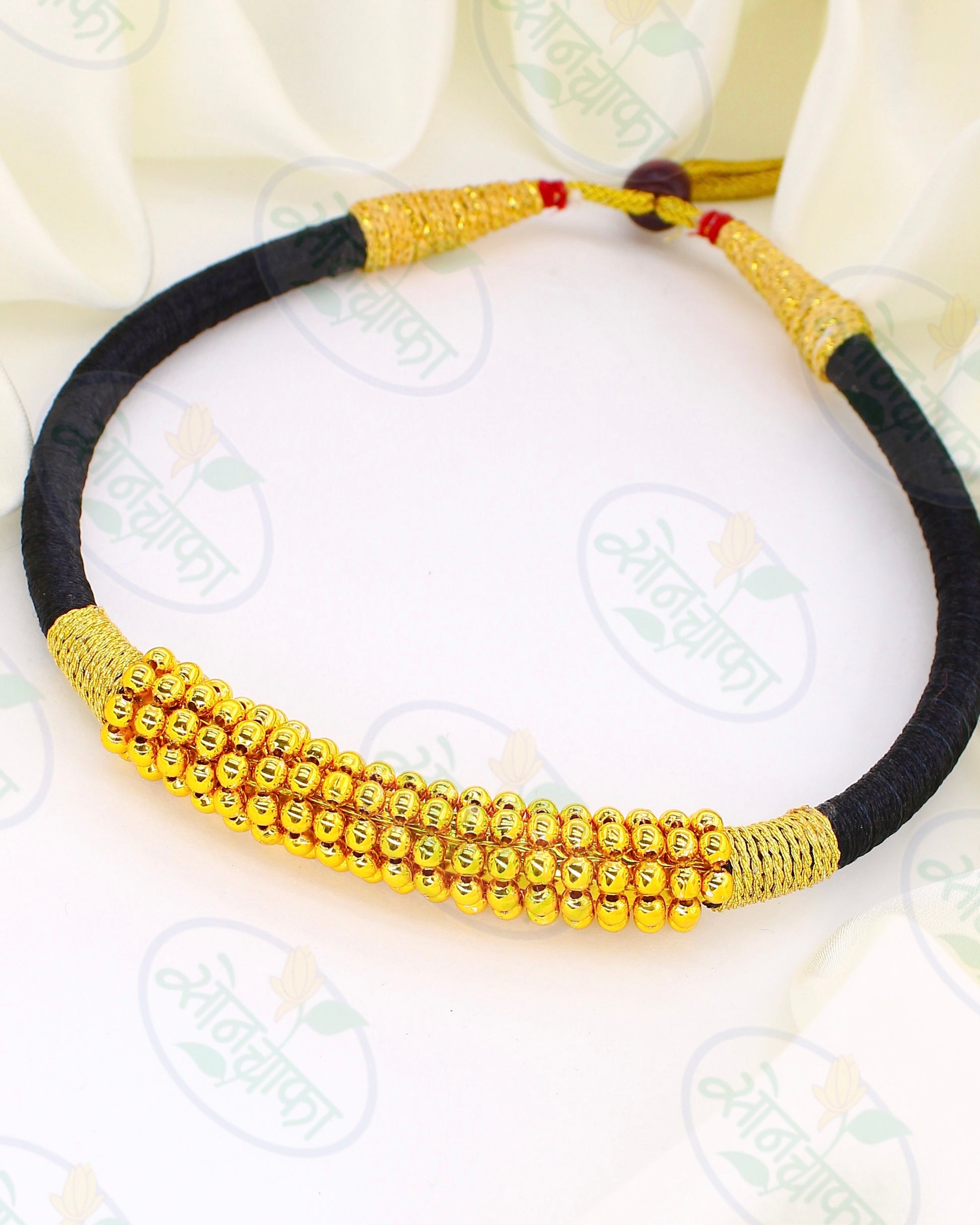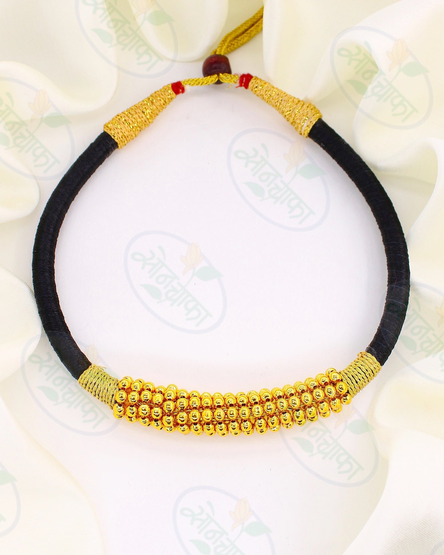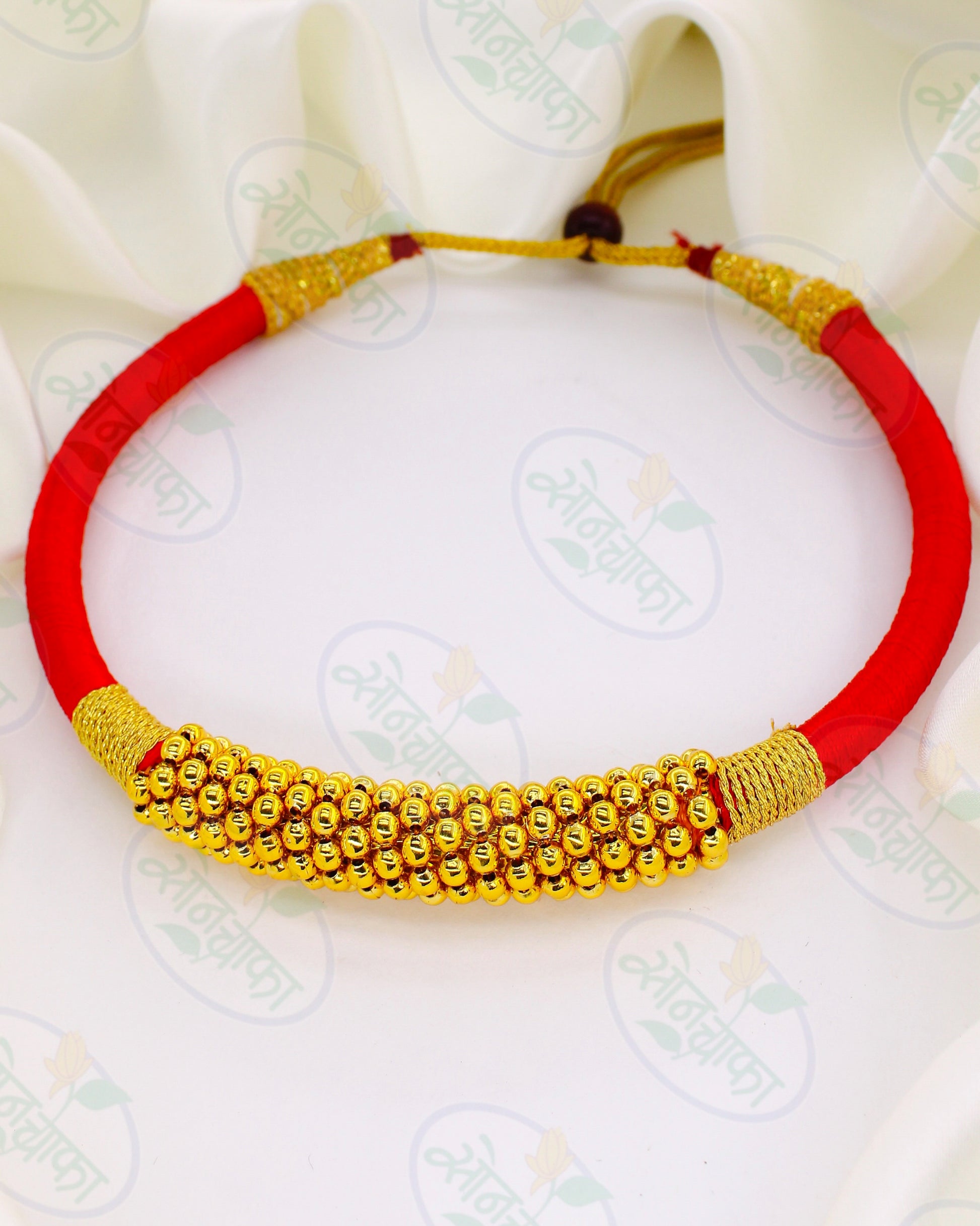 Adorn your neckline with this traditional look beautiful golden finish thushi which is perfect blend of class and elegance. Chandrakor pendant of this thushi is woven into pink, green stone along with golden beads. This designer golden finish necklace will fetch you lots of compliments from onlookers for your amazing choice