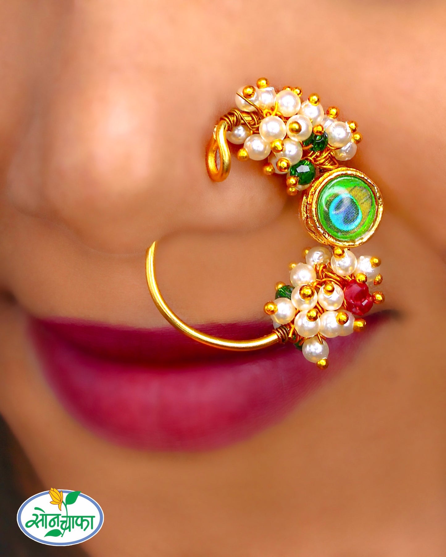 Sonchafa Jewellers offers this beautiful pink white colour Trendy peacock nath for women or girl who love to wear traditional accessory. This nath is fashioned from golden finish metal