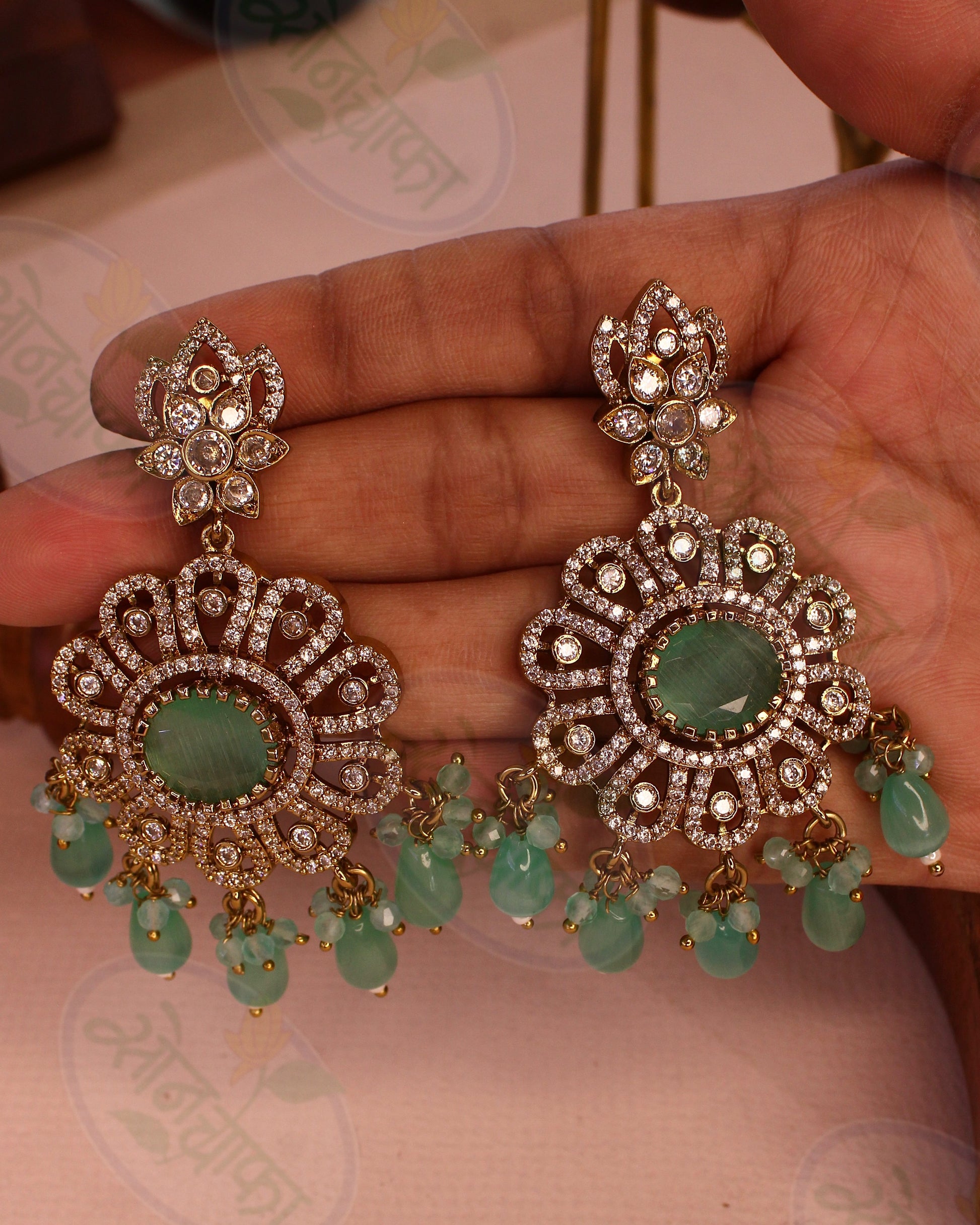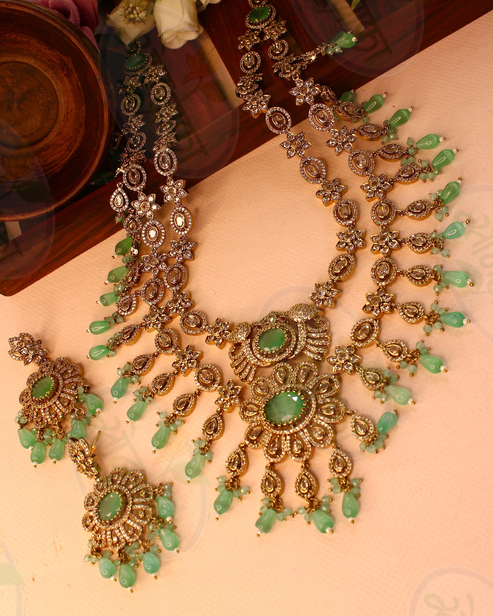 This droplet design stunning necklace from Sonchafa Jewellery will strike you at very first look. It is styled with wonderful embedded with maroon, green stones. This classy necklace set is high in quality and will be your fashion companion for many years. In addition it has golden bead droplet for added attraction.