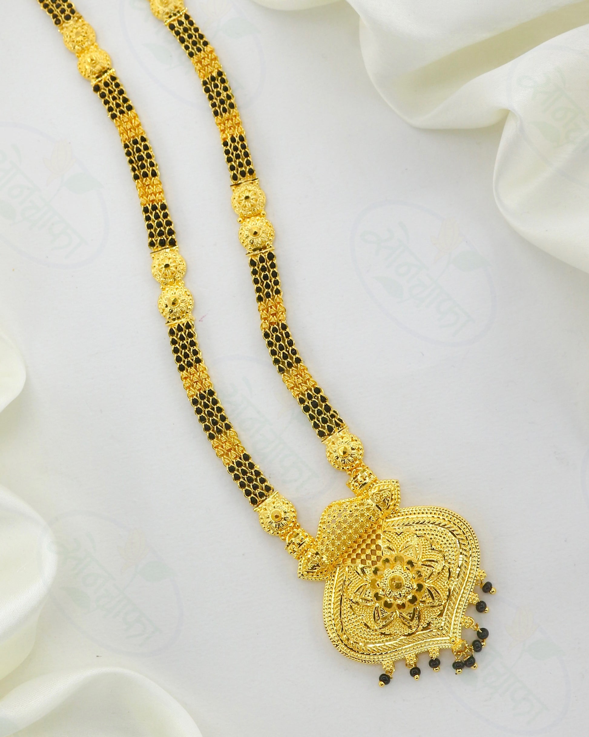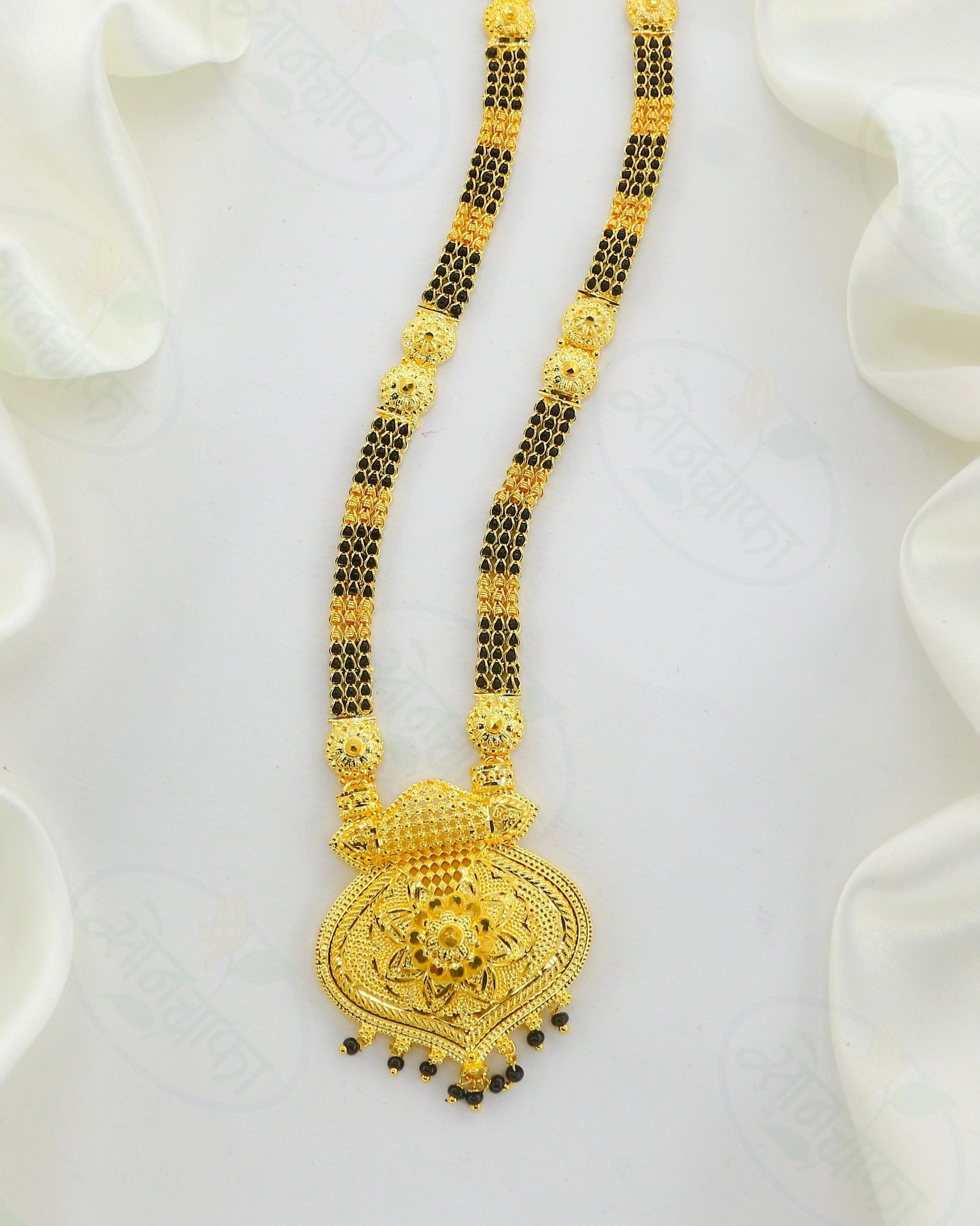 1 Gram gold plated adorable mangalsutra from Sonchafa Jewellery will appeal to you at very first look. It feature eye-pleasing intricate carving design on wati pendant surface and made from golden finish metal. This beautiful mangalsutra woven with golden and black beads for more attractive look. It is easy to wear as light in weight.