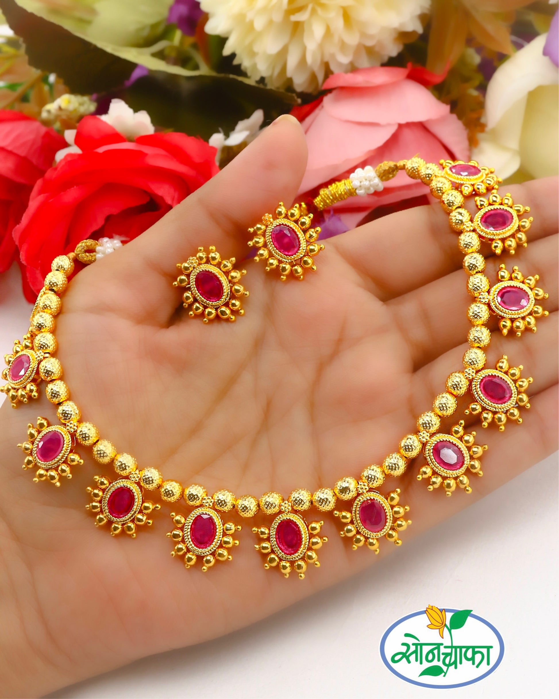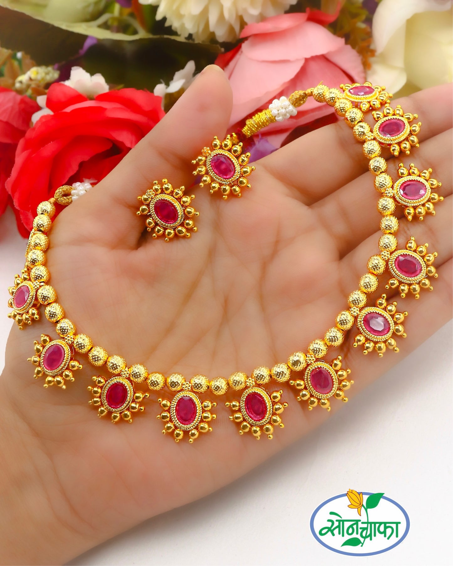 Attractive golden finish floral design necklace set from the house of Sonchafa Jewellery. This necklace studded with sparkling pink stones and made from golden finish metal. This necklace set is fashioned from good quality metal and ensures high durability. It is wonderfully woven with pearls in string.