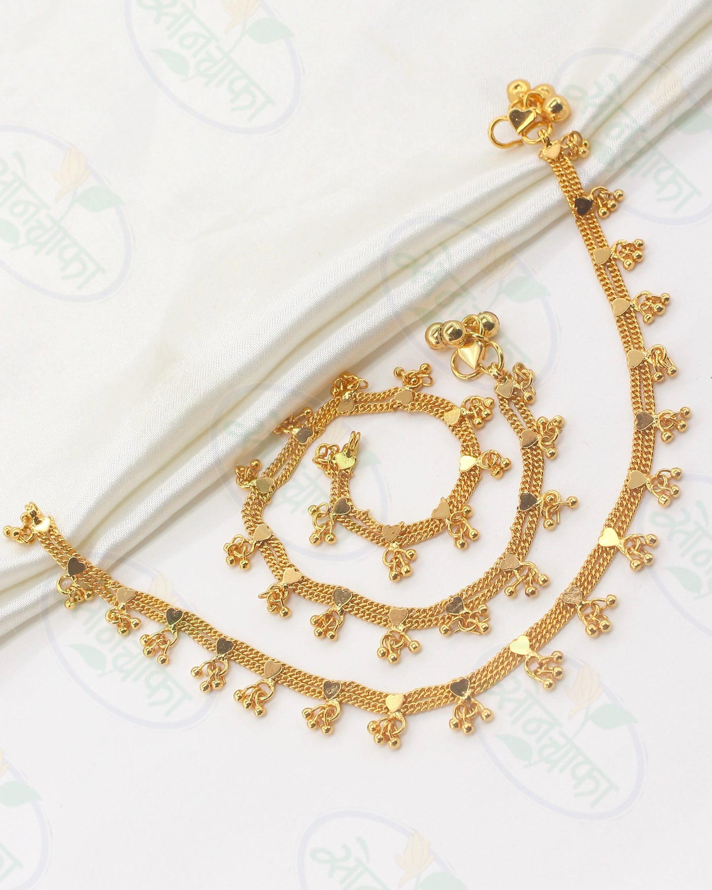 Look very beautiful by adorning this antique payal from Sonchafa Jewellery. These are fashioned from antique golden finish metal. These are studded with golden color stone for look more attractive. These payal are superior in quality and long lasting.