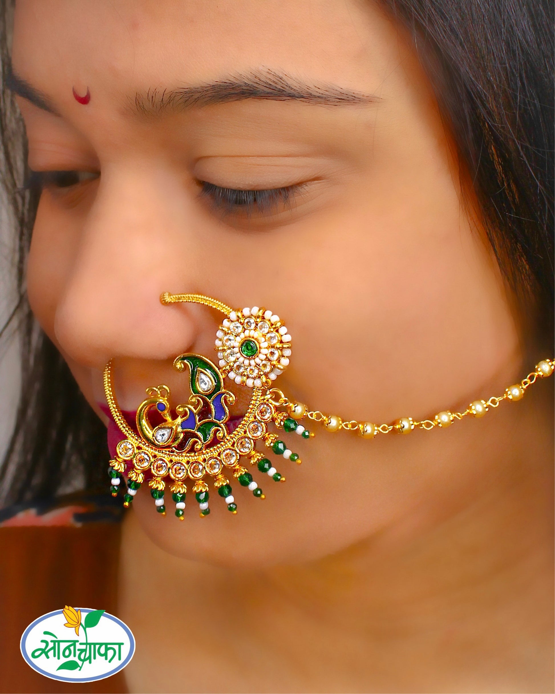 To get that perfect bridal look nath is must to wear, so Sonchafa Jewellery offers this beautiful nath for you. It is studded with sparkling pink stone with golden beads & made with golden finish metal. This metal crafted nose ornament is easy to wear as it is press nath.