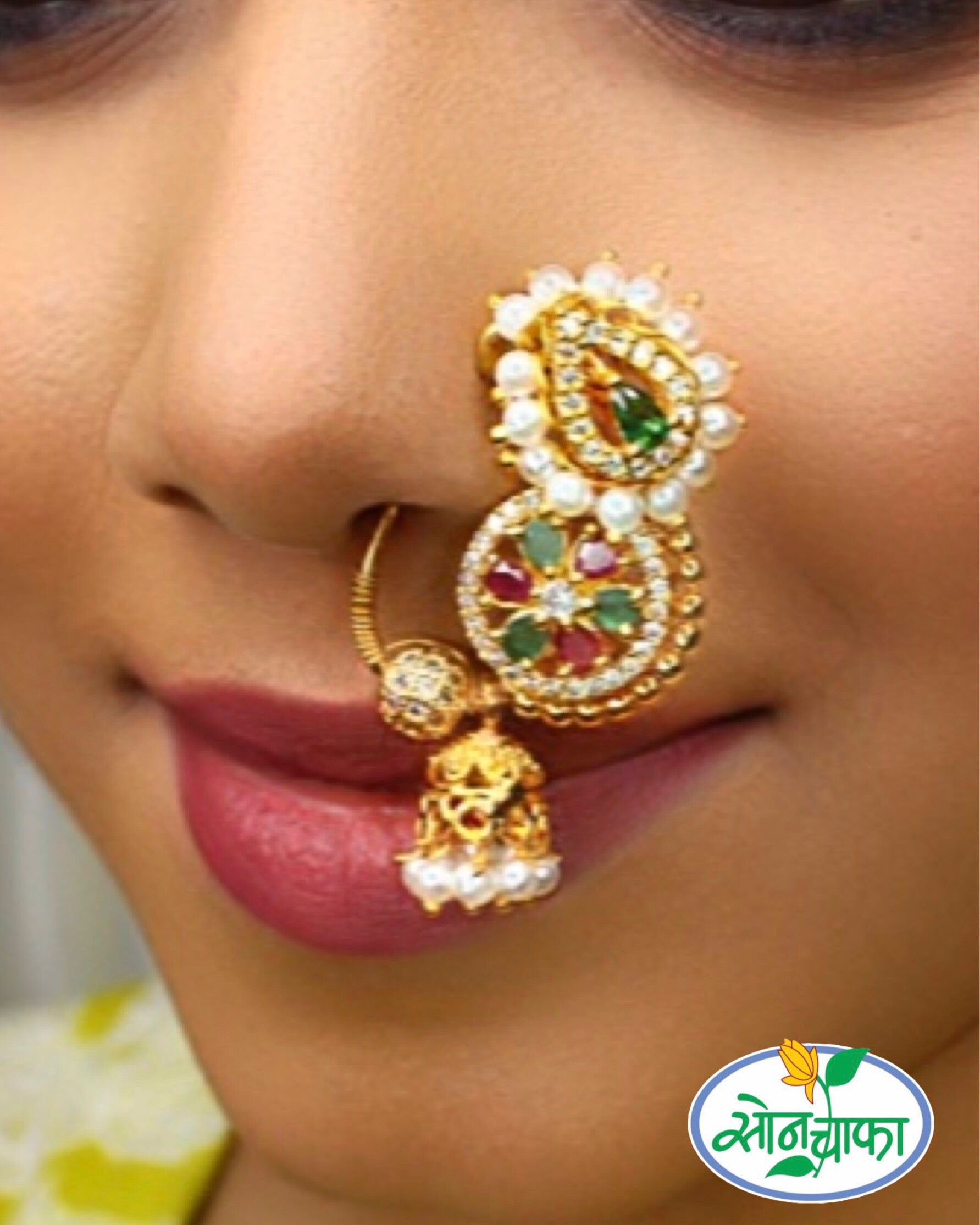 Sonchafa Jewellers offers this beautiful pink stone nath for women or girl who love to wear traditional accessory.