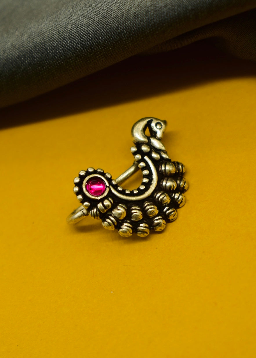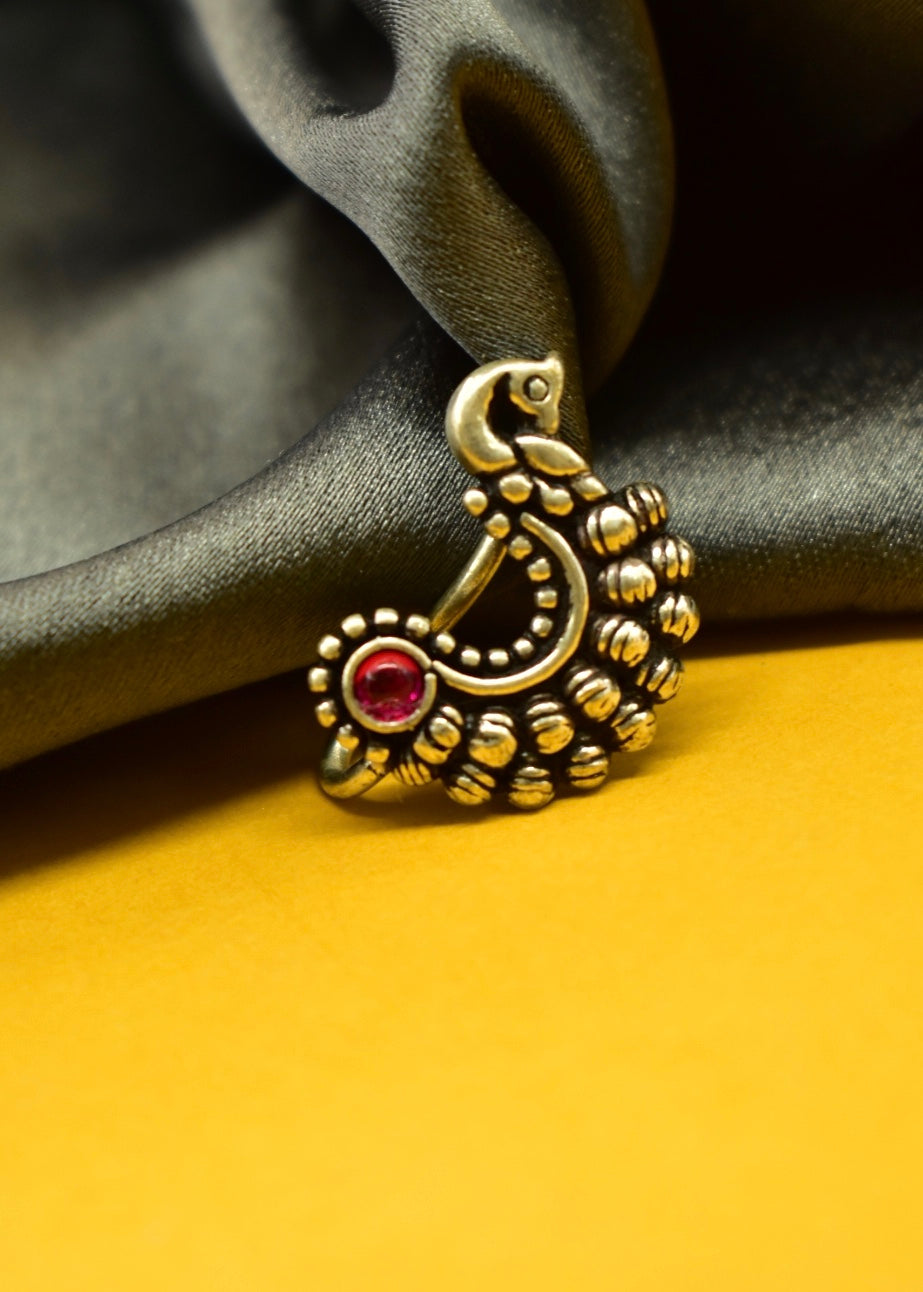 Sonchafa Jewellery offers this beautiful designer Peacock nath for women who love to wear traditional accessory. It is studded with sparkling pink colour stone. This nath is fashioned from Oxidised finish metal and requires piercing.