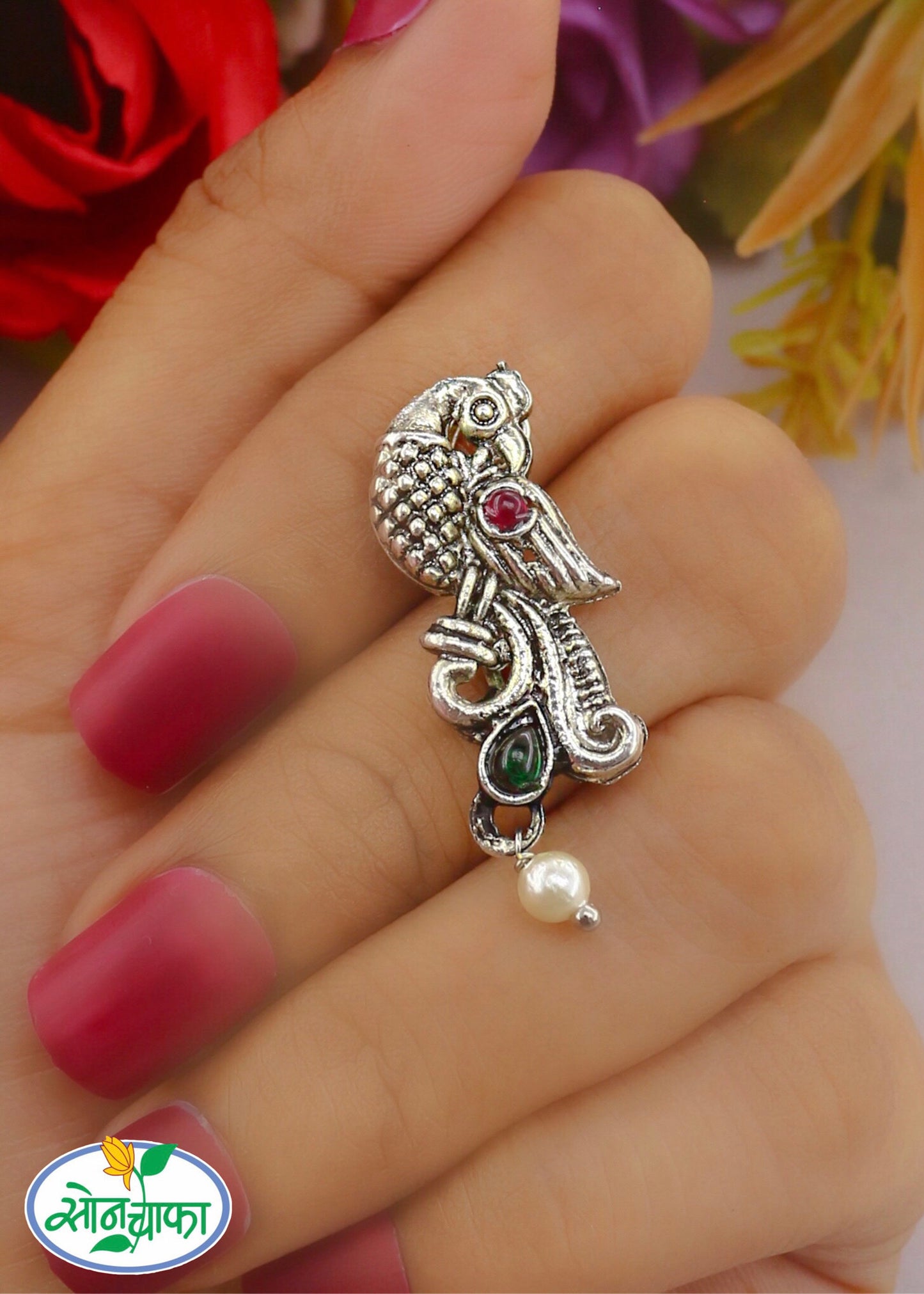 This adorable peacock inspired Oxidised nath from Sonchafa Jewellery for our trendy look. It is wonderfully crafted with oxidized finish metal along with studded pink, green colour stone. This nath pressing nose ring has peacock design for classy look.
