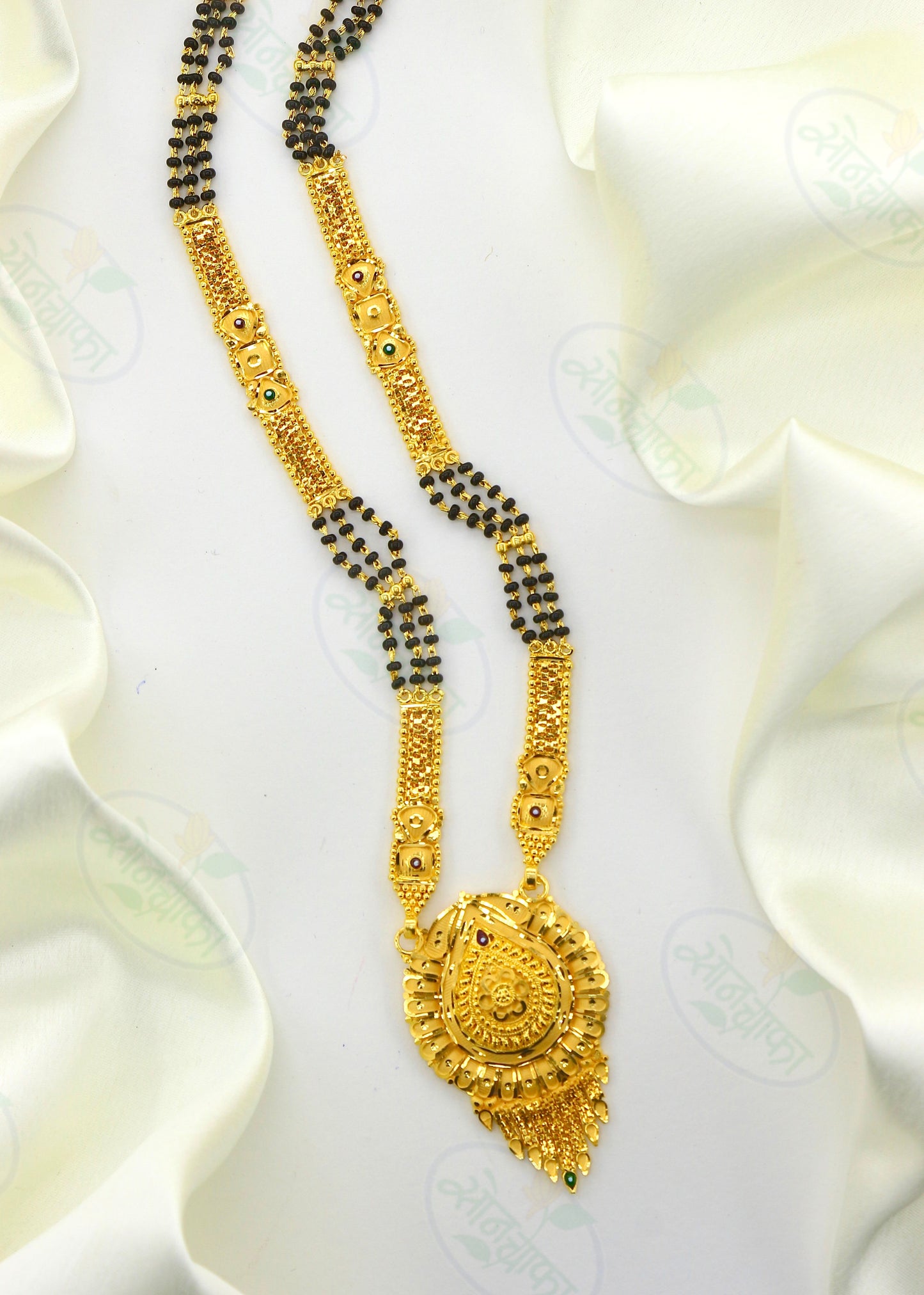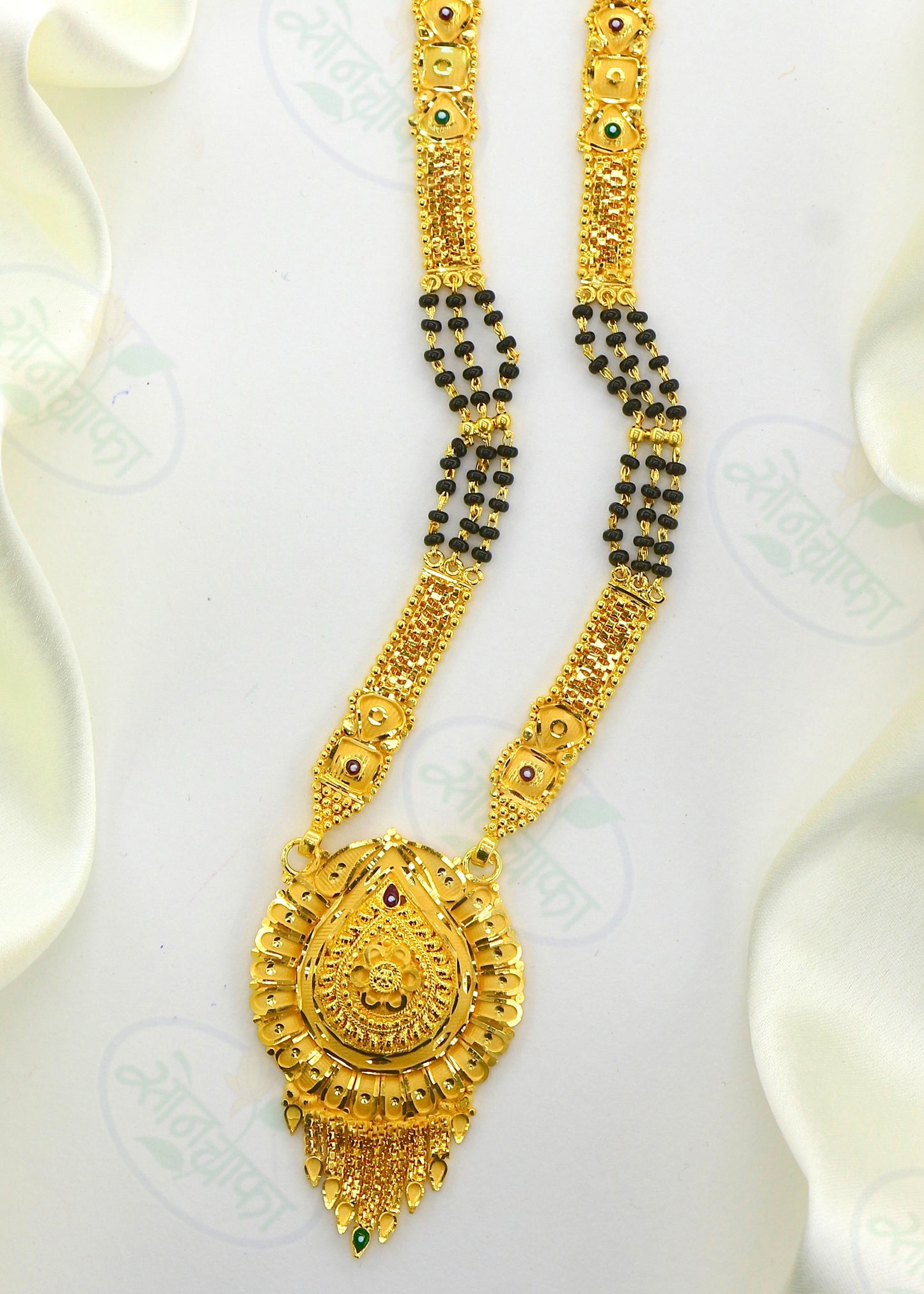 Floral designer pendant gold plated Mangalsutra from Sonchafa Jewellery will appeal to you at very first look. This mangalsutra is superior in quality and will be your fashion companion for many years. It comes with black, golden beads along with golden droplet.