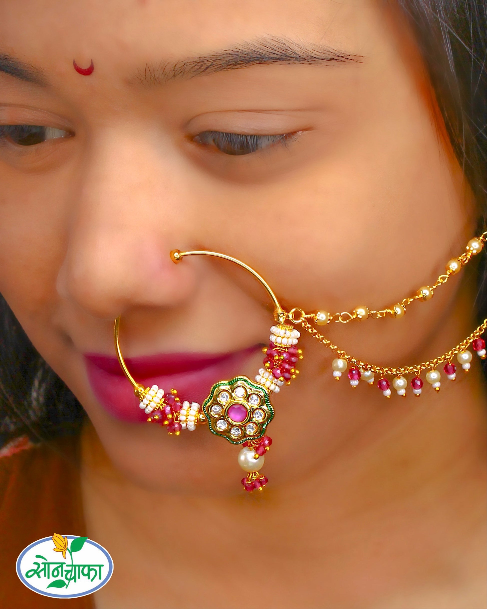To get that perfect bridal look nath is must to wear, so Sonchafa Jewellery offers this beautiful nath for you. It is studded with sparkling pink stone with golden beads & made with golden finish metal. This metal crafted nose ornament is easy to wear as it is press nath.