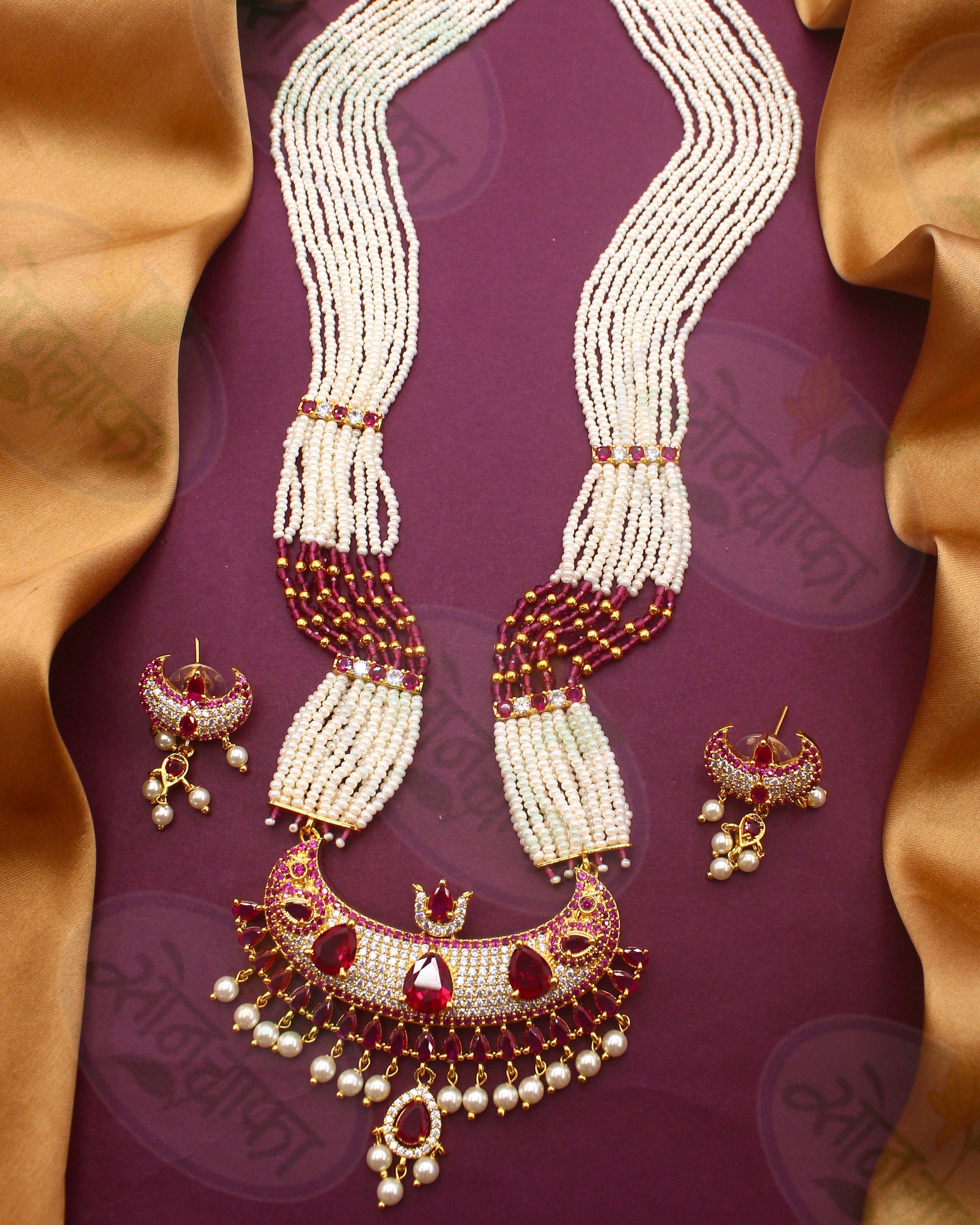 Adorn your neckline with this kuyari design short necklace set with your traditional costume. It is styled with studded pink, white stone and made from golden finish metal. This necklace is decorated with dangled pearl beads for more attraction. This appealing necklace set is good in quality and will retain its shine for years to come.