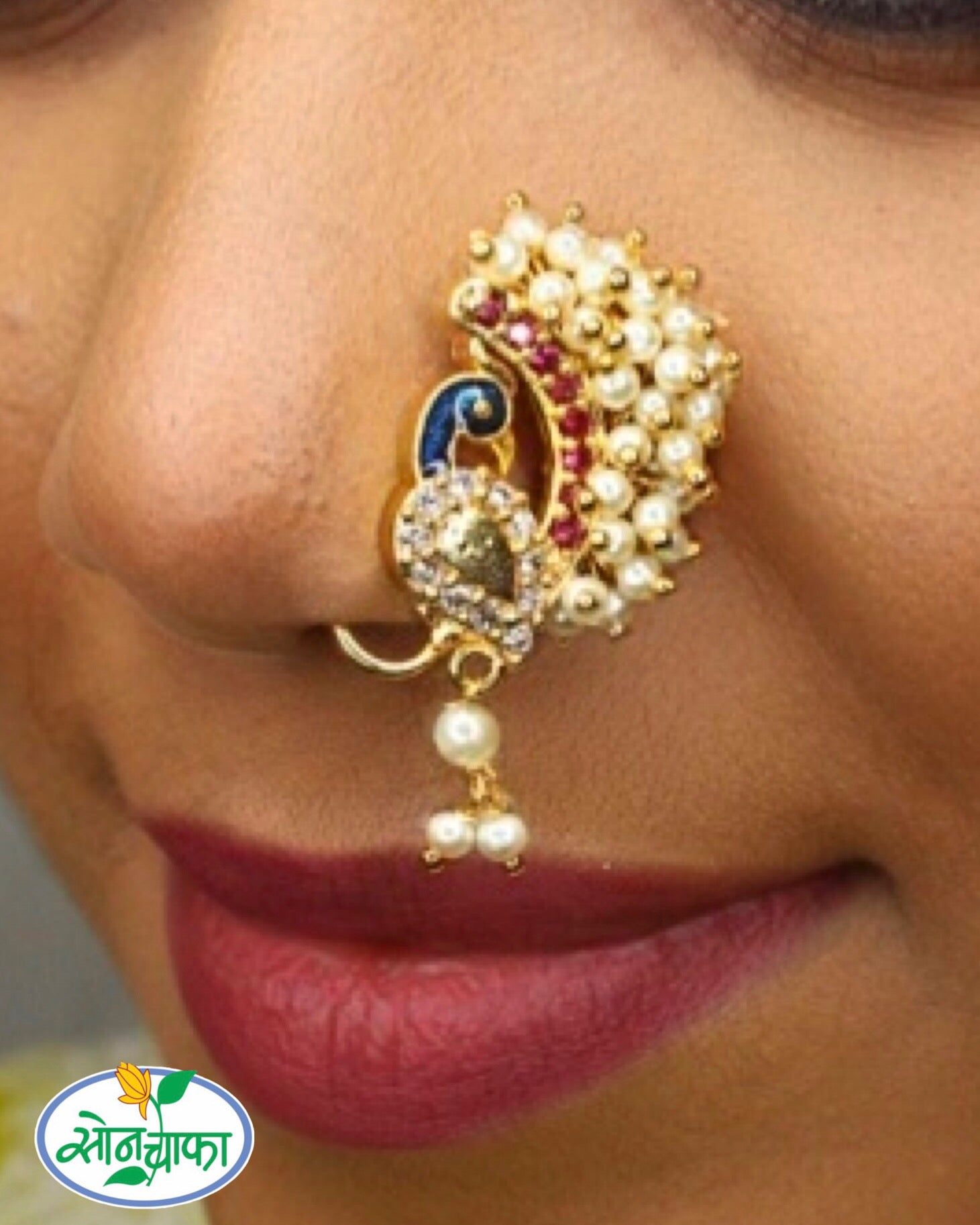 Adorn your nose with this pretty pearl nath which perfect to team with Maharashtrian outfits.
