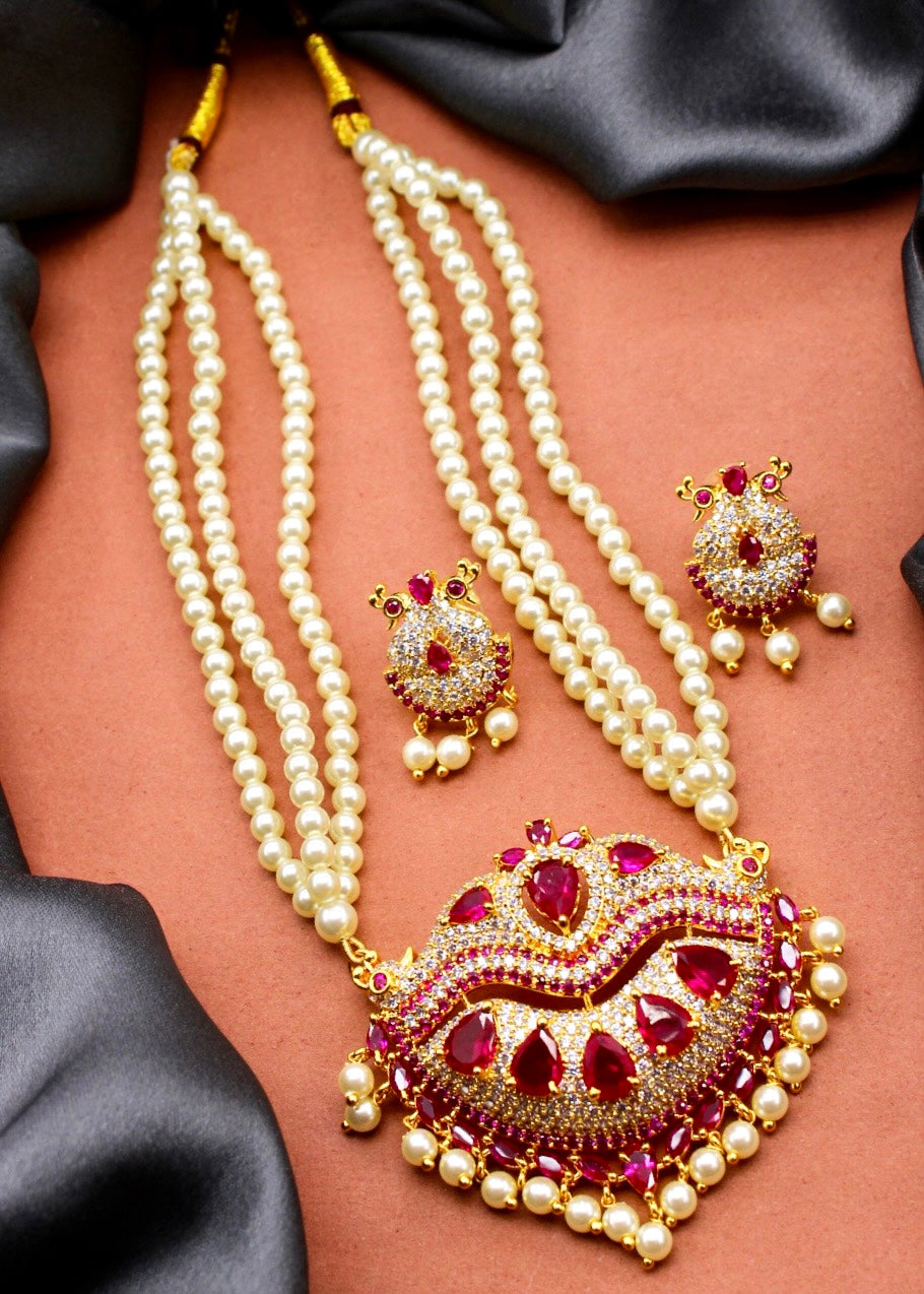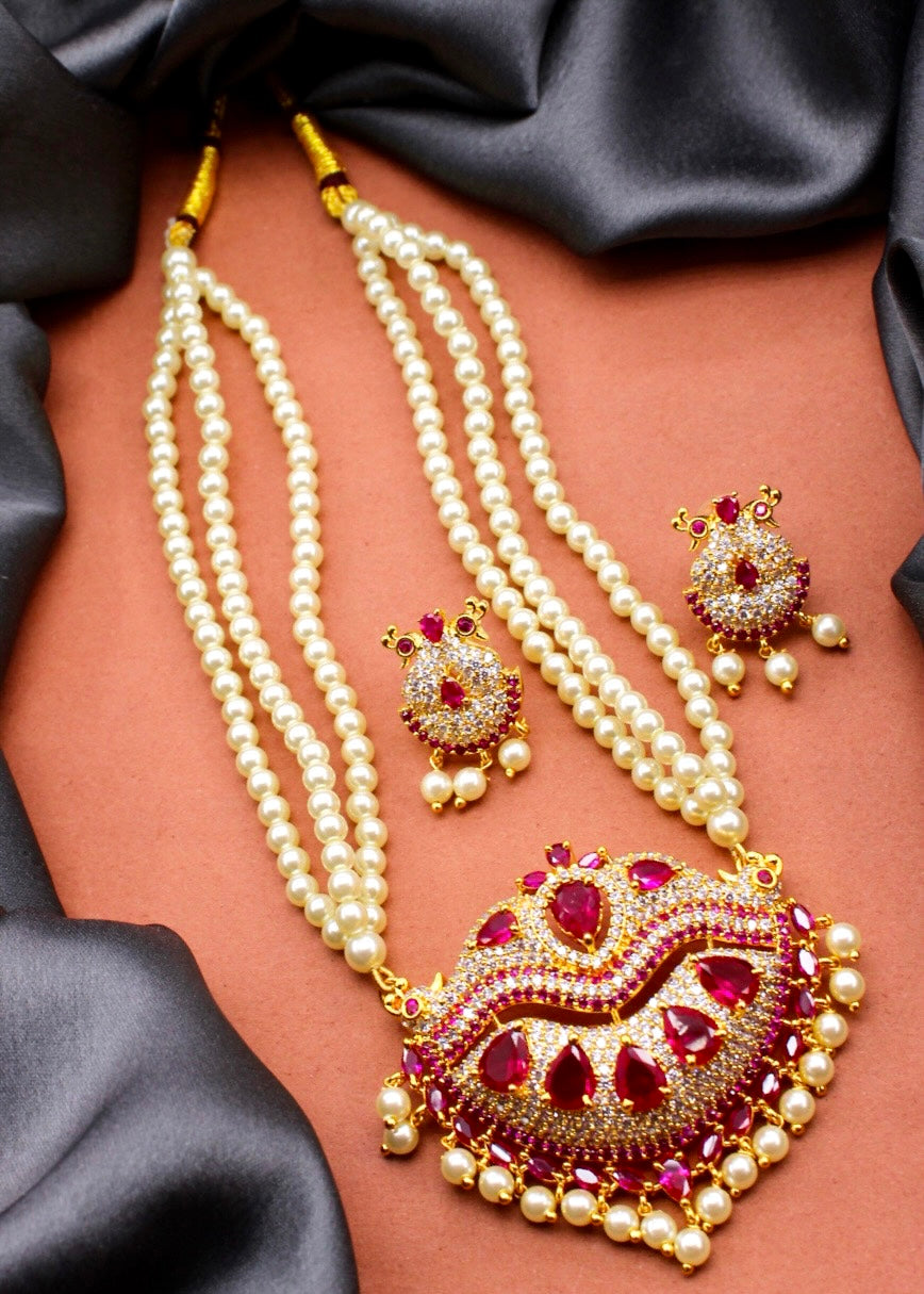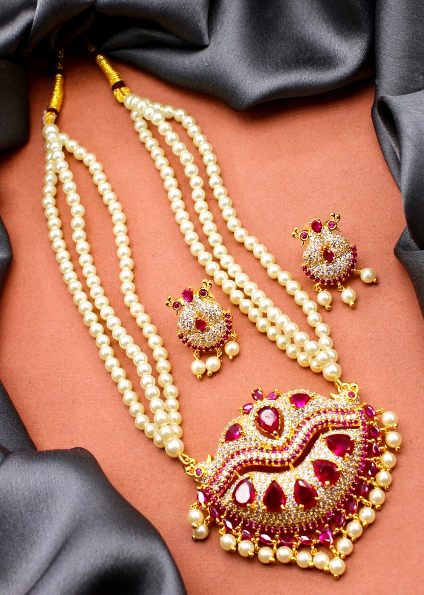 Add extra elegance to your appearance by adorning this three layer golden finish moti necklace set with your fancy attires from Sonchafa Jewellers. The design of this necklace is so wonderful and amazing that will make you look outstanding. It has pearl bead droplets for added attraction.