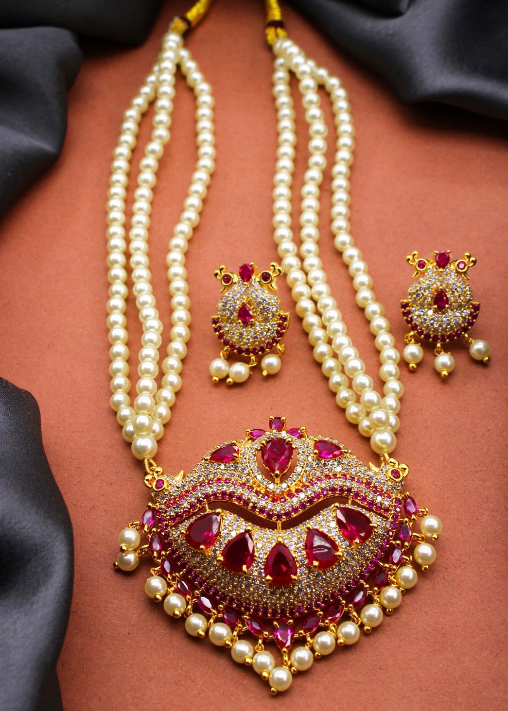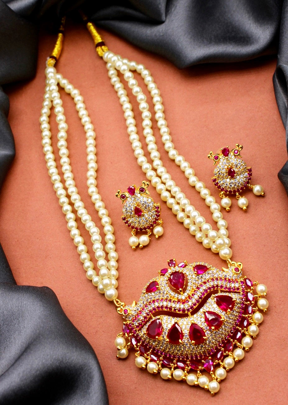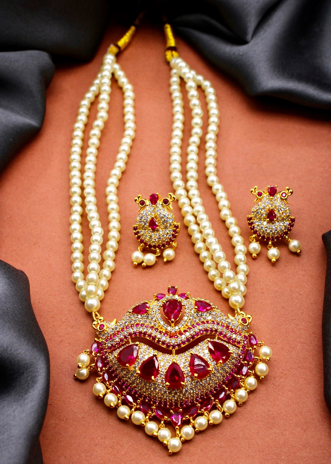 Add extra elegance to your appearance by adorning this three layer golden finish moti necklace set with your fancy attires from Sonchafa Jewellers. The design of this necklace is so wonderful and amazing that will make you look outstanding. It has pearl bead droplets for added attraction.
