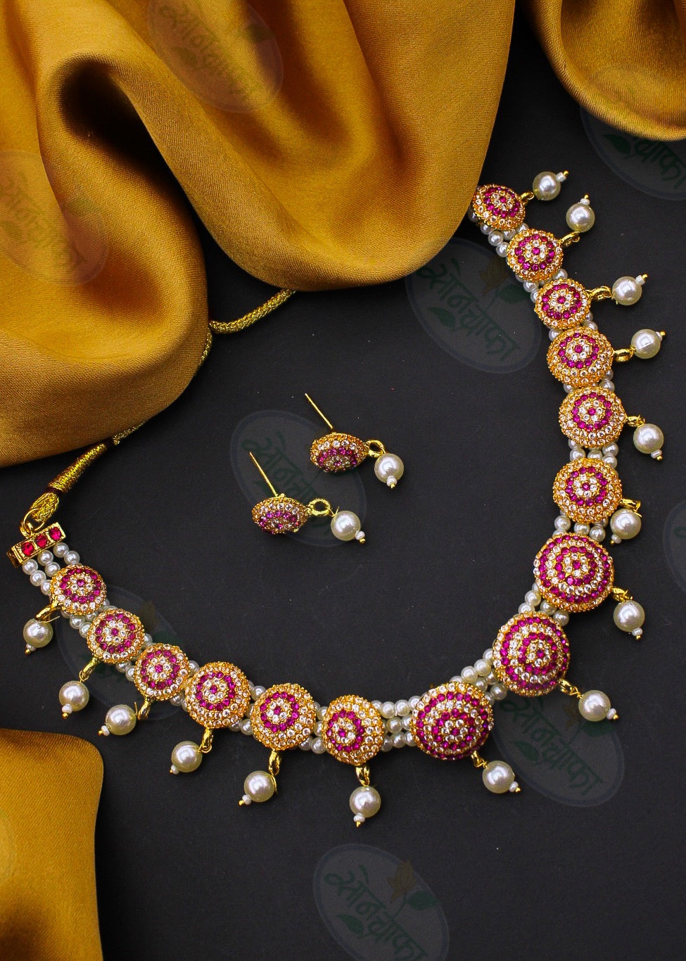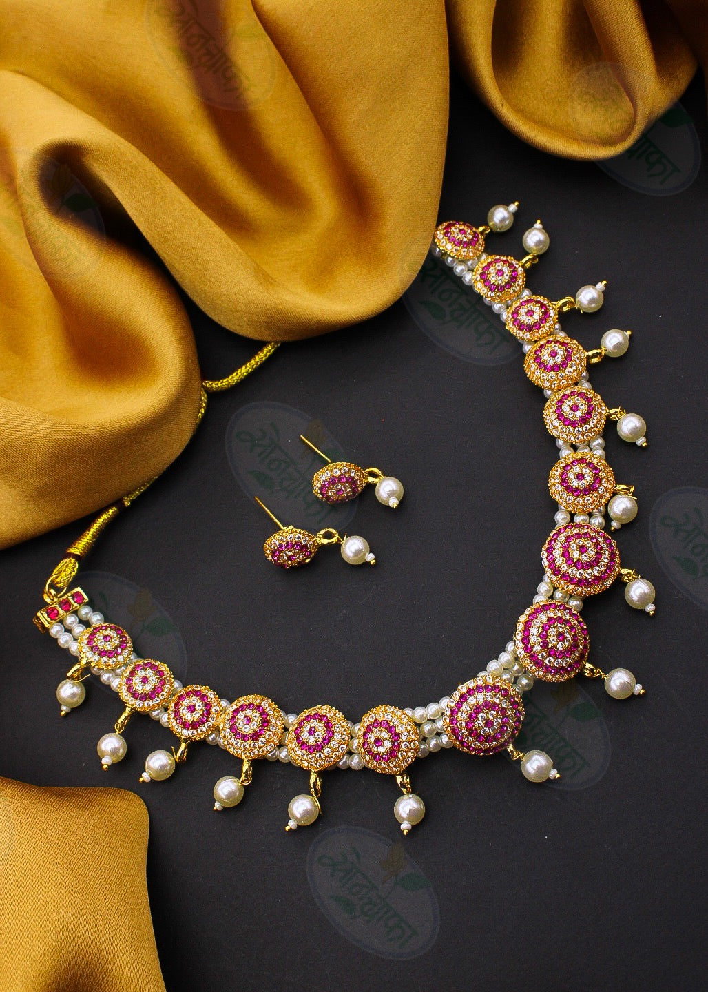 Attractive design choker necklace set from Sonchafa Jewellery. This necklace studded with sparkling pink, white stones and made from golden finish metal. This necklace set is fashioned from good quality metal and ensures high durability. It is wonderfully woven with pearls in unbreakable string.