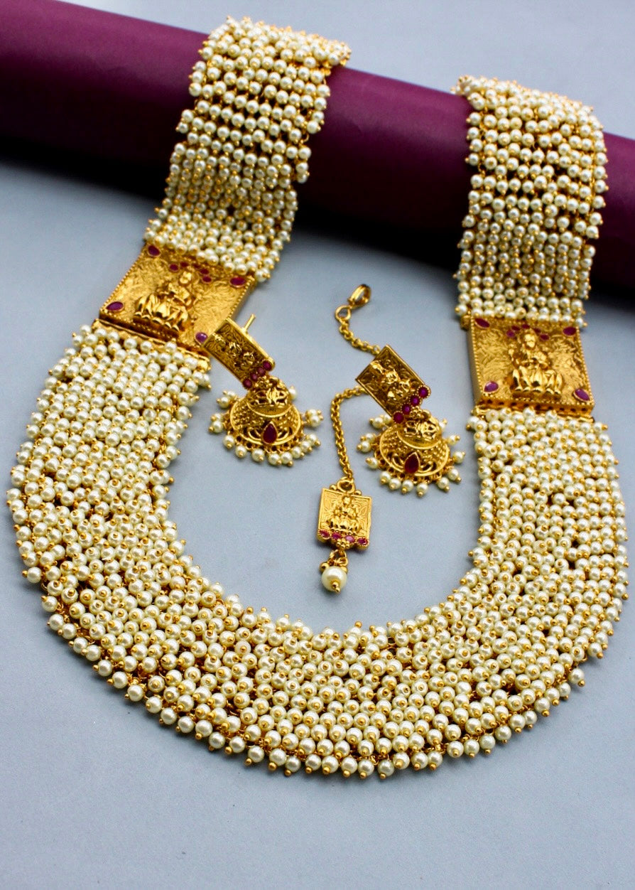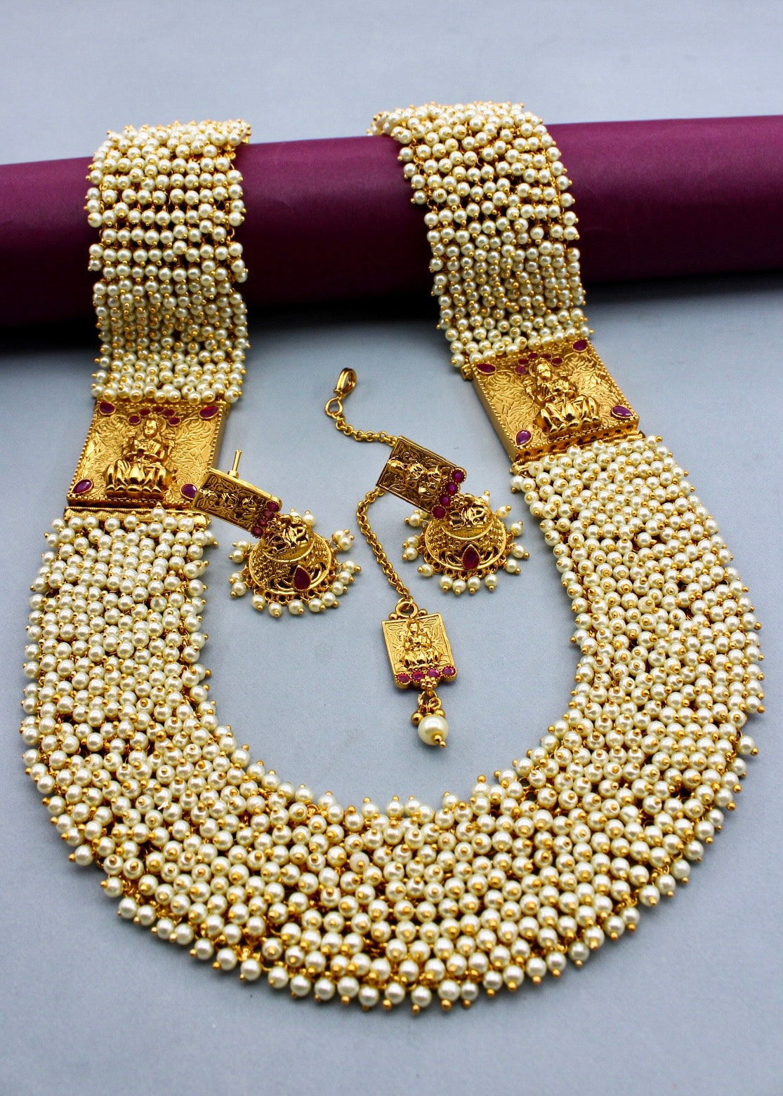 Create your different fashion statement by clubbing this pearl beads necklace set with your occasional outfits. It is studded with pink stone and crafted from golden finish metal. It has eye-pleasing carving of Goddess Laxmi on metal surface. It is easy to wear and comfortable to hold all day long.