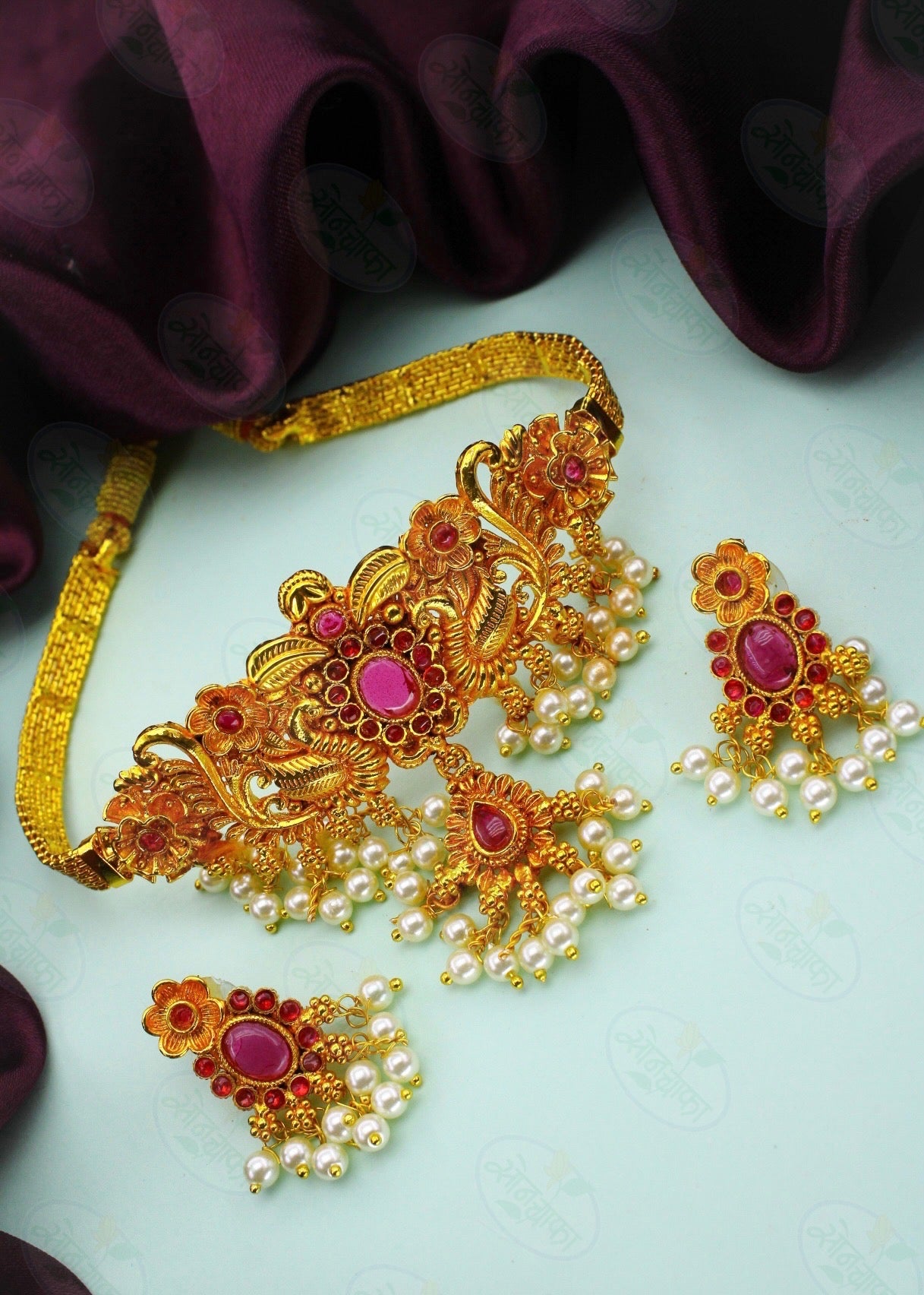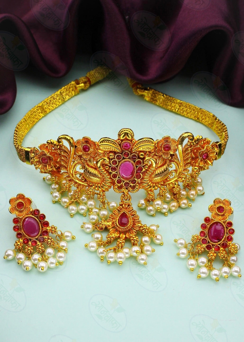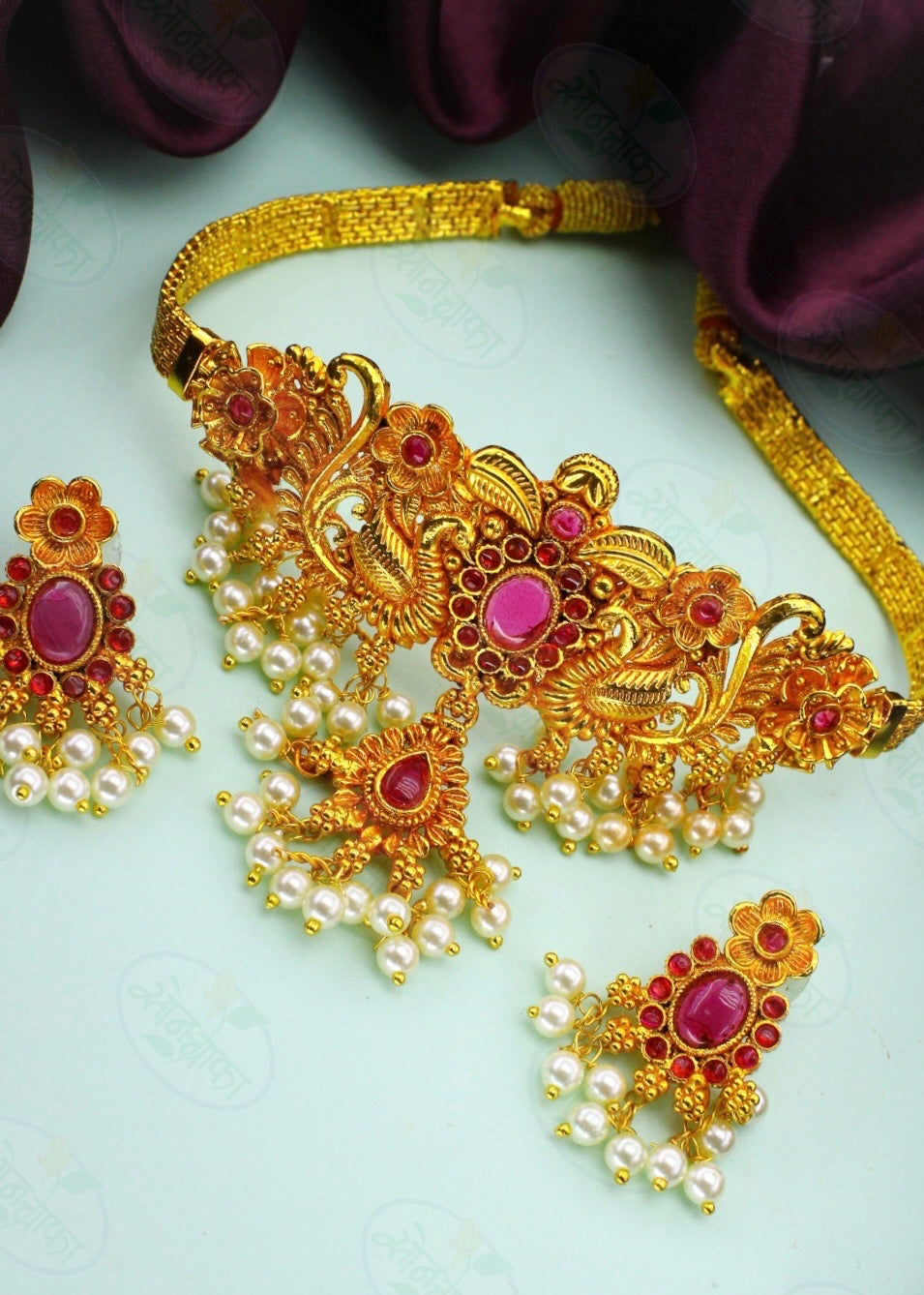 Sonchafa Jewellers brings this appealing choker necklace set for your pretty look. It is embedded with shiny pink stones and crafted from matte gold finish metal. It has attractive leaf carving design on metal surface. This jewellery will make you look gorgeous and turns many heads towards you.