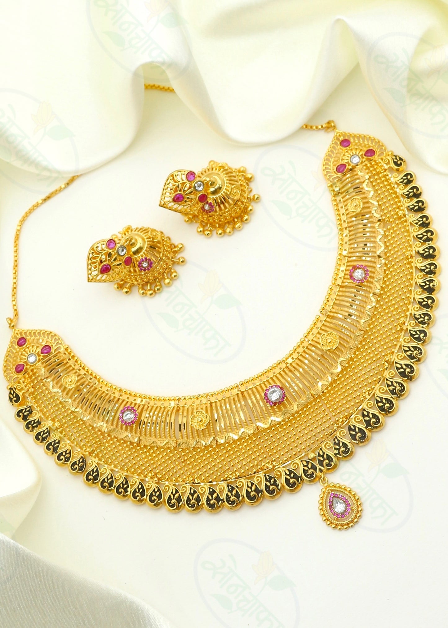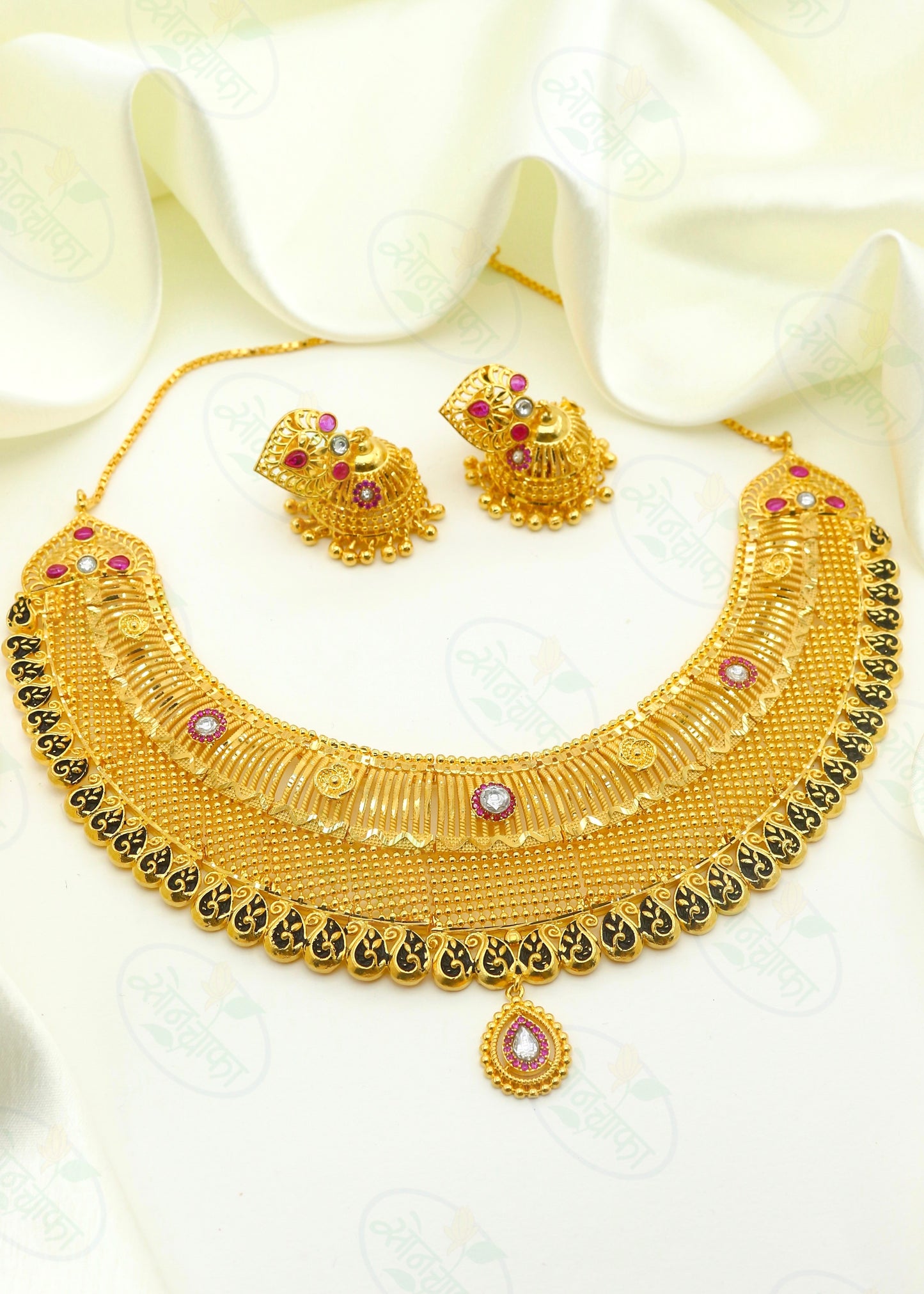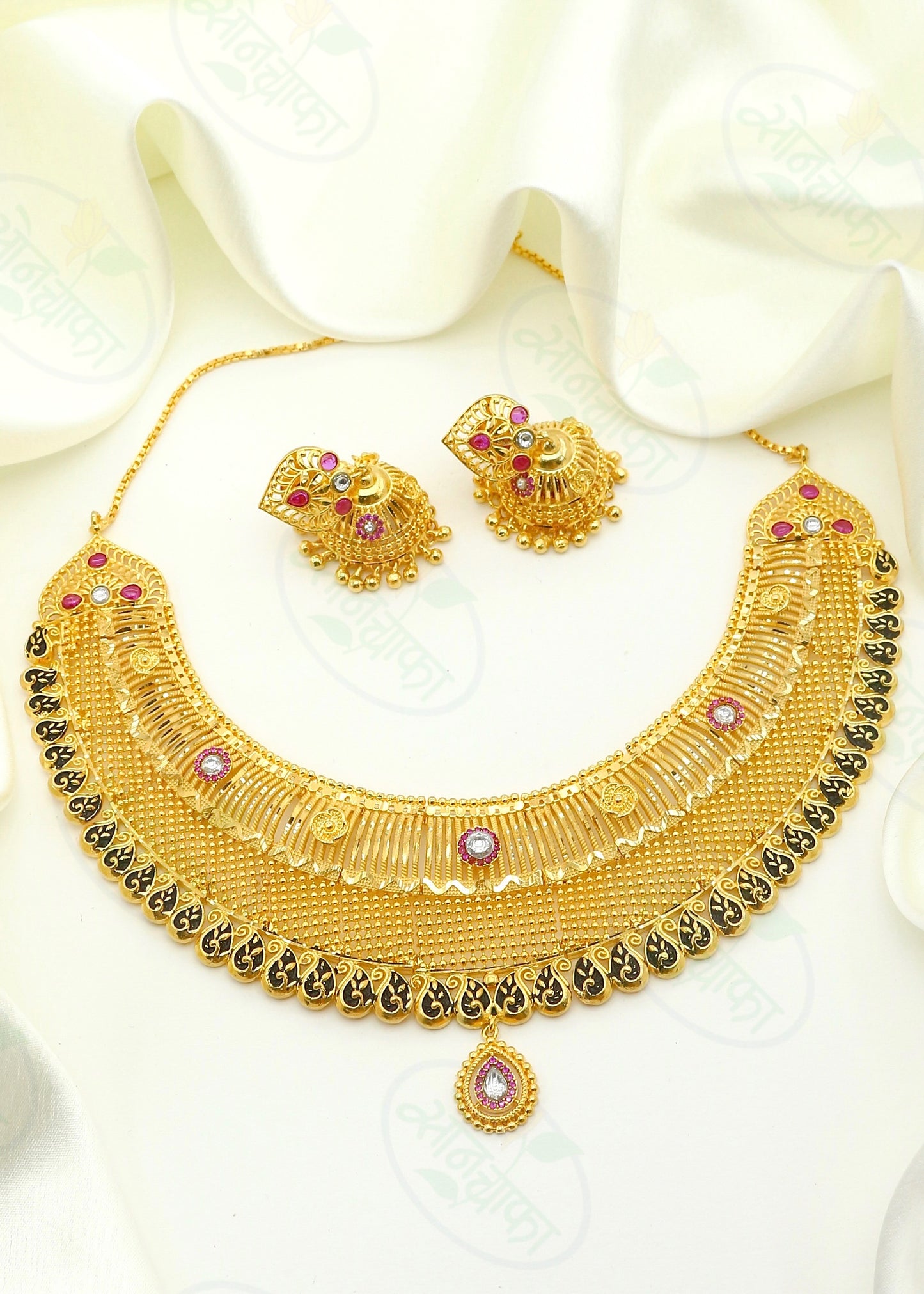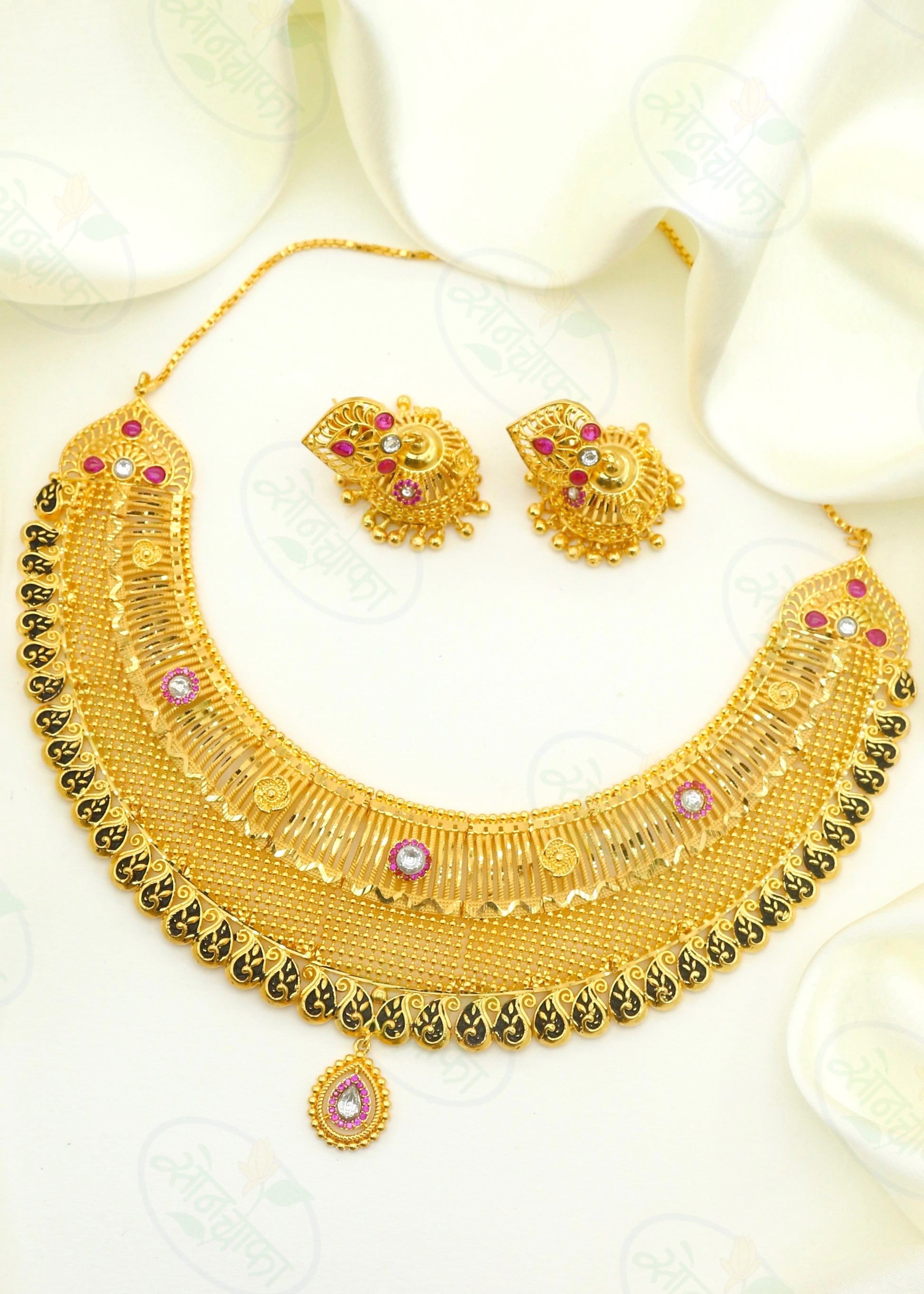 Adorn your neckline with this designer 1 gram gold plated short necklace which is perfect blend of class and elegance. It is embedded with gold stone along with wonderfully intricate design made from gold finish metal. This designer necklace set will fetch you lots of compliments from onlookers for your amazing choice.