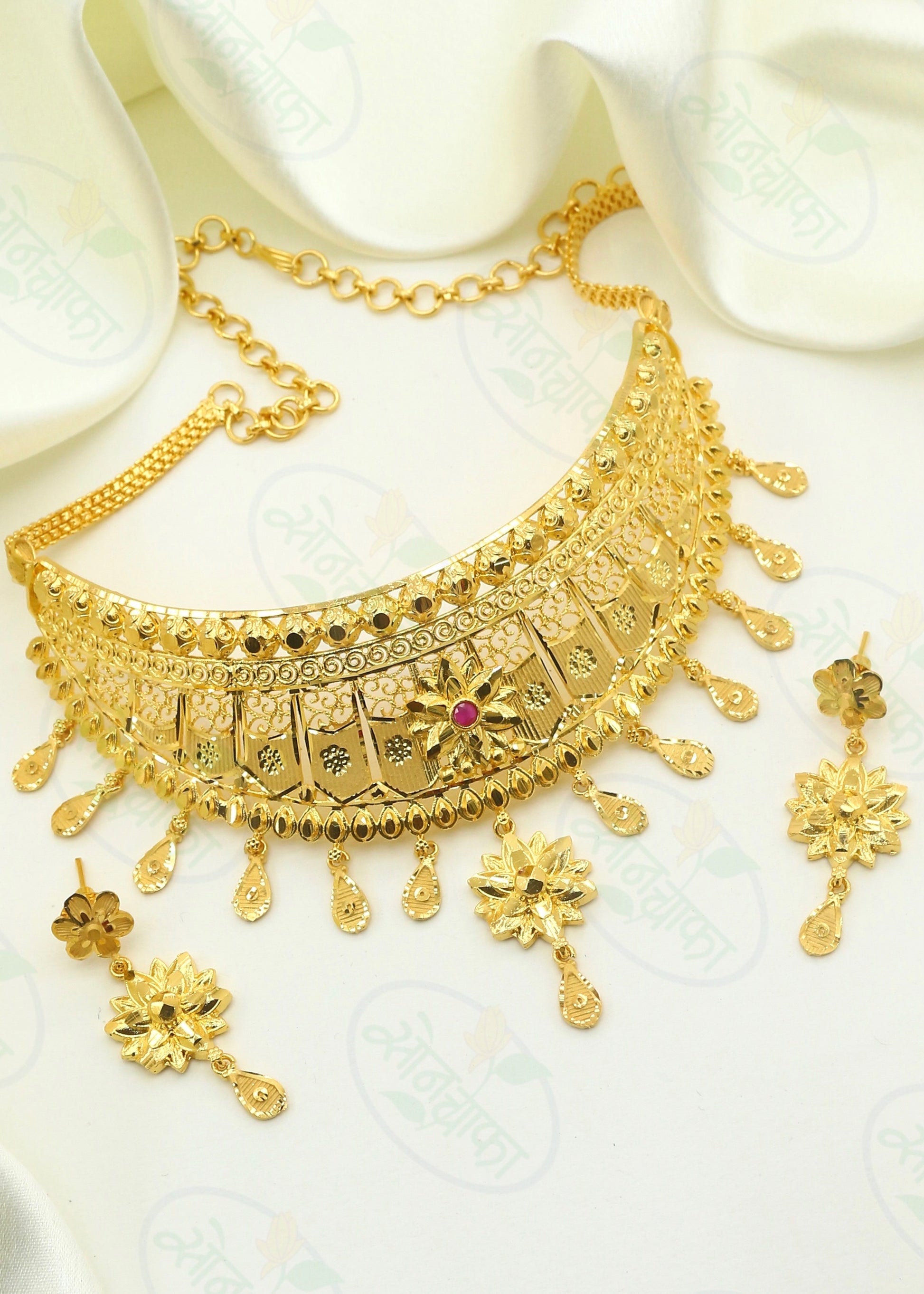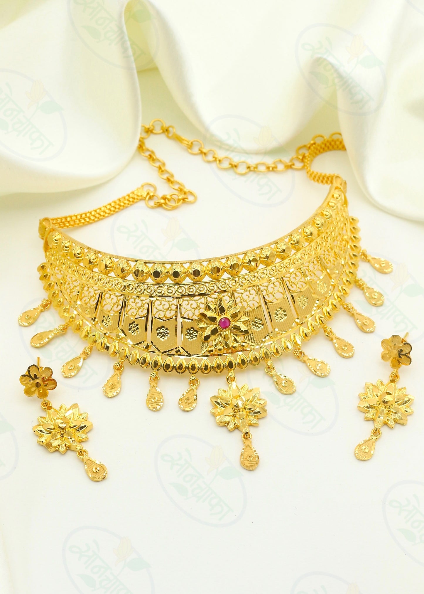 Beautiful gold plated delicate gold plated choker from Sonchafa Jewellery. This fancy necklace made from 1 gram gold plated metal along with golden bead hanging drop. This beautiful necklace easy to wear.