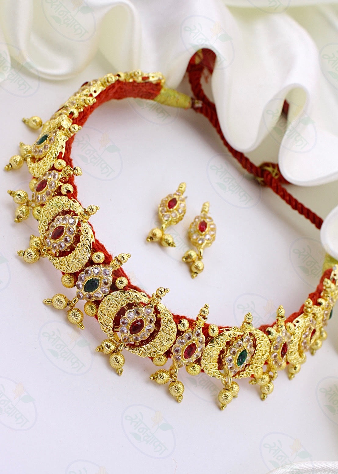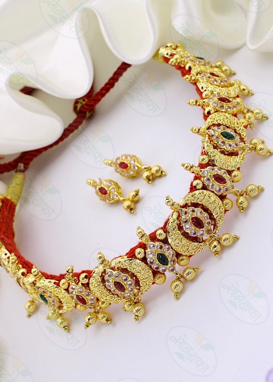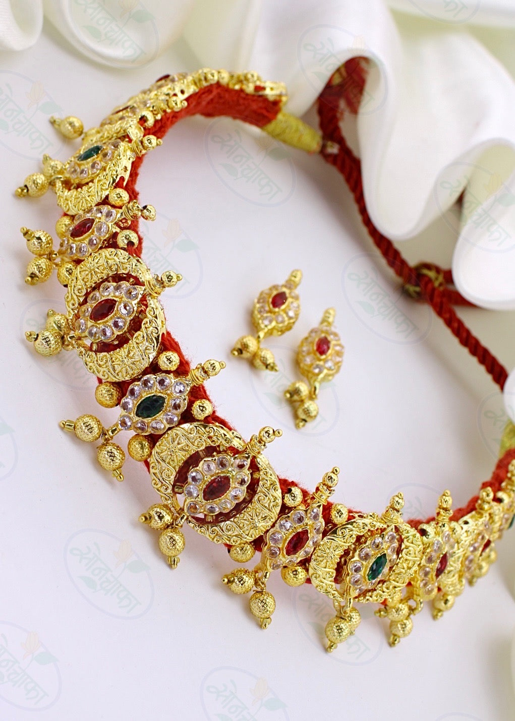 Must have in your Maharashtrian jewellery collection this golden colour beautiful thushi necklace from Sonchafa Jewellery. The pendant is studded with pink, green, white stone and woven with golden beads. This choker necklace comes with adjustable dori, that you can fit it properly.