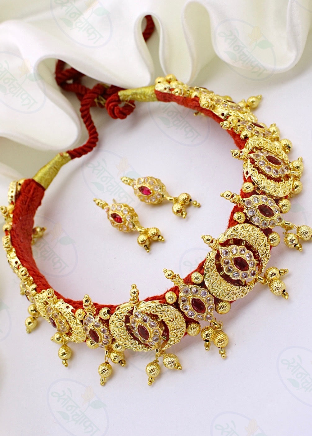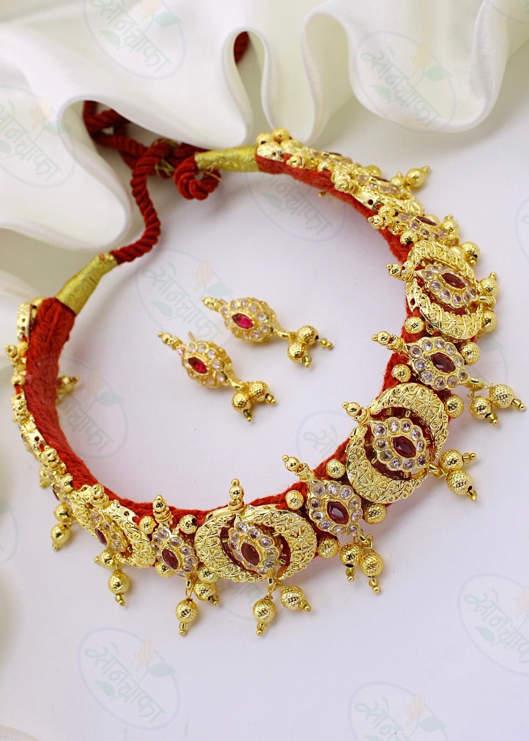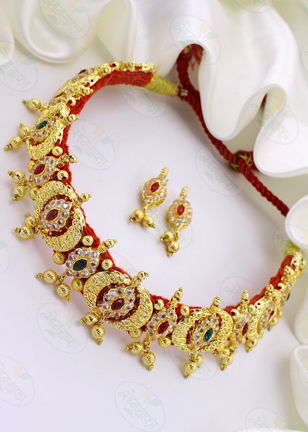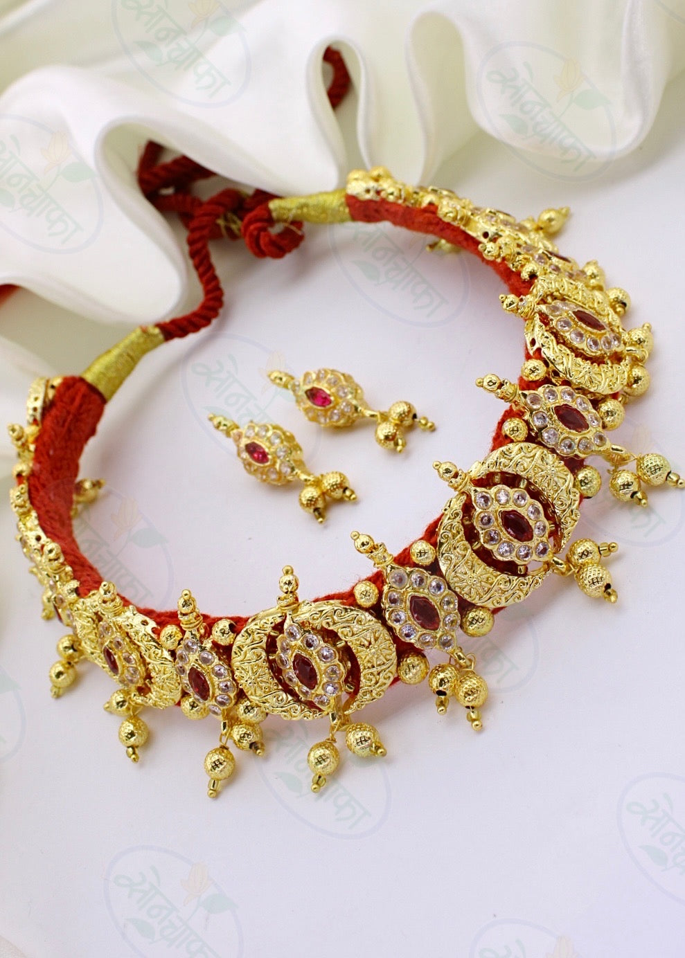 Must have in your Maharashtrian jewellery collection this golden colour beautiful thushi necklace from Sonchafa Jewellery. The pendant is studded with pink, green, white stone and woven with golden beads. This choker necklace comes with adjustable dori, that you can fit it properly.