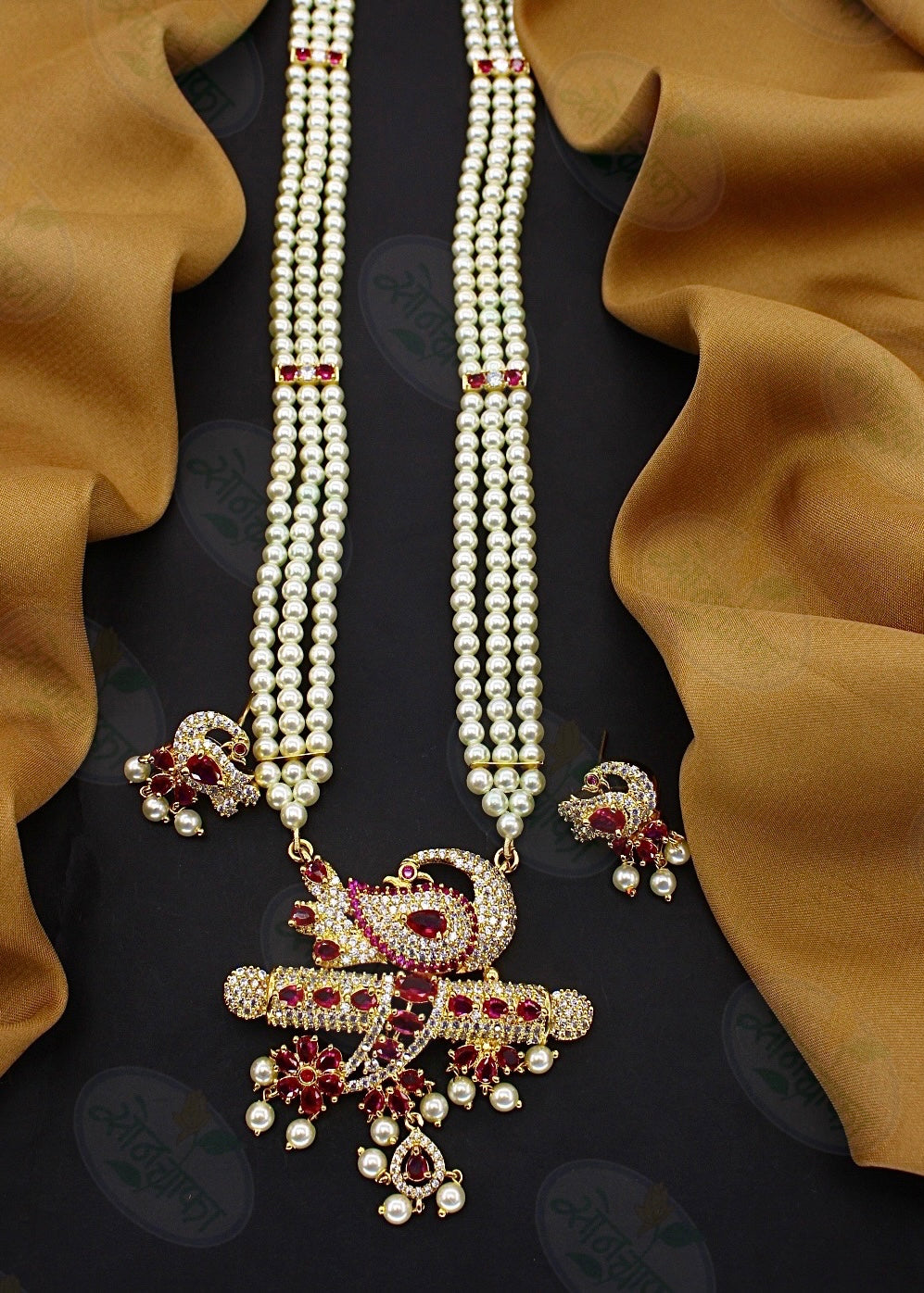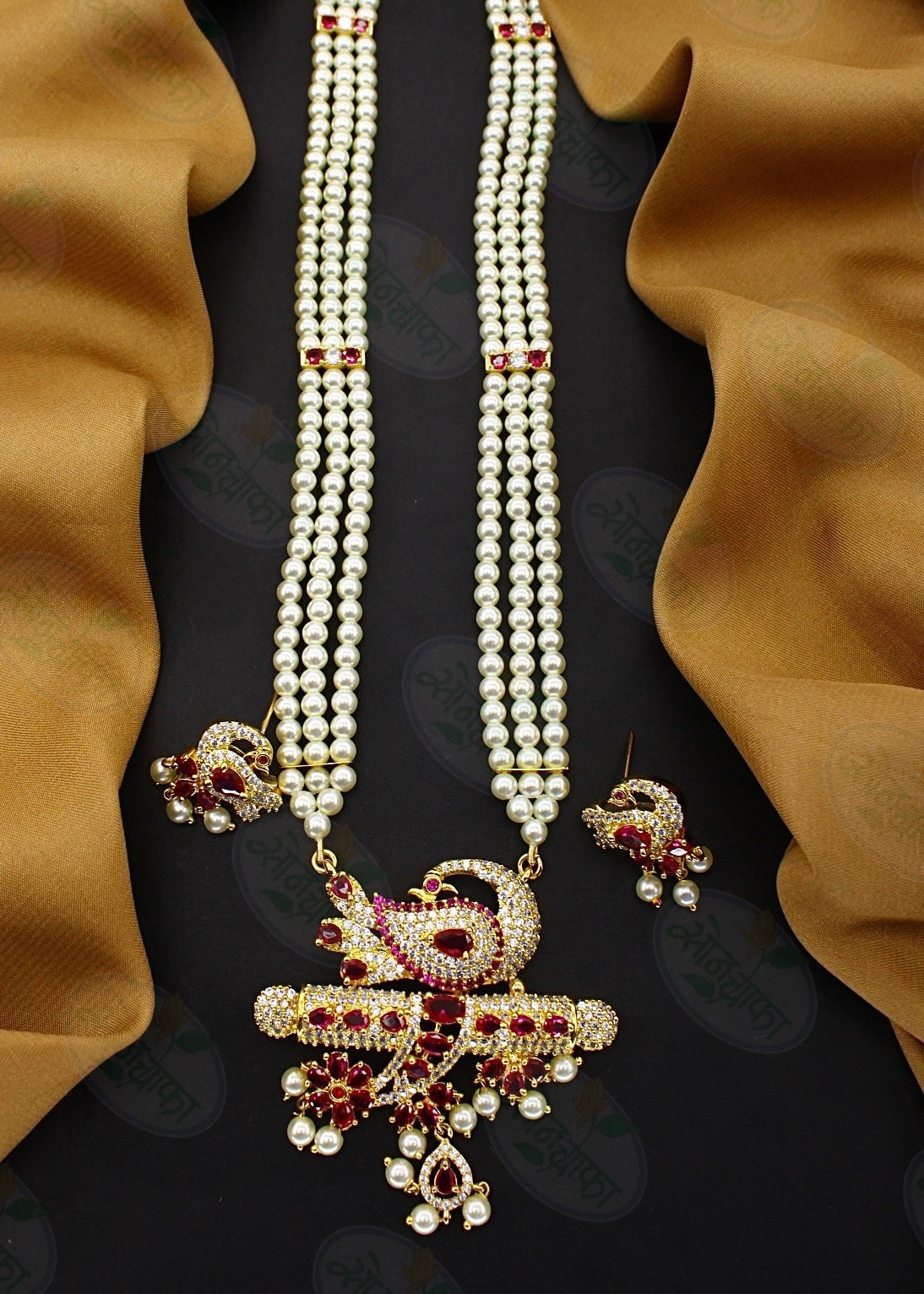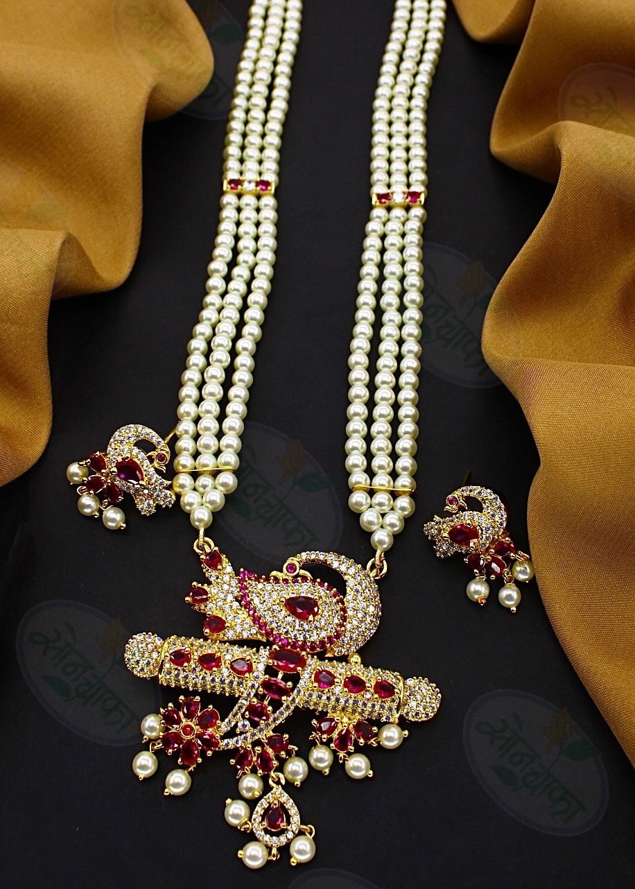 Graceful peacock designer necklace encrusted with pink, white stone along with pearl beads long necklace for girl or women online latest design from Sonchafa Jewellery. It is made up of golden finish metal.