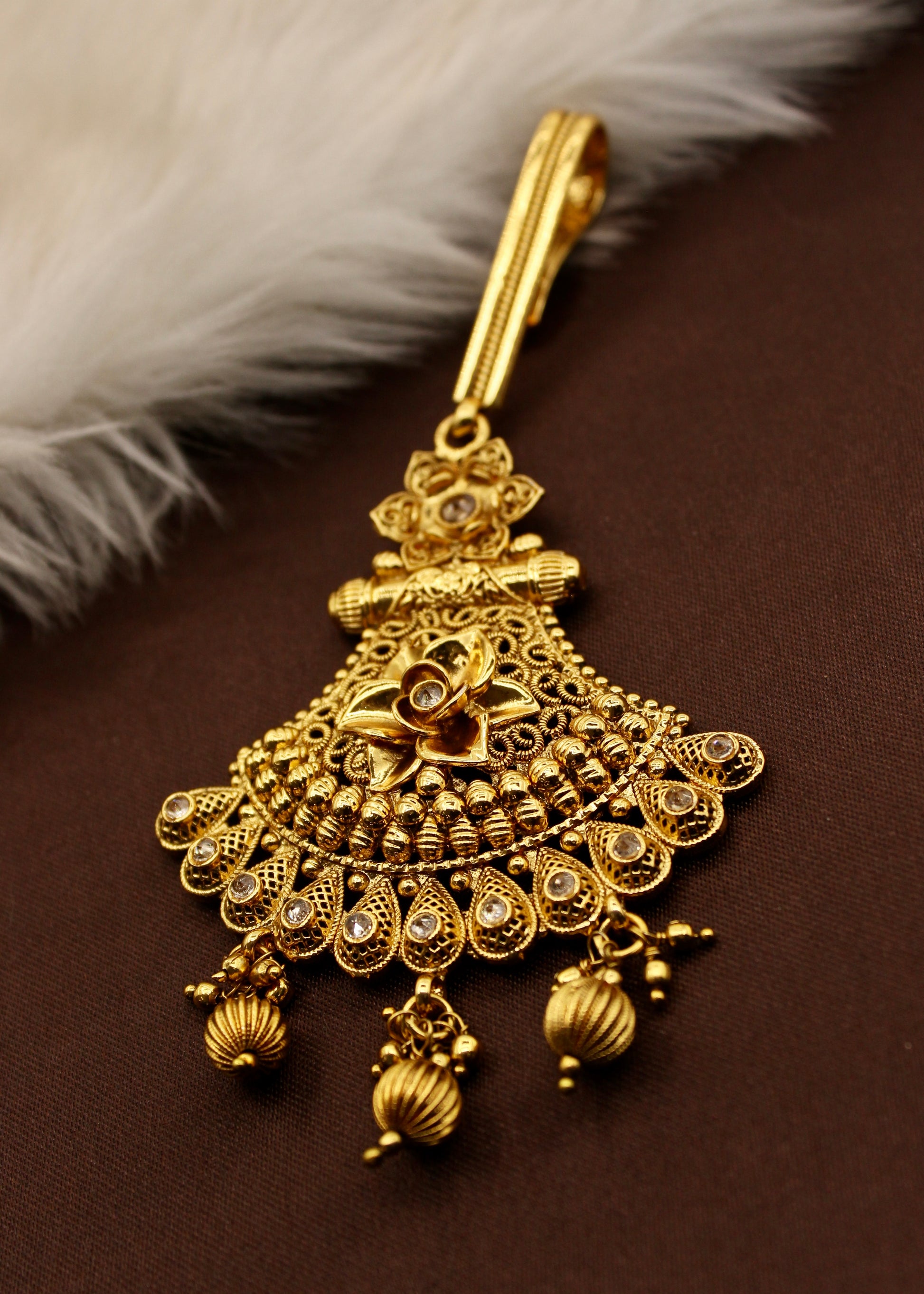 Look stylish by adorning this floral designer Traditional challa which is perfect for your classy look. It is embedded with pink, white stone and made from antique gold finish metal. It has dangling golden, red beads for more stylish look. It is superior in quality and will retain its shine for years to come.