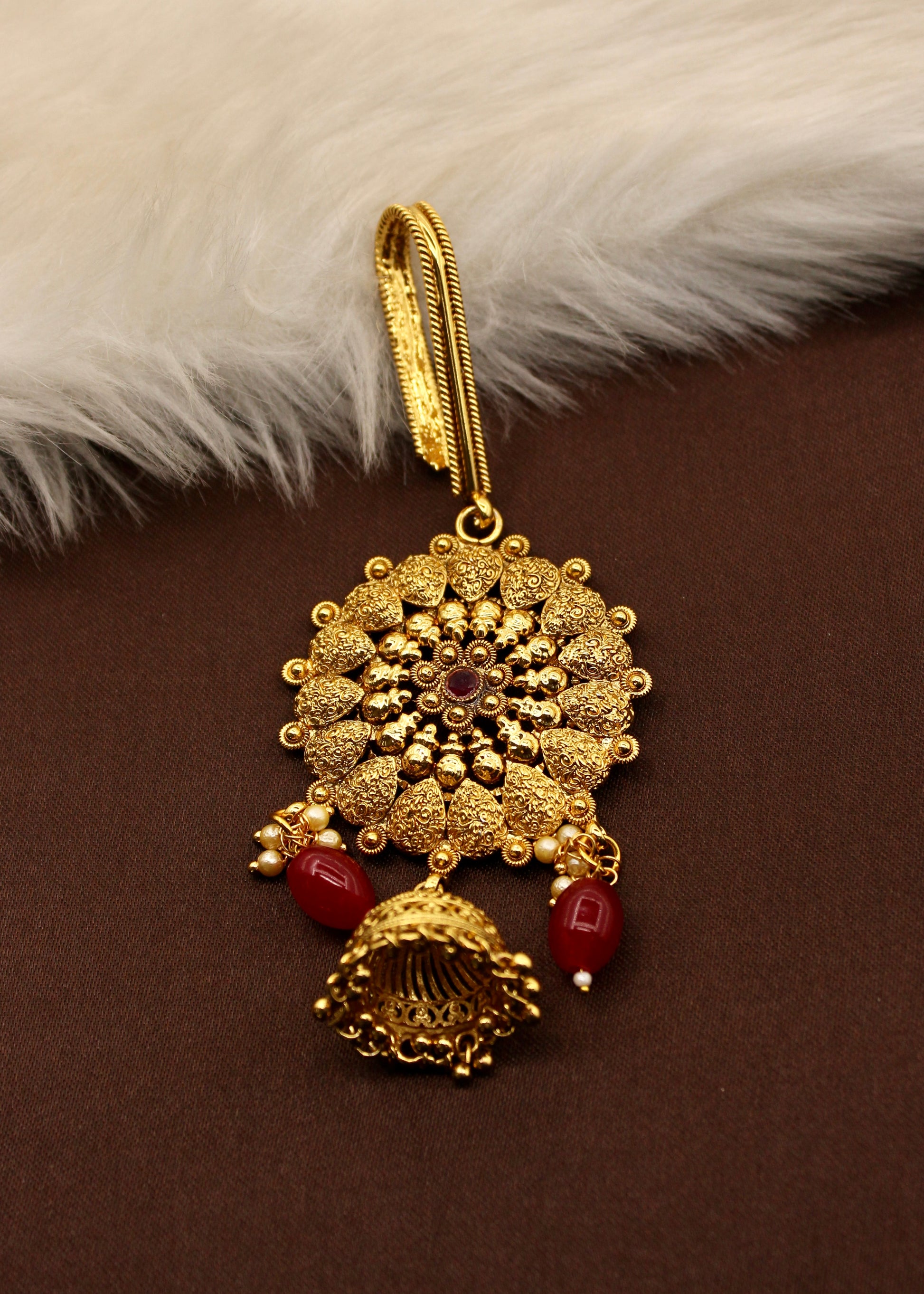 Adorn your jewellery collection with this designer challa with your festive saree and get that perfect look. It is studded with pink, white stone along with red, green beads and made from antique golden finish metal. This challa is decorated with jhumka design for more attraction.