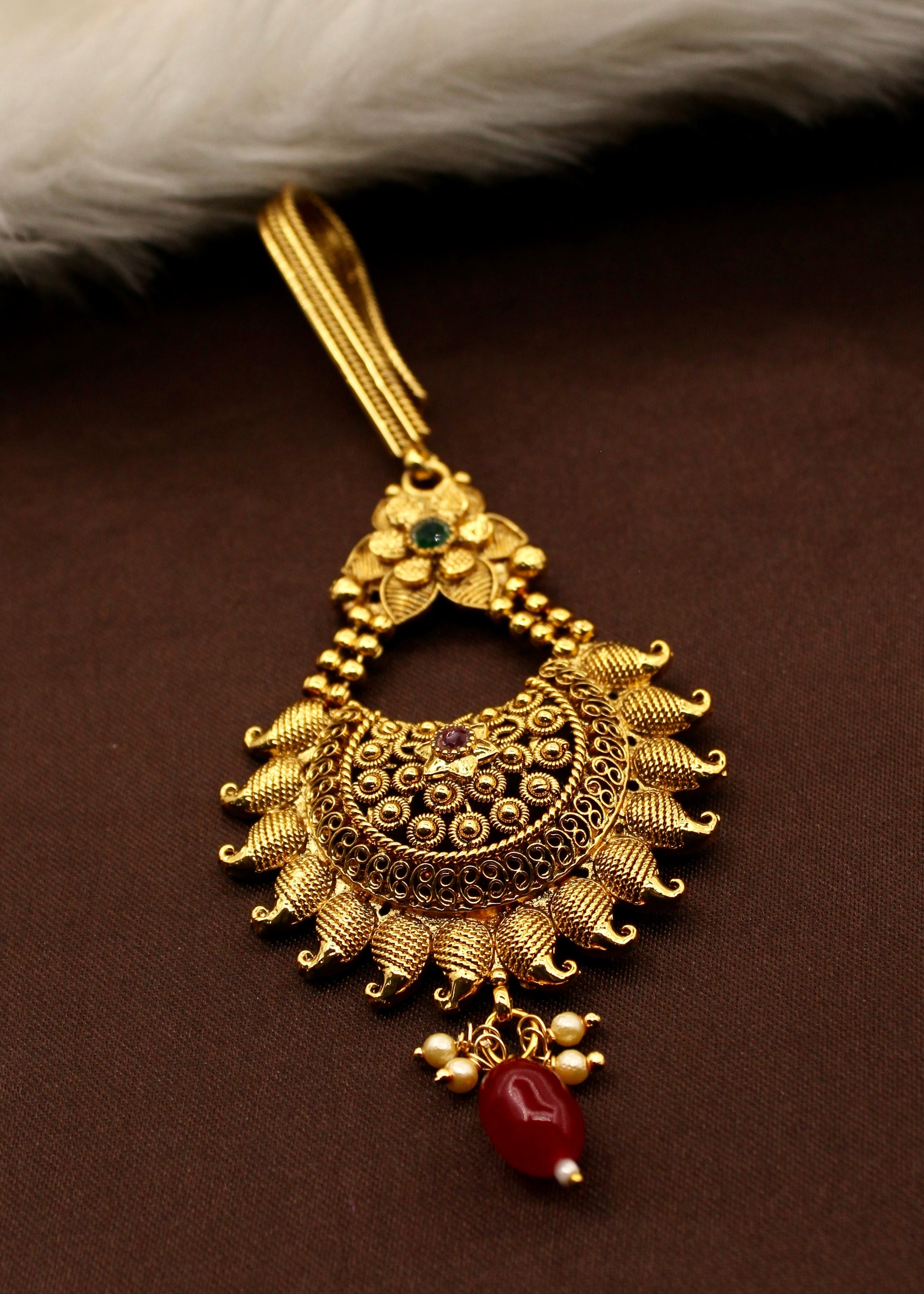 Sonchafa Jewellers brings this appealing floral designer Challa which is completely different from other. It is embedded with shiny pink, green, white stones and crafted from antique gold finish metal. This challa feature eye-pleasing decoration. This jewellery will make you look gorgeous and turns many heads towards you.