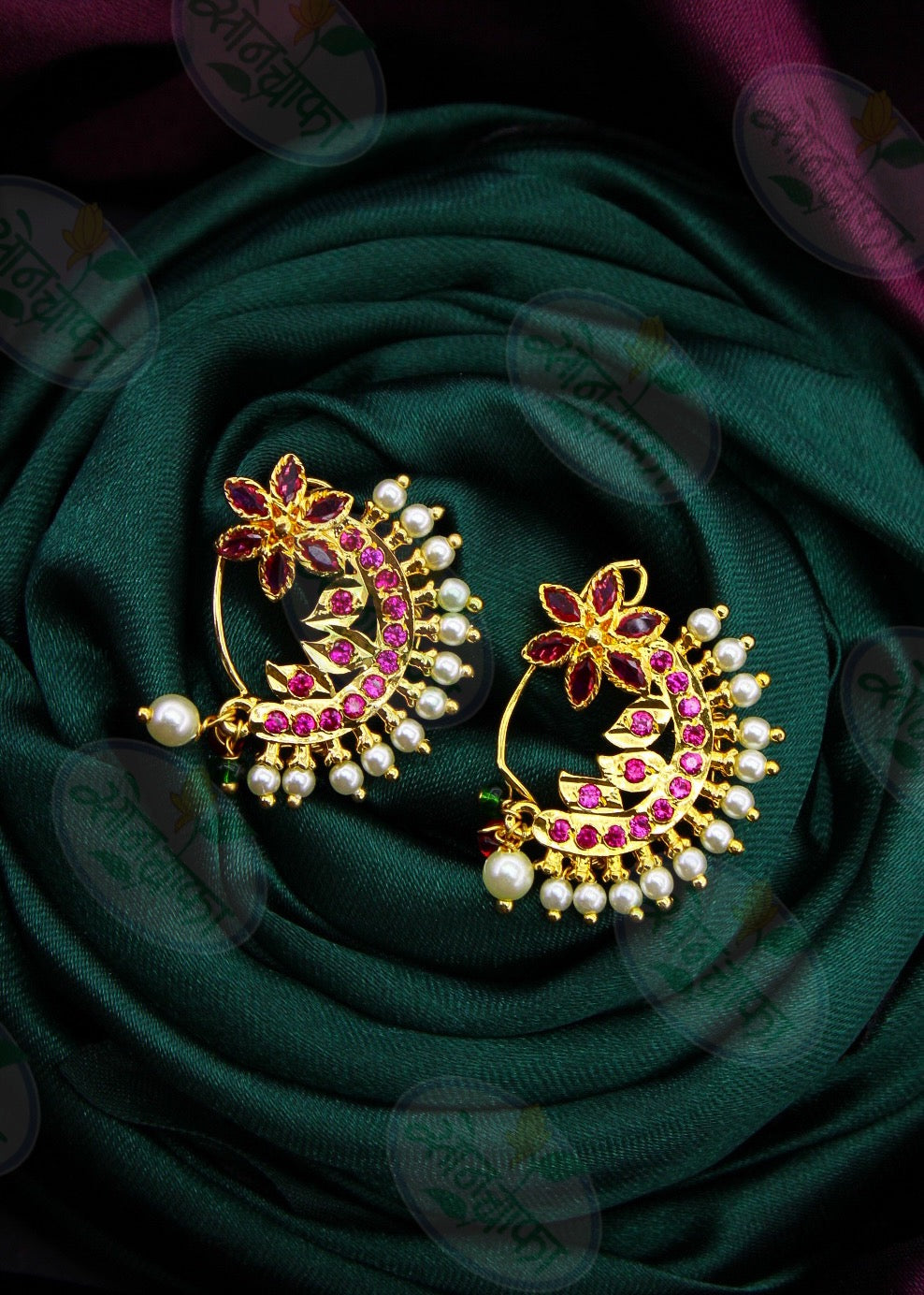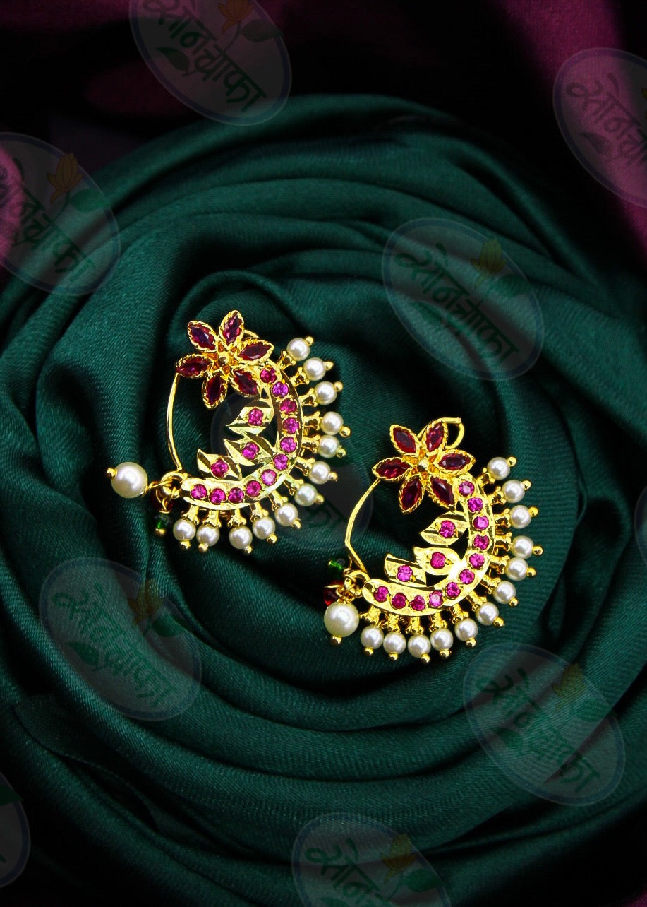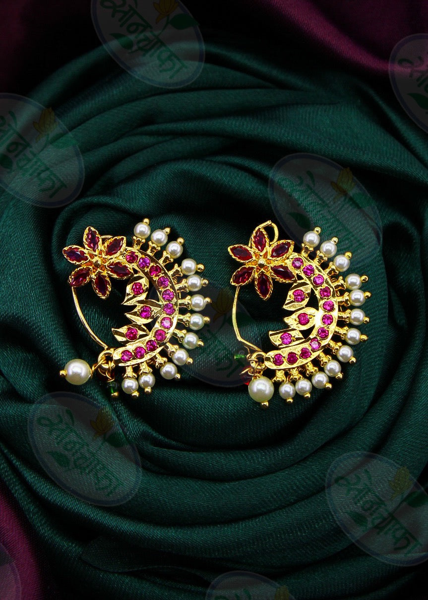 Pink colour adorable floral designer nath from Sonchafa Jewellery will appeal to you at very first look. It is encrusted with pink colour stones fashion from golden finish metal. It has pearl droplets for more addition. This nath is easy to wear and press o
