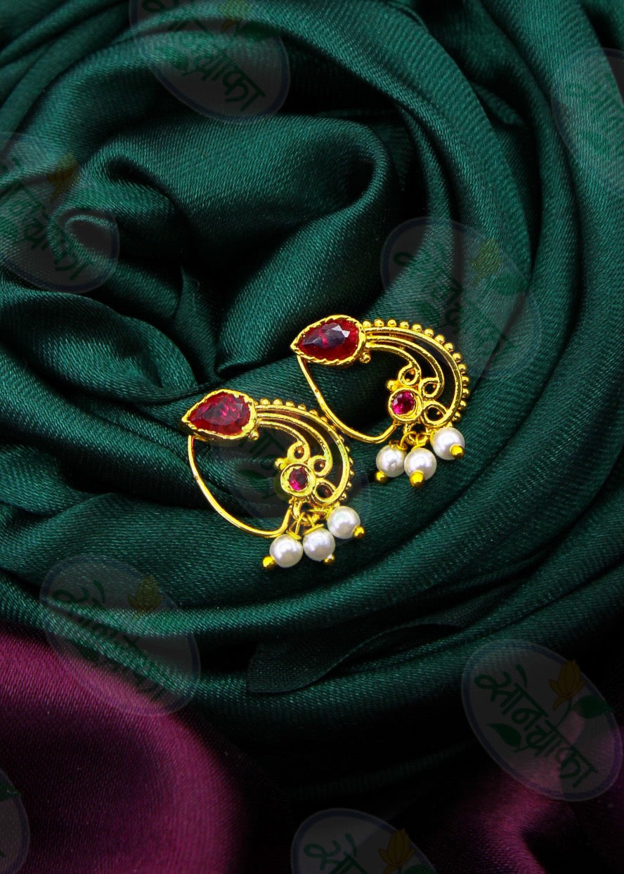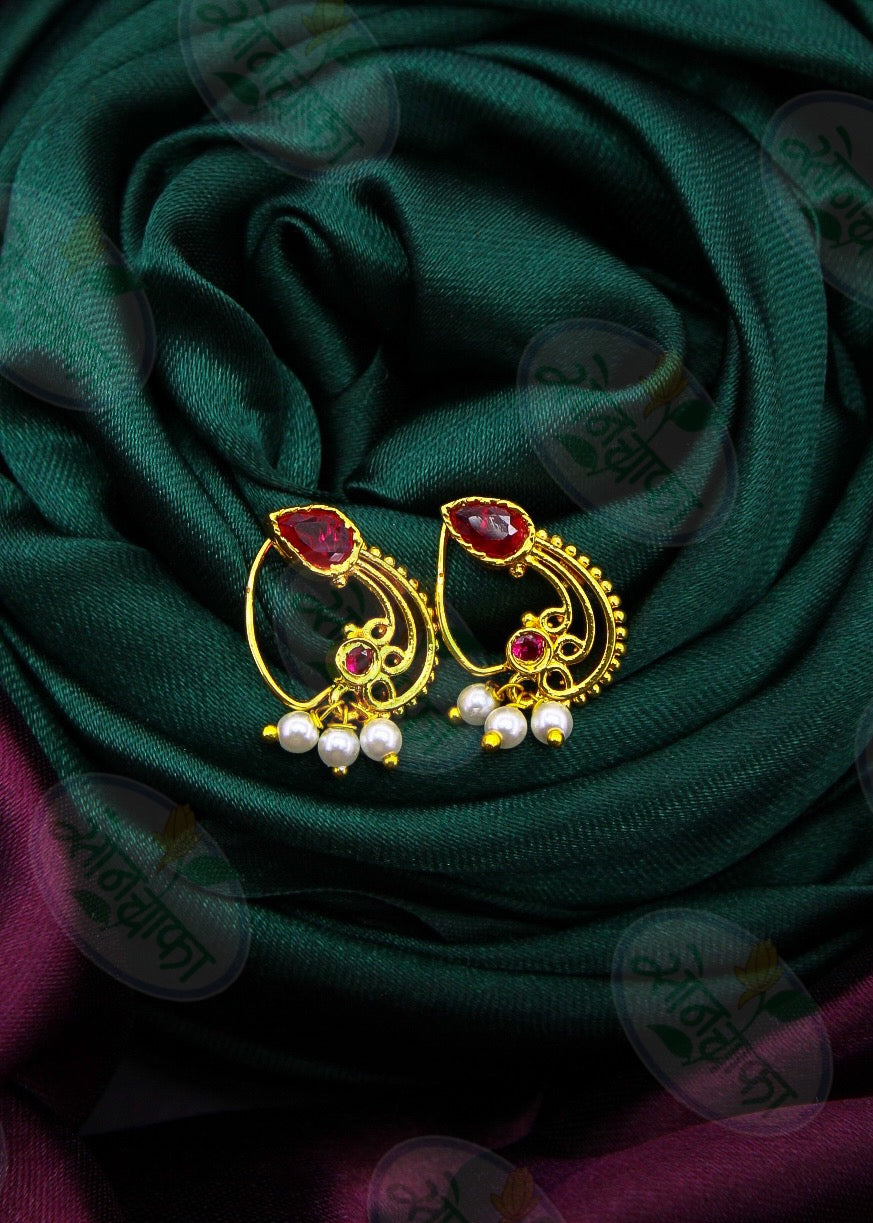 Sonchafa jewellers presents this adorable nath is perfect suitable for your stylish look. It is encrusted with studded pink stone and made from golden finish metal along with pearl beads. This nath is woven with good quality pearl beads & easy to wear.