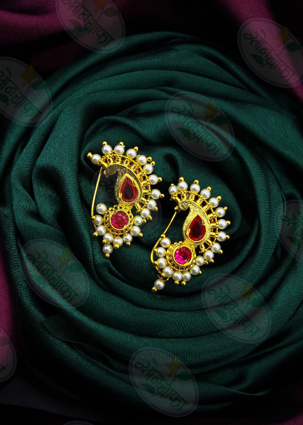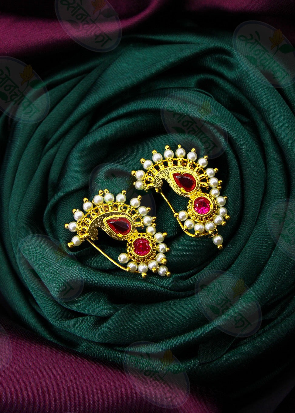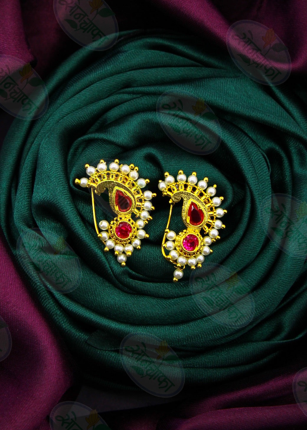 Simple & Stylish adorable Maharashtrian Nath from Sonchafa jewellery it is perfect suitable for saree or traditional outfits. It is styled with studded pink and white colour stone and made from golden finish metal. This nath is woven with good quality pearls beads & easy to wear nath.