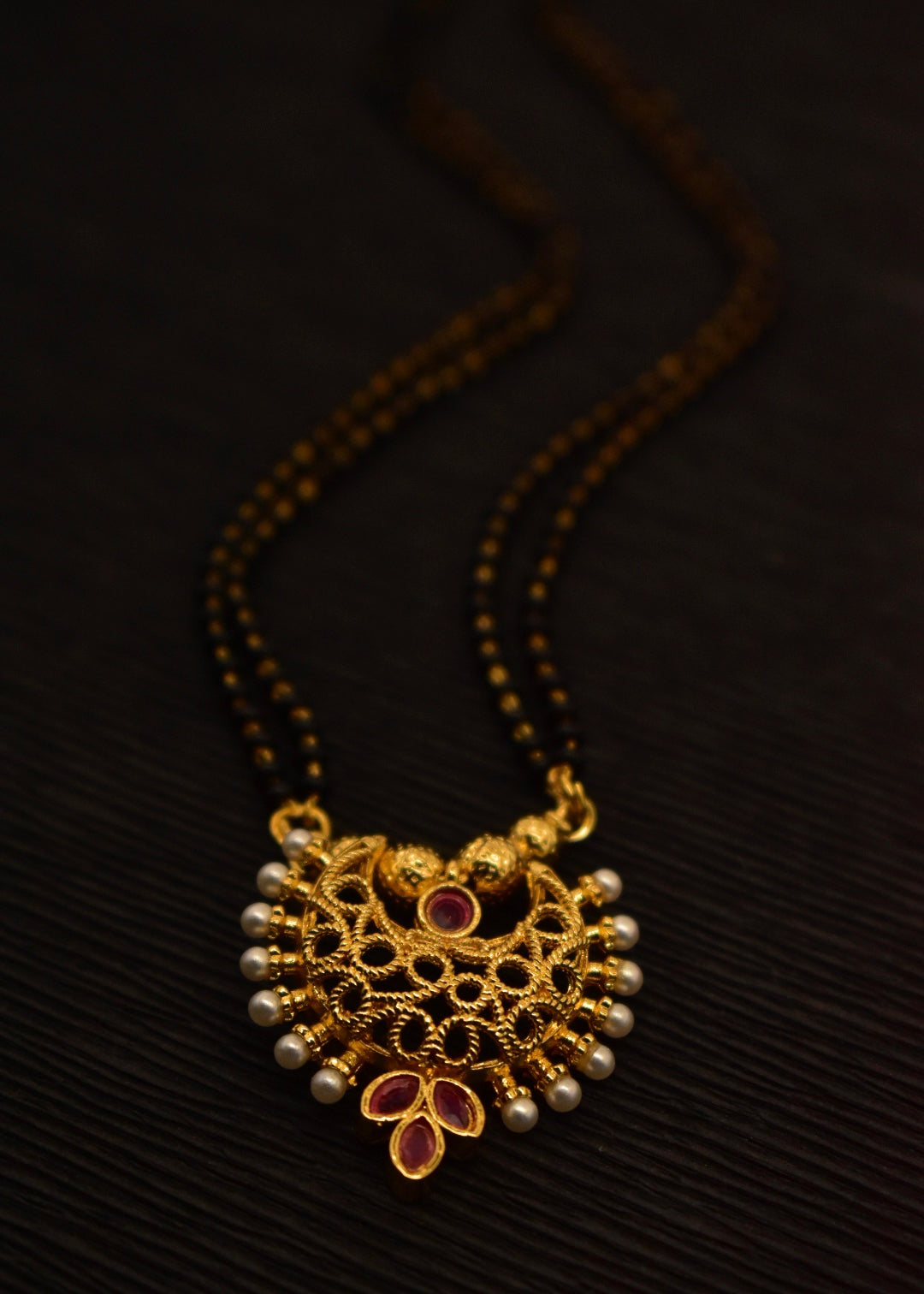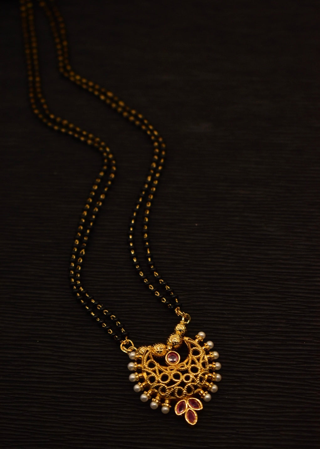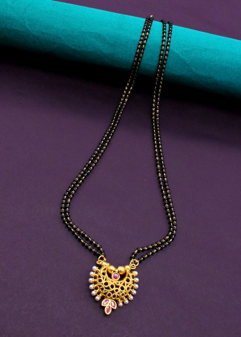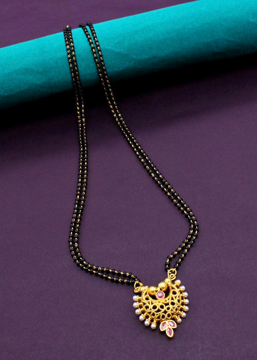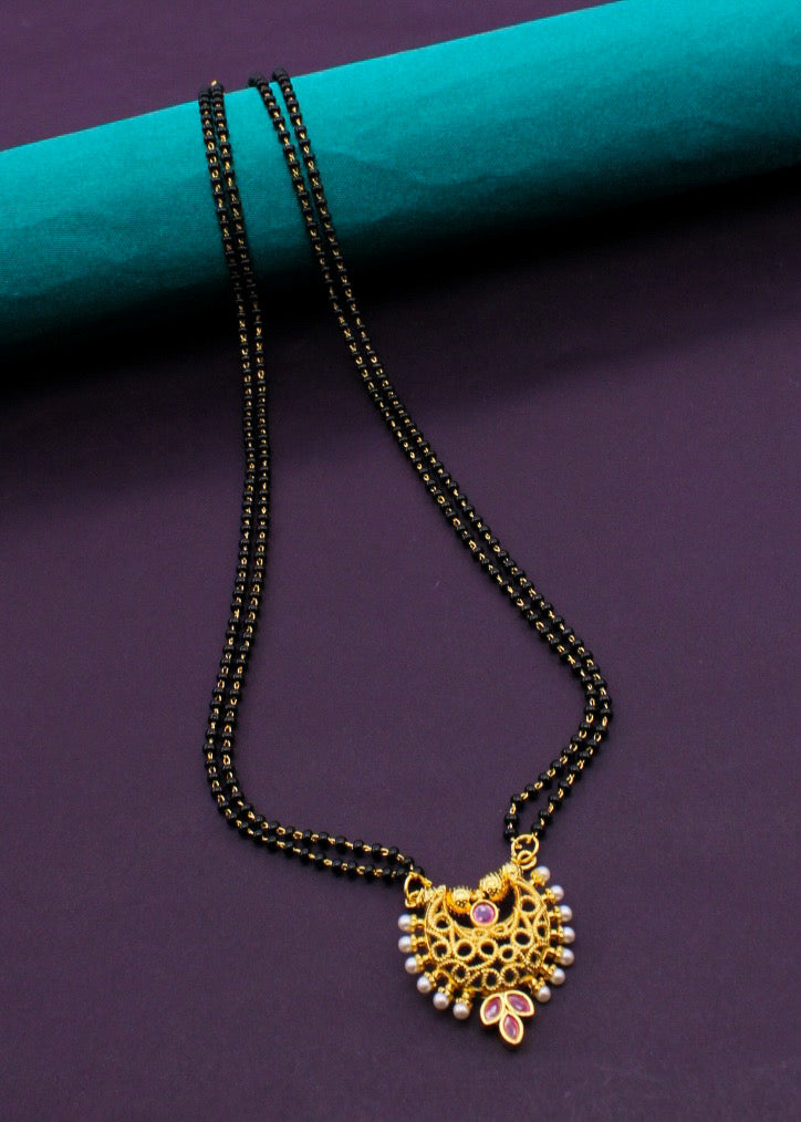Sonchafa Jewellery brings to you this graceful mangalsutra in stylish look. It is decked with classy pink stone and feature wonderful floral design. In addition this golden finish mangalsutra is woven with black beads. It is superior in quality and enhance your look.