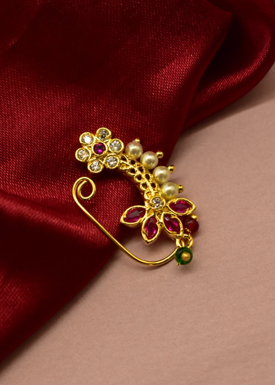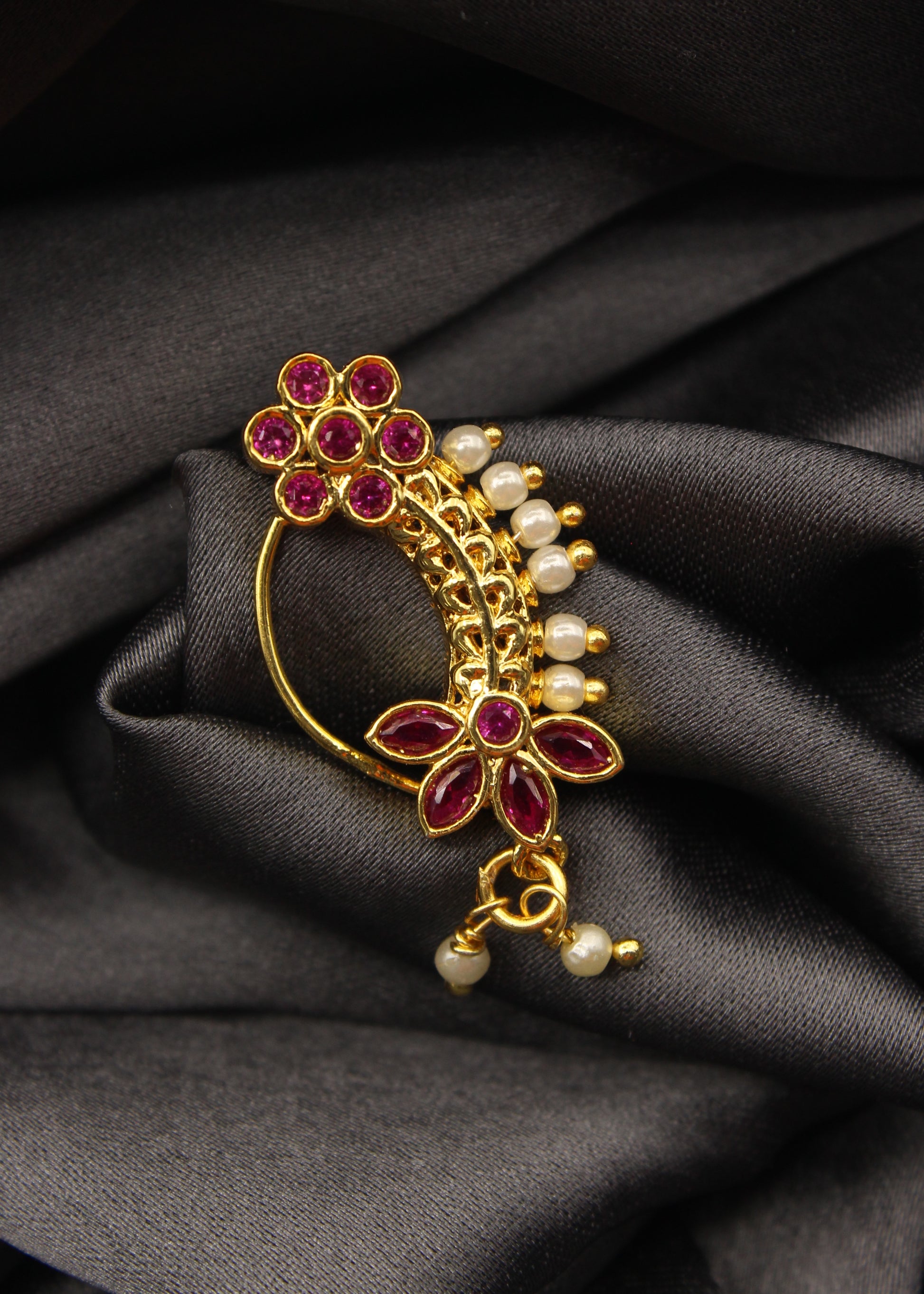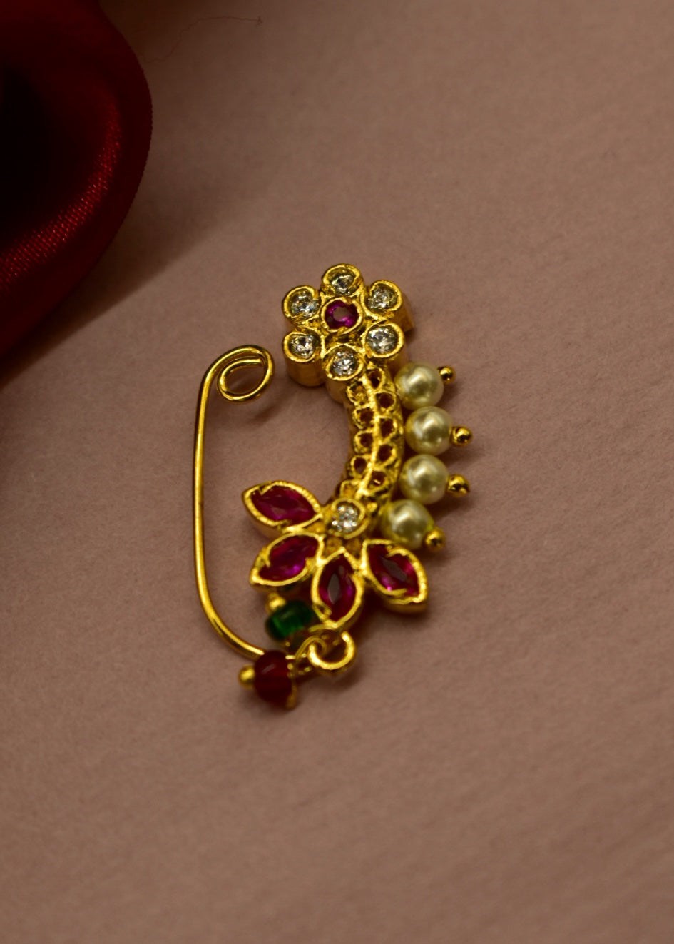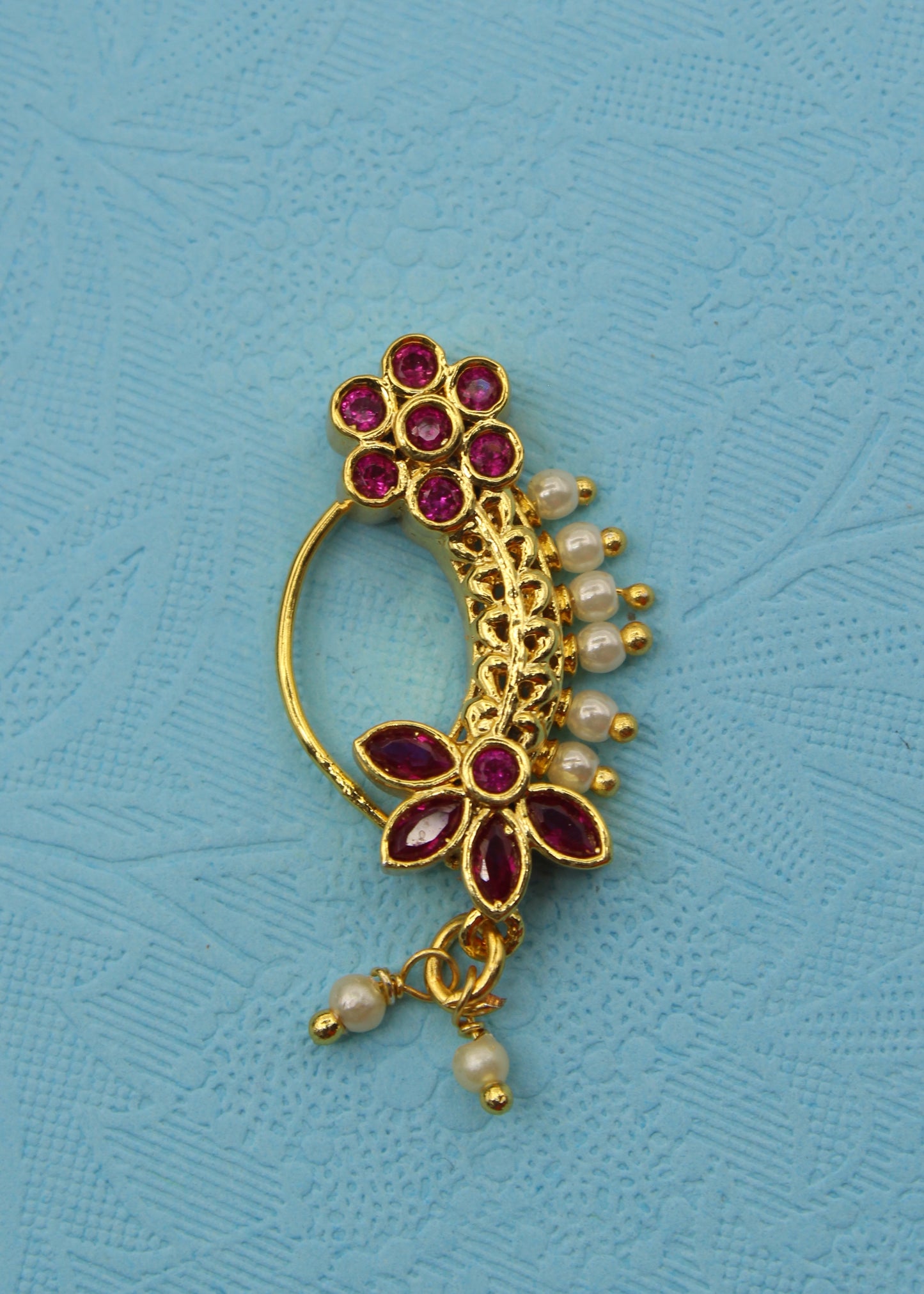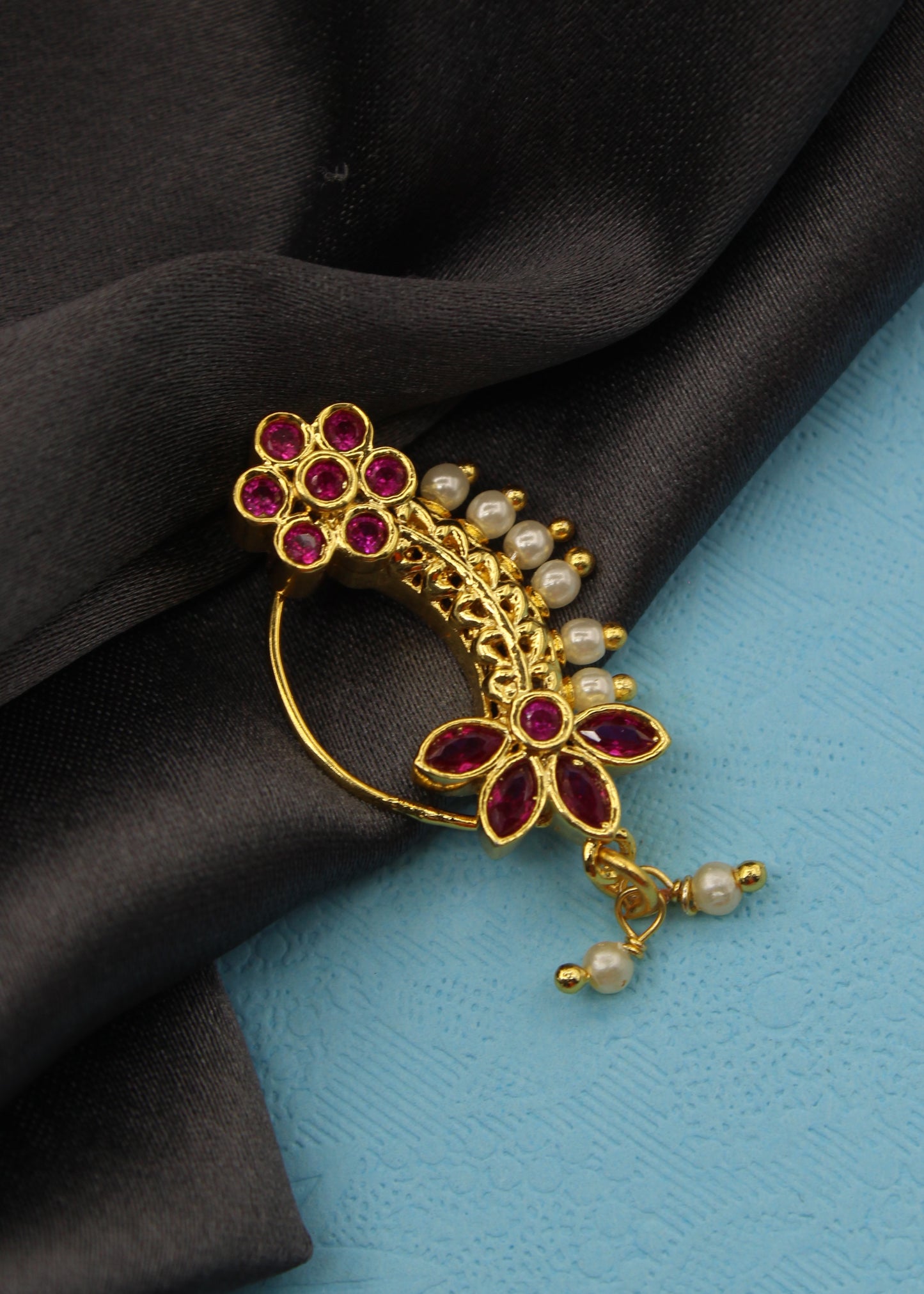Adorn your nose with this golden colour Floral nath which would help you to get that perfect traditional look. It is decked with pink, white colour stone and woven with pearl beads. This nath is made from golden finish metal and requires piercing.