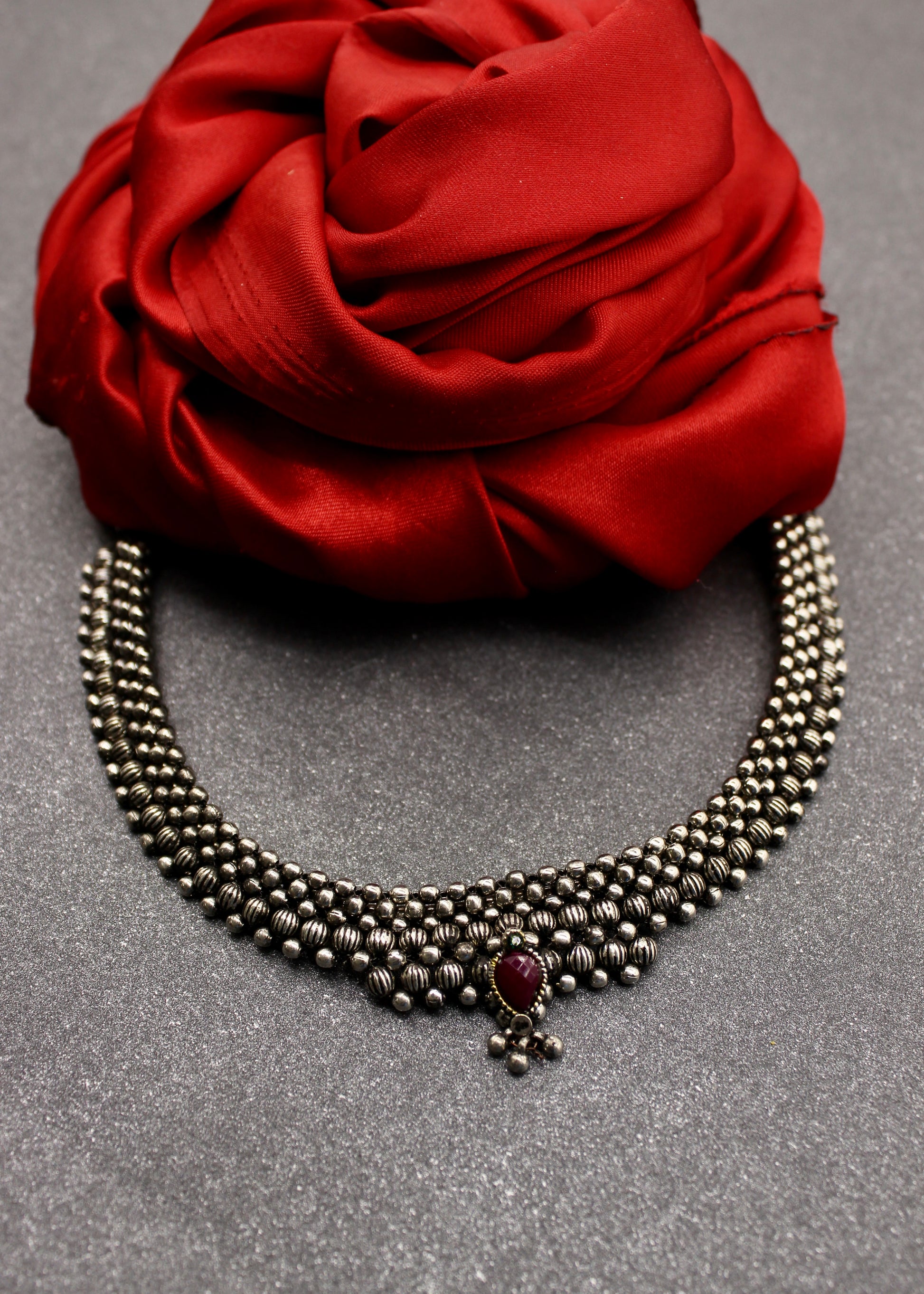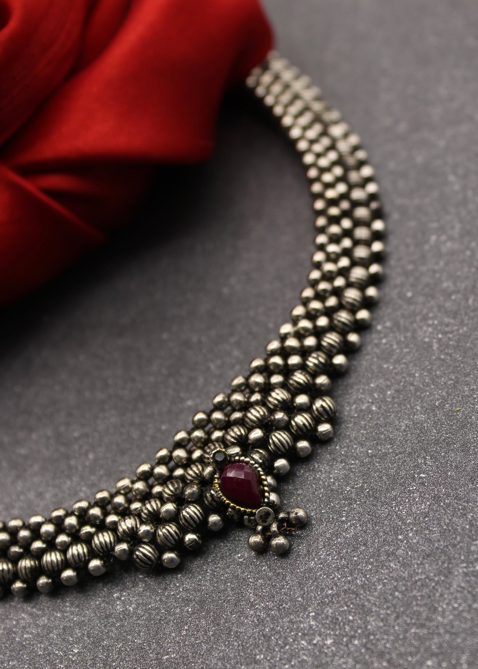 Add extra style and elegance to your persona by clubbing this designer necklace with your festive costume. It is studded with pink, green stone along with oxidised beads and crafted from oxidised finish metal. It is superior in quality and comfortable to hold all day long.