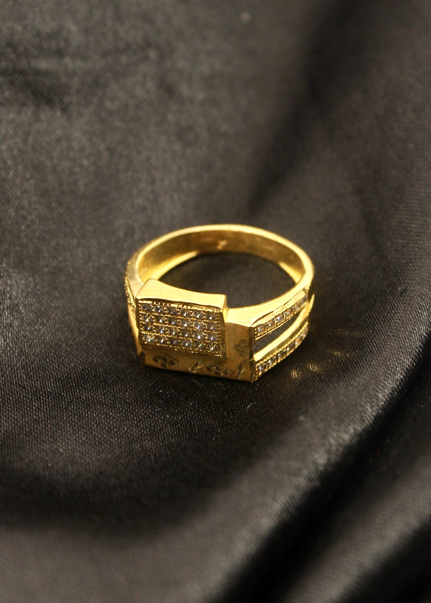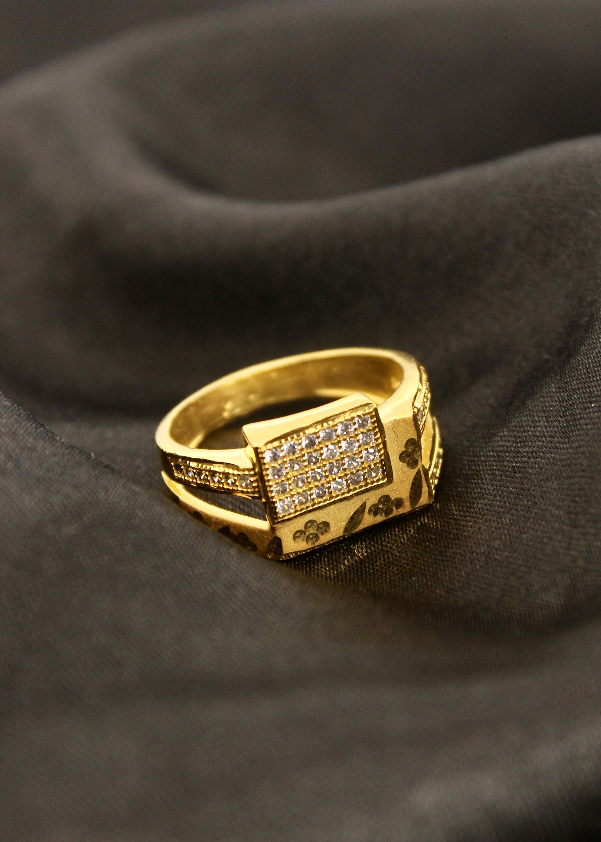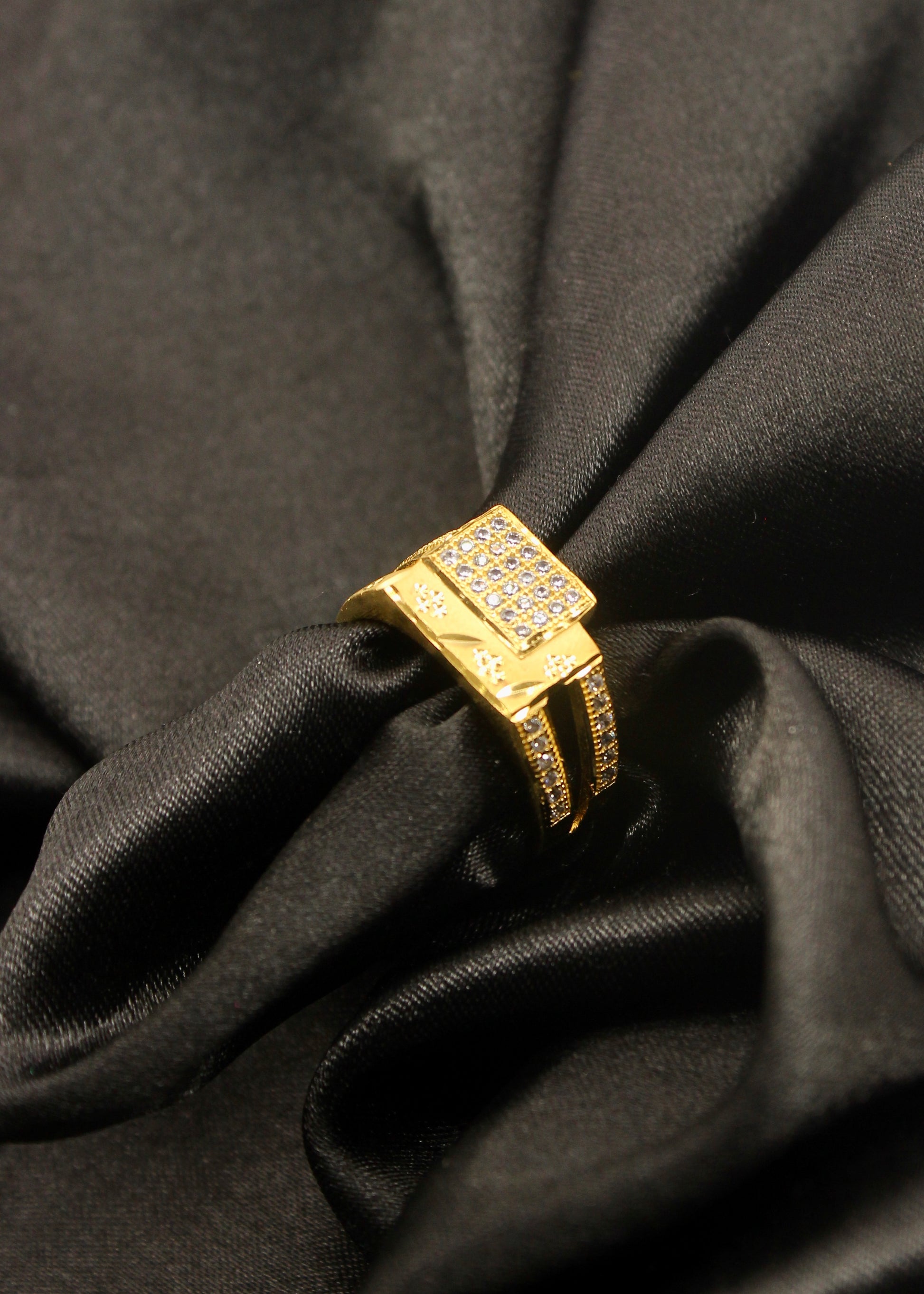 White stone Square designer stylish gold plated finger ring for men's by Sonchafa Jewellery. This feature eye-pleasing carving square design on metal surface. It is encrusted with white stone and made from 1 gram gold plated highly durable metal.